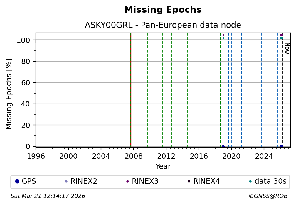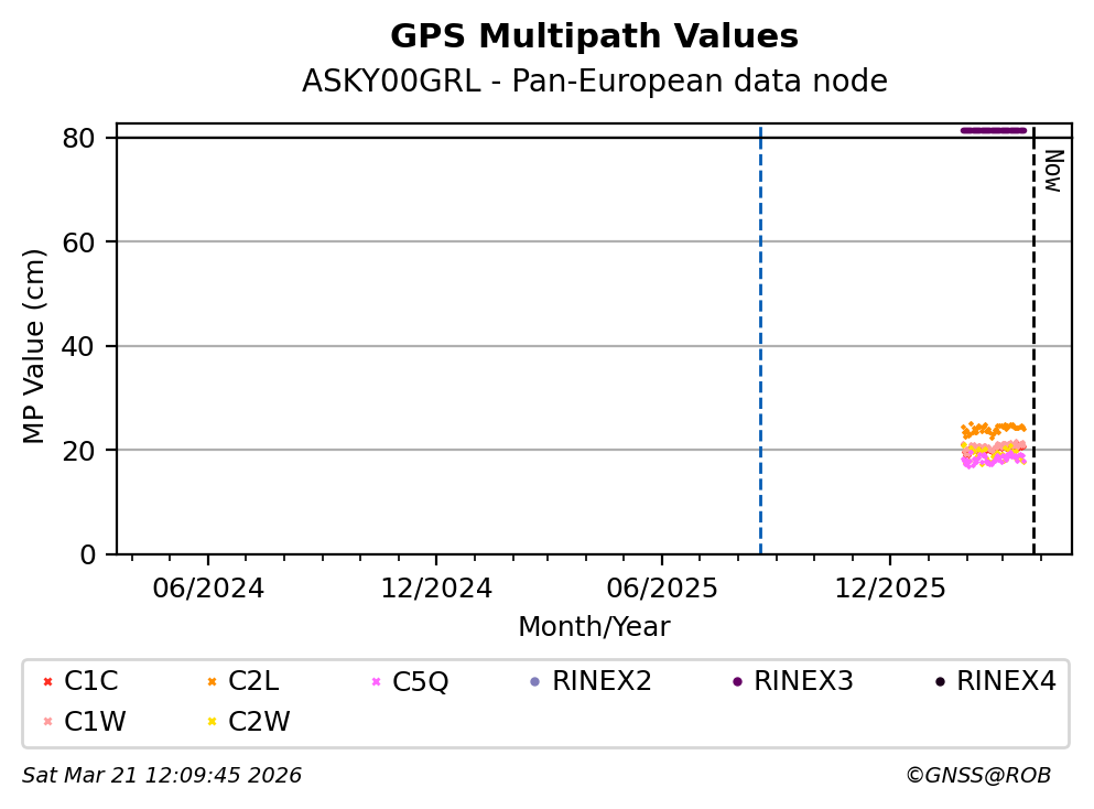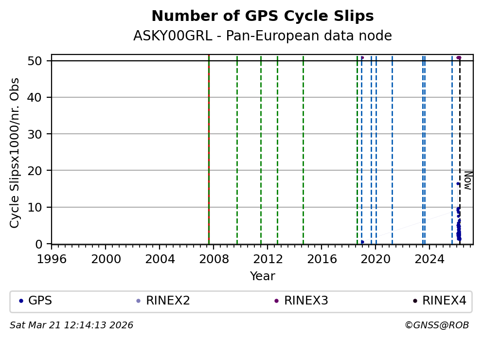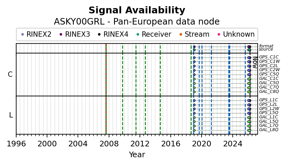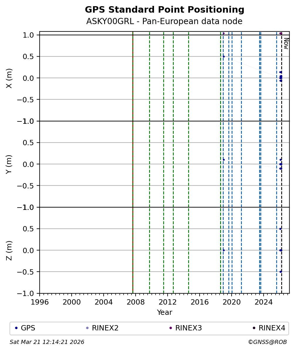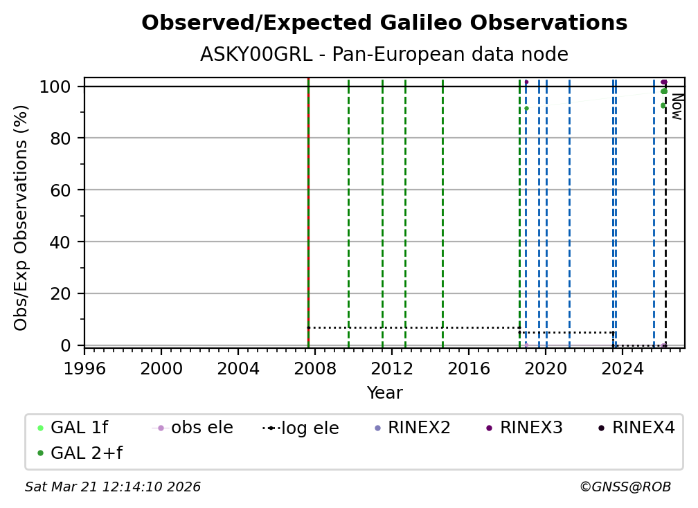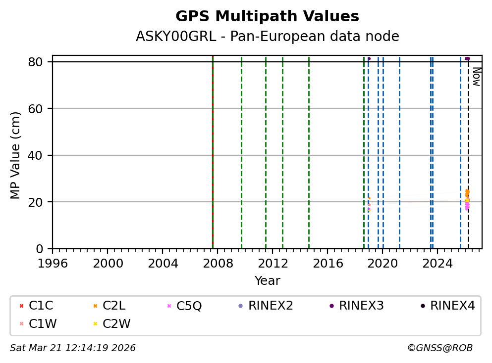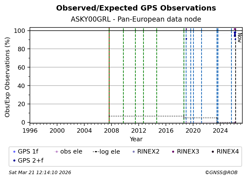 The plots below present the long-term tracking performance of the EPOS-GNSS station ASKY00GRL based on the daily RINEX data available from the Pan-European EPOS-GNSS data node. The data quality metrics have been computed at the data node using the G-Nut/Anubis software.