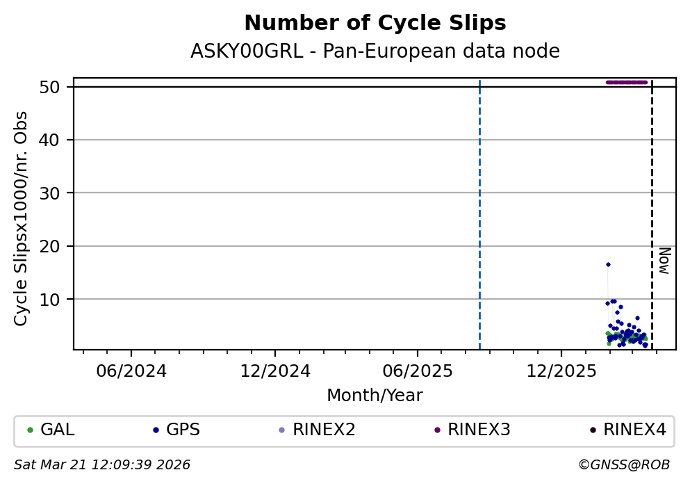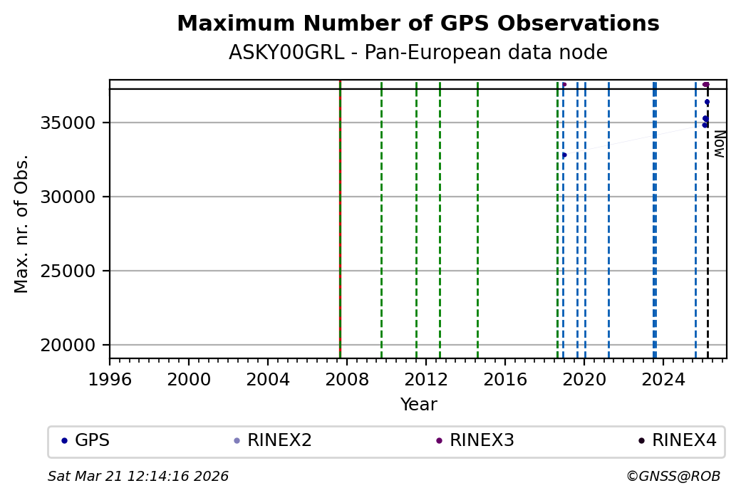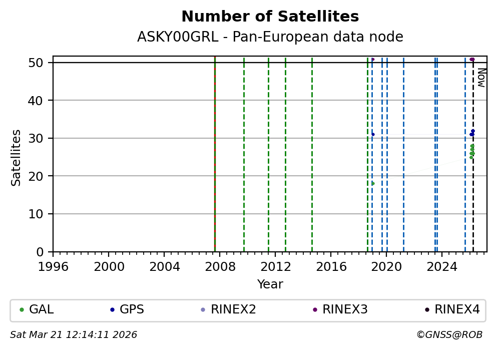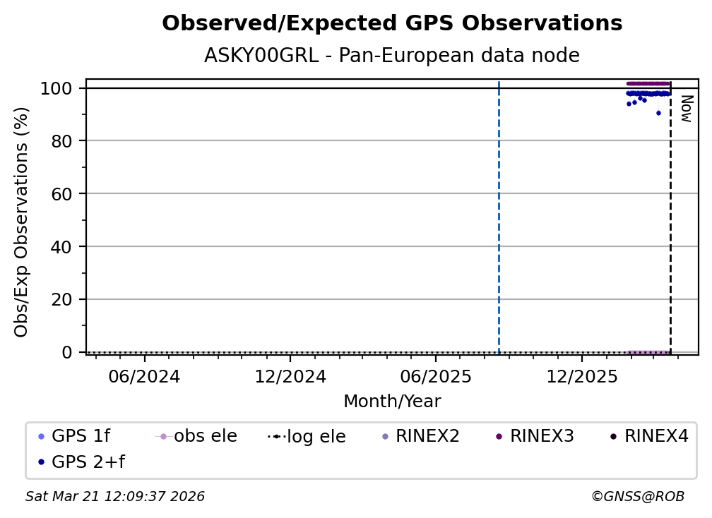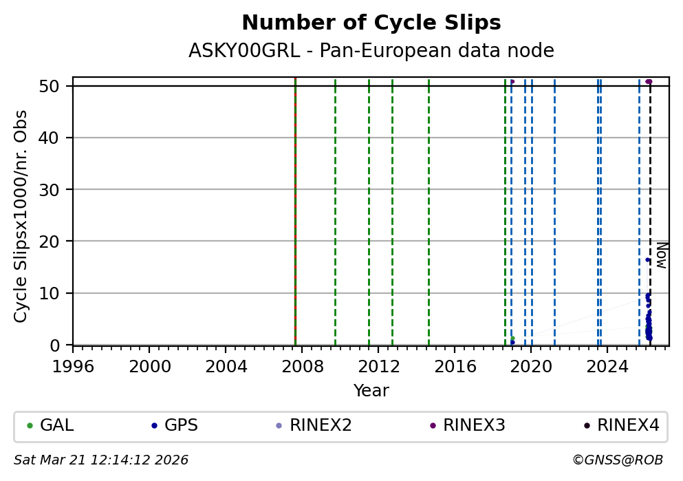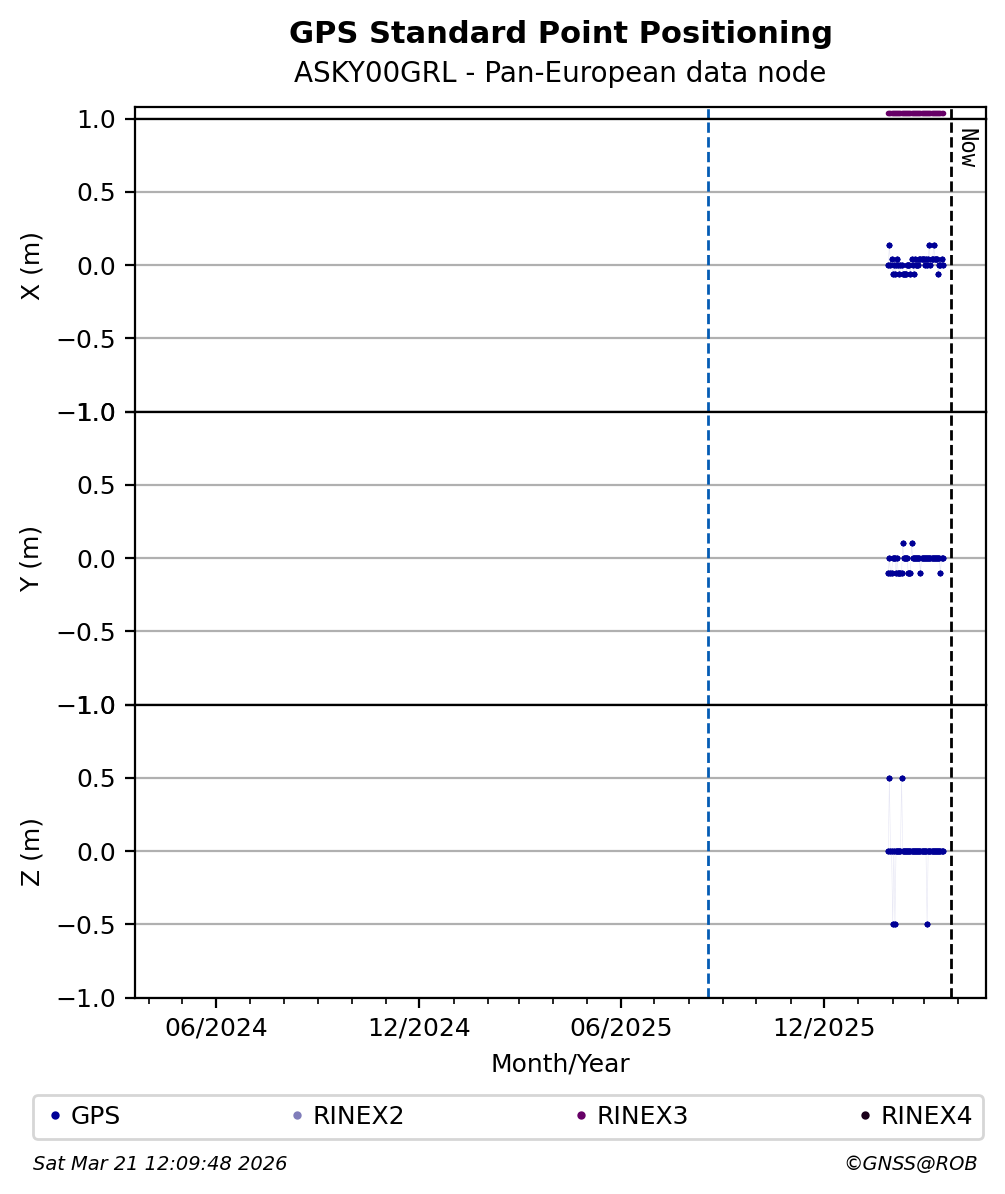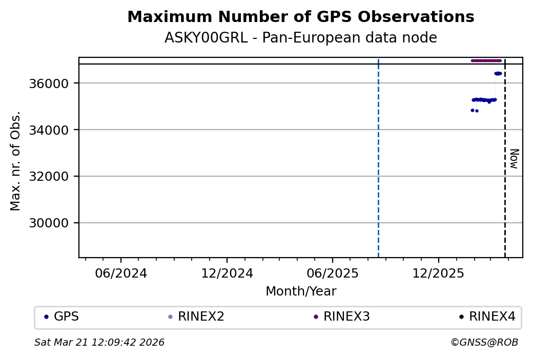 The plots below present the long-term tracking performance of the EPOS-GNSS station ASKY00GRL based on the daily RINEX data available from the Pan-European EPOS-GNSS data node. The data quality metrics have been computed at the data node using the G-Nut/Anubis software.