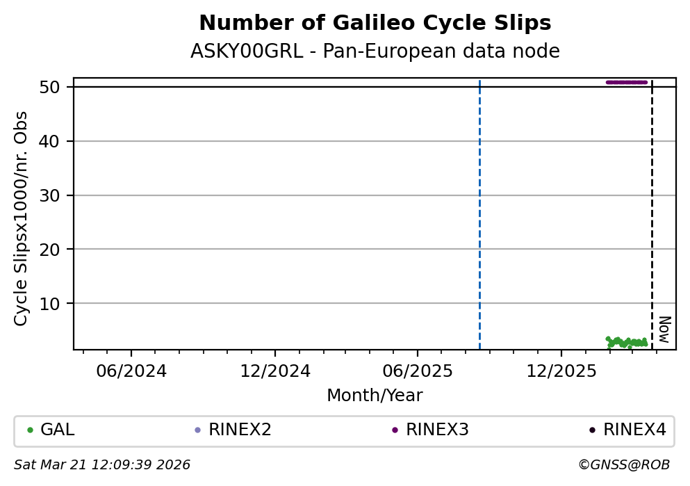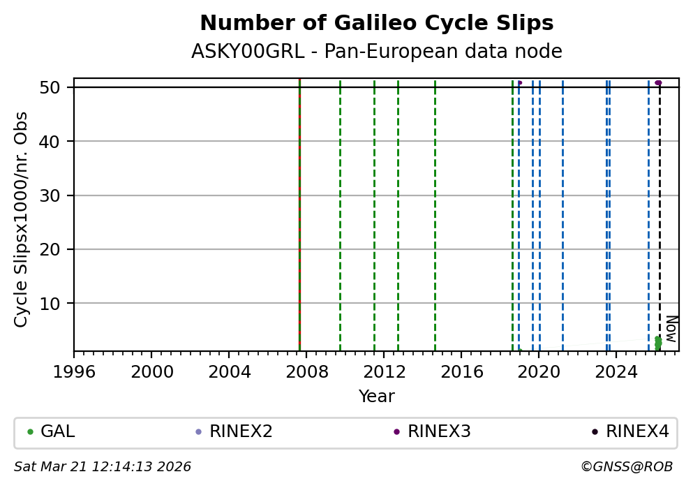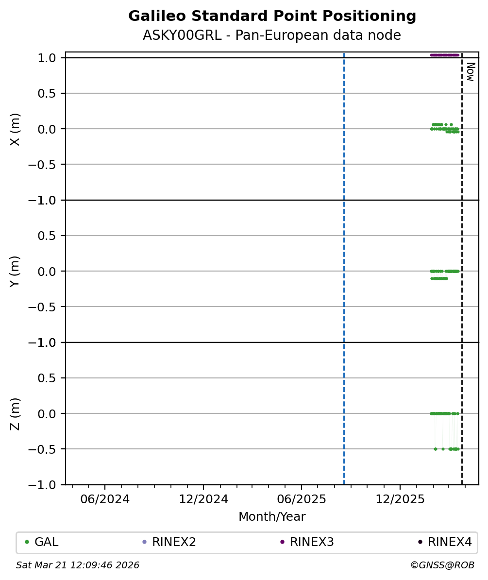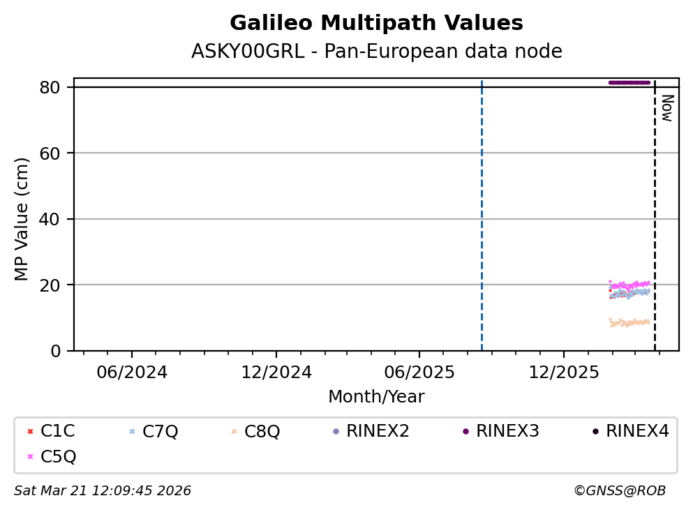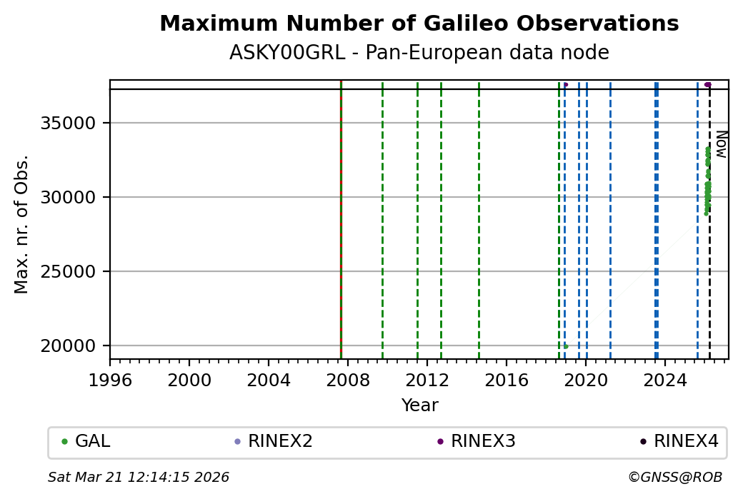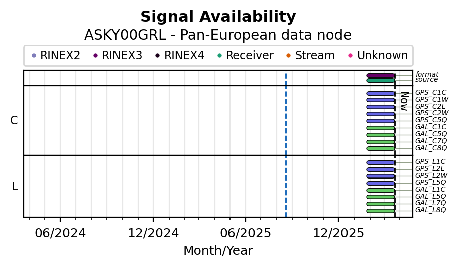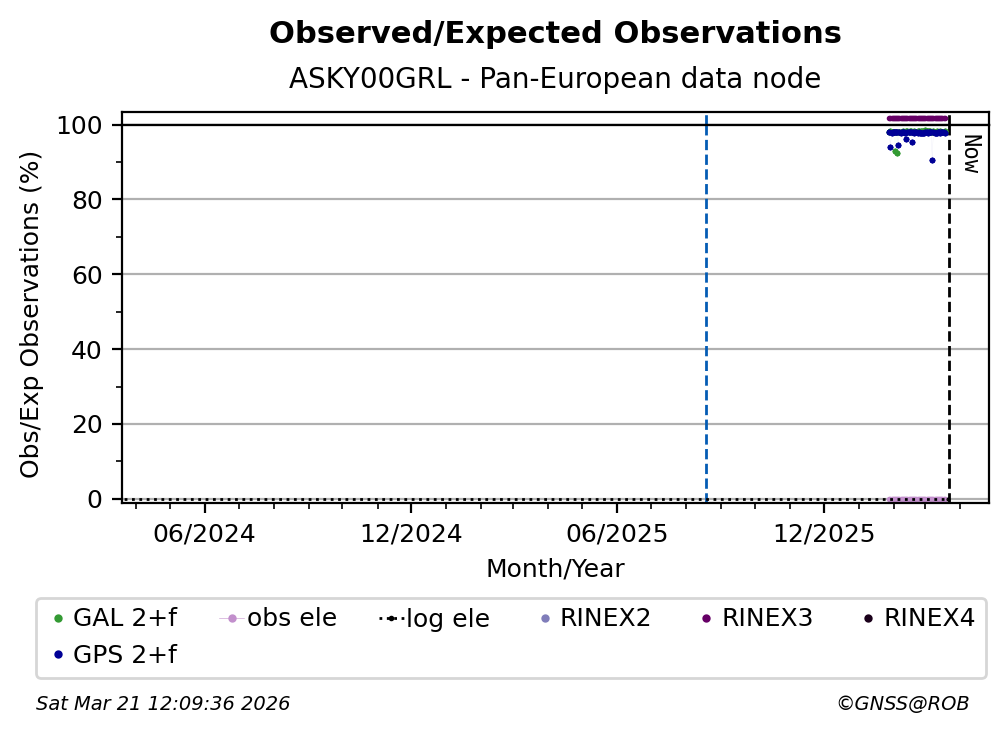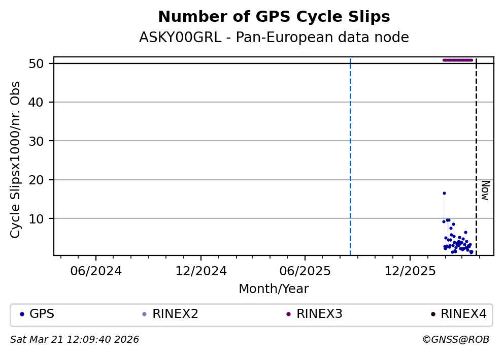 The plots below present the long-term tracking performance of the EPOS-GNSS station ASKY00GRL based on the daily RINEX data available from the Pan-European EPOS-GNSS data node. The data quality metrics have been computed at the data node using the G-Nut/Anubis software.