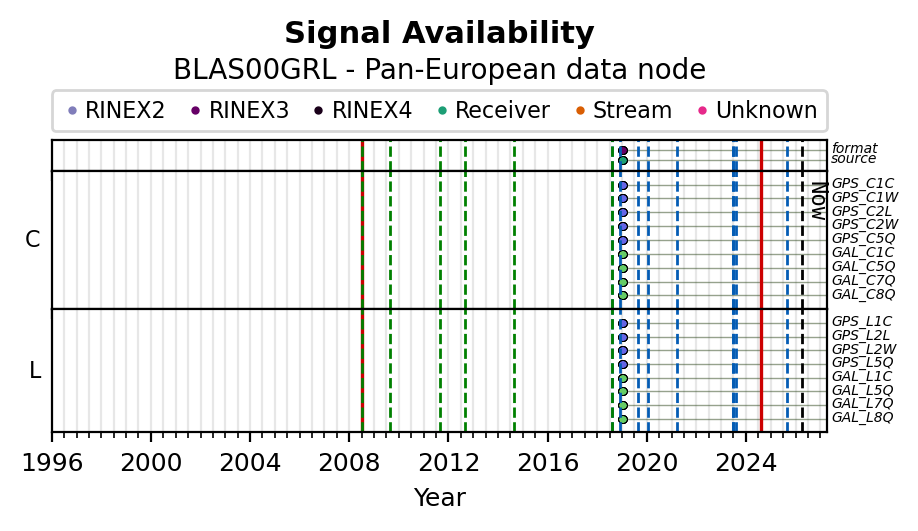 Red vertical lines, green and blue vertical dotted lines indicate respectively a change of antenna, receiver or receiver configuration (including firmware) as indicated by the station manager in the station site log available from the M3G GNSS Metadata Catalog. The purple points in the top of the plot indicate the daily RINEX data availability at the data node.