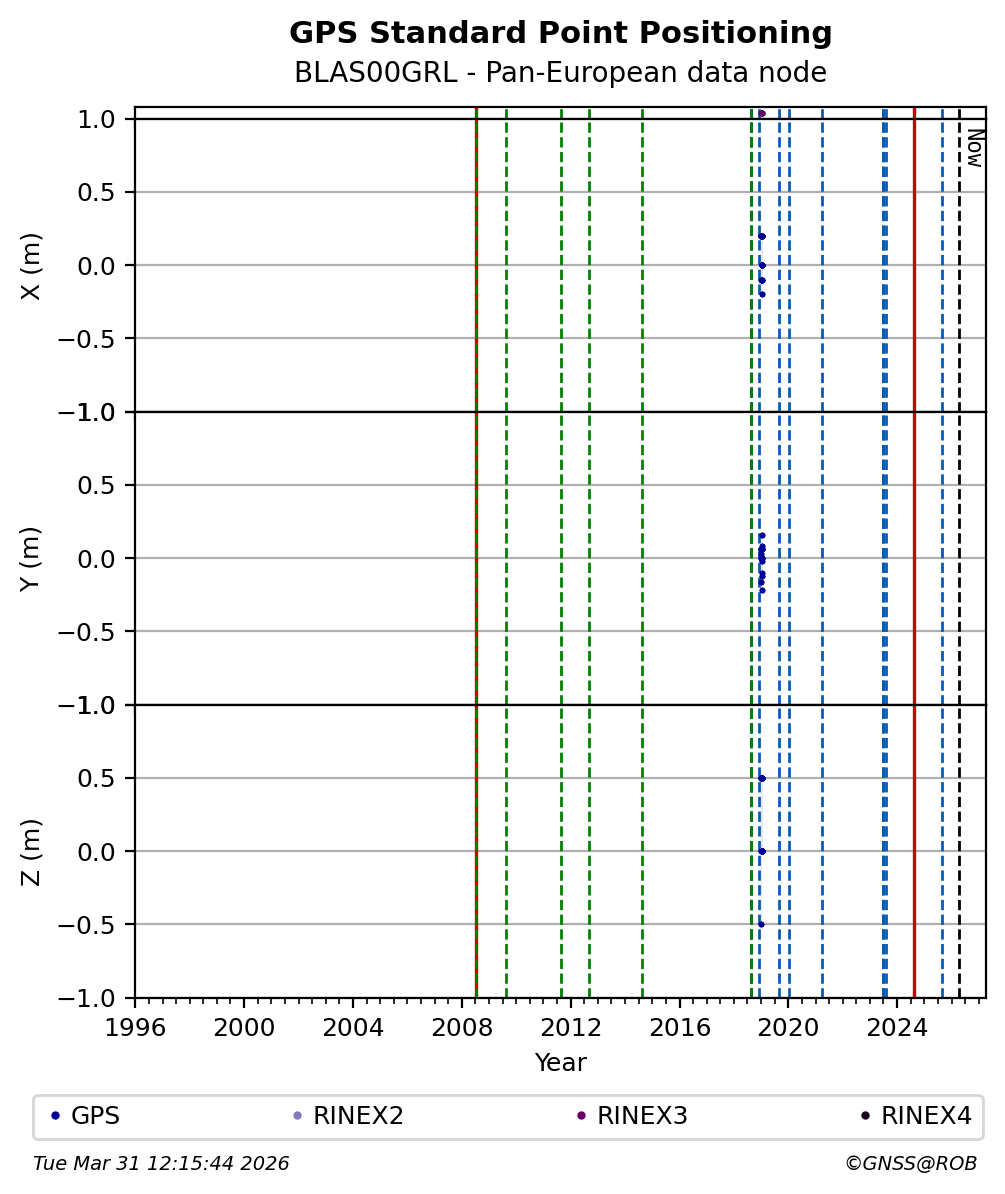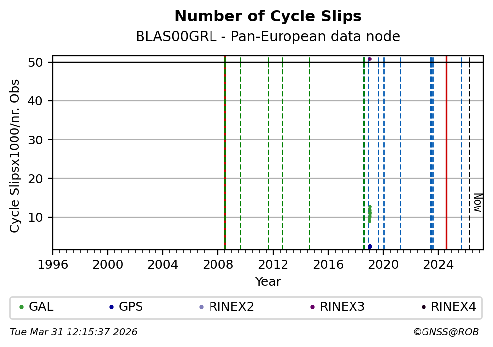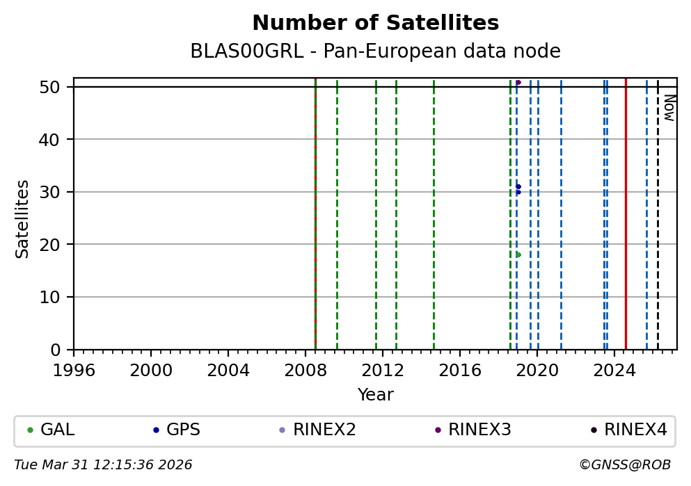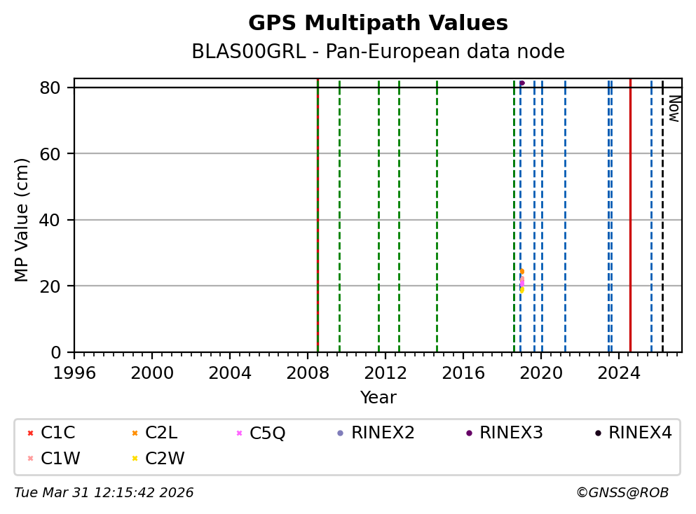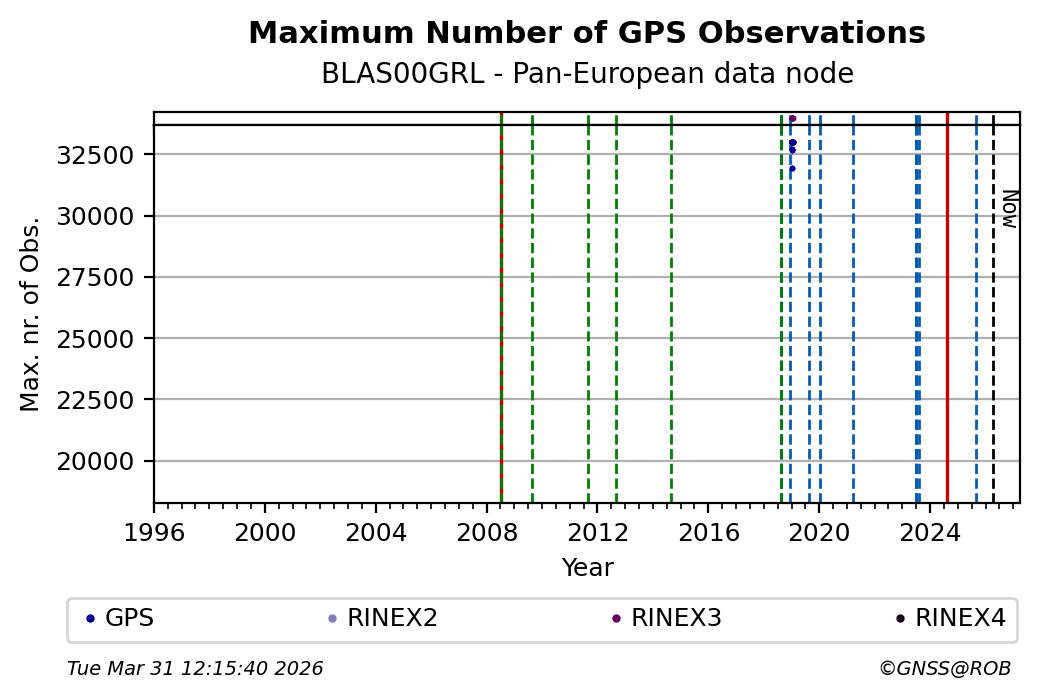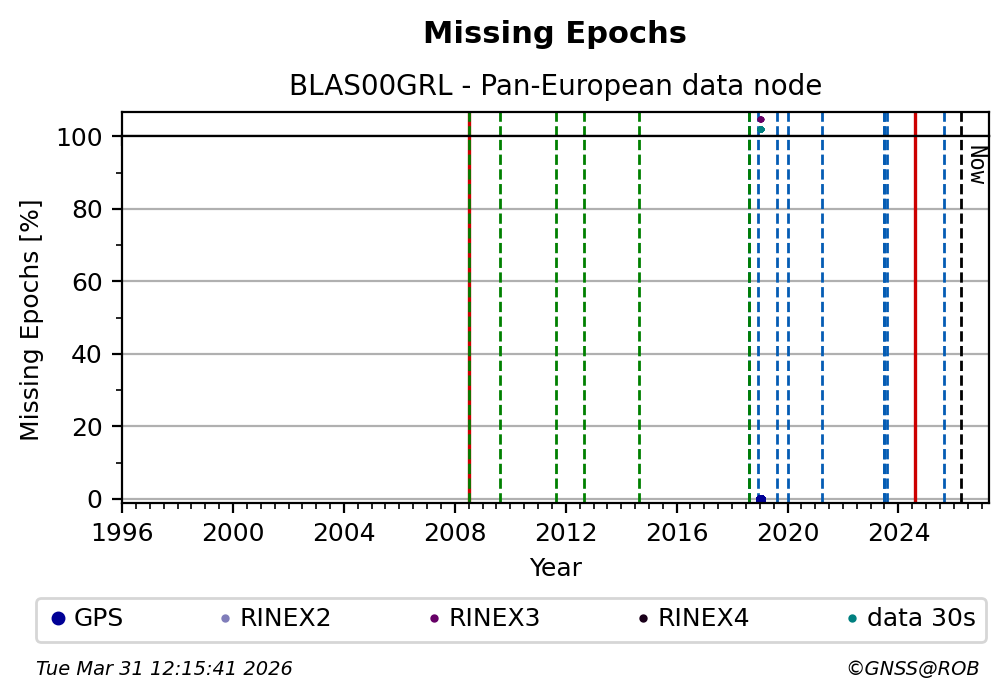 The plots below present the long-term tracking performance of the EPOS-GNSS station BLAS00GRL based on the daily RINEX data available from the Pan-European EPOS-GNSS data node. The data quality metrics have been computed at the data node using the G-Nut/Anubis software.