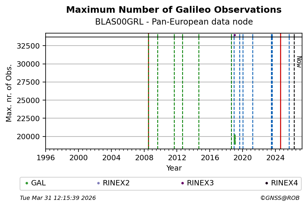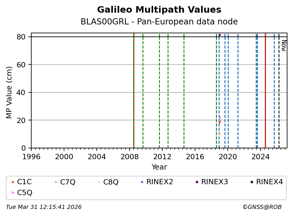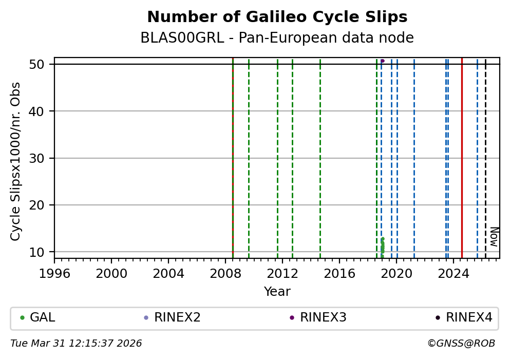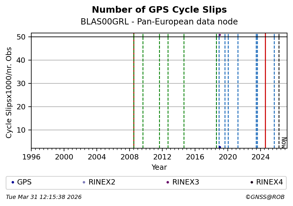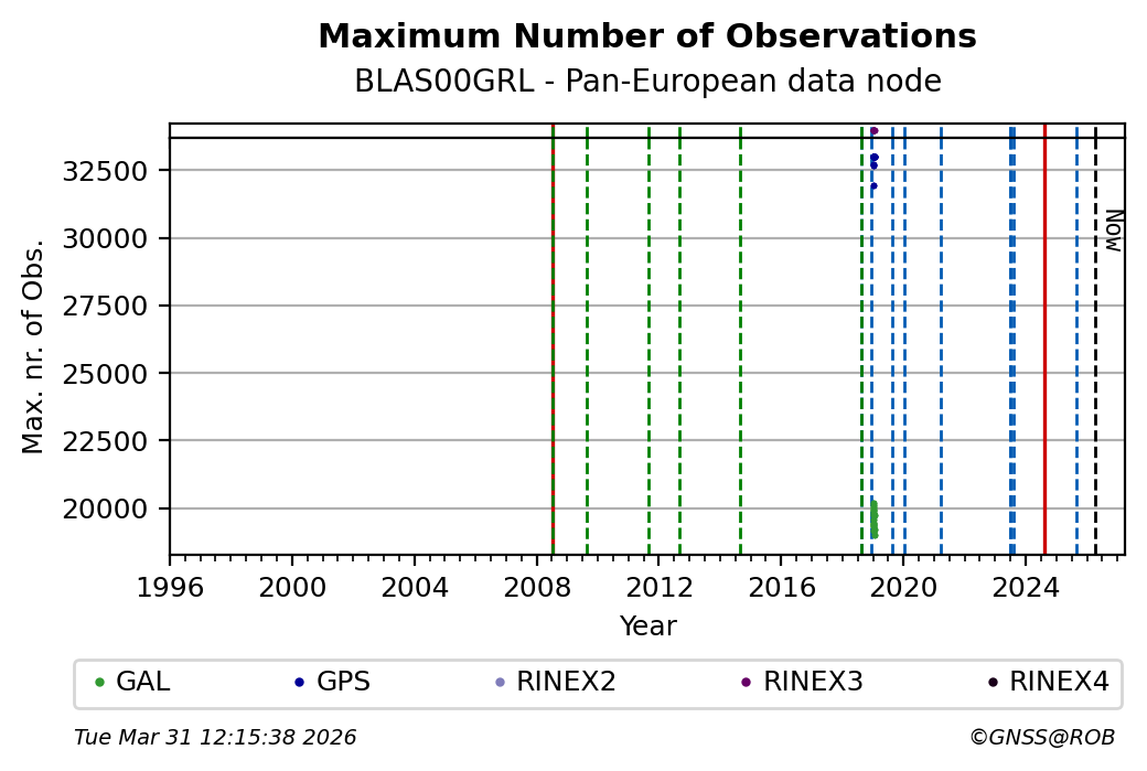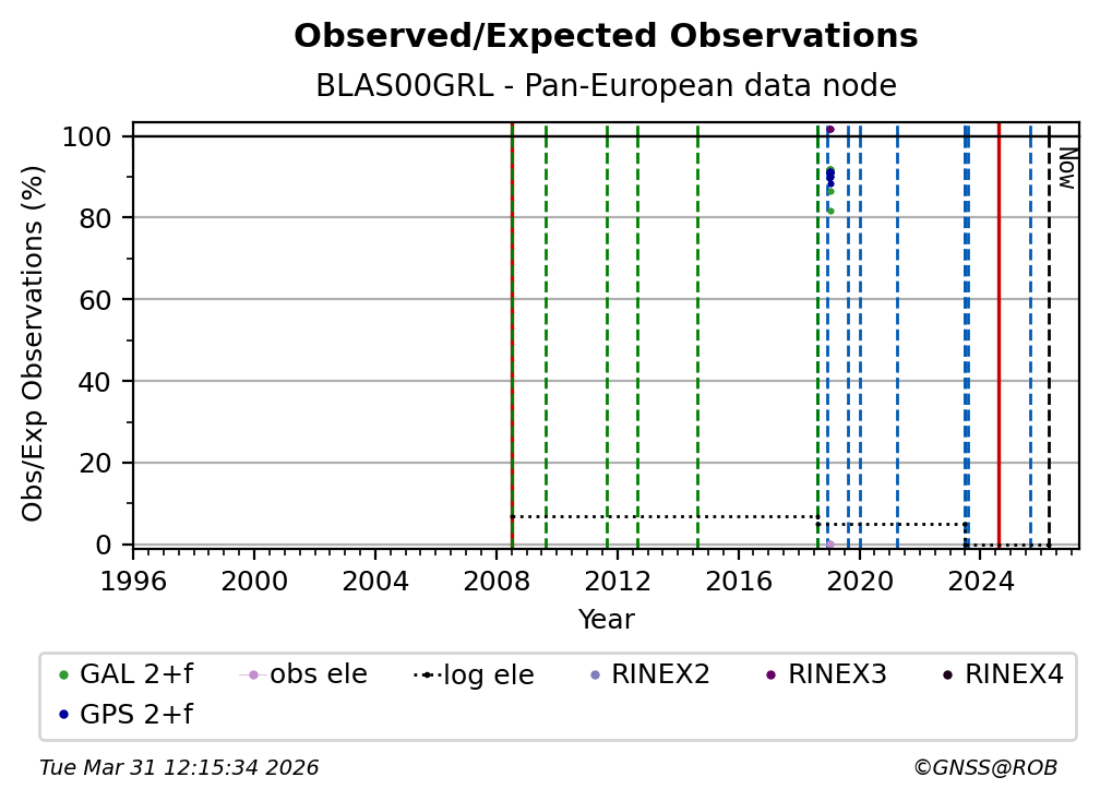 The plots below present the long-term tracking performance of the EPOS-GNSS station BLAS00GRL based on the daily RINEX data available from the Pan-European EPOS-GNSS data node. The data quality metrics have been computed at the data node using the G-Nut/Anubis software.