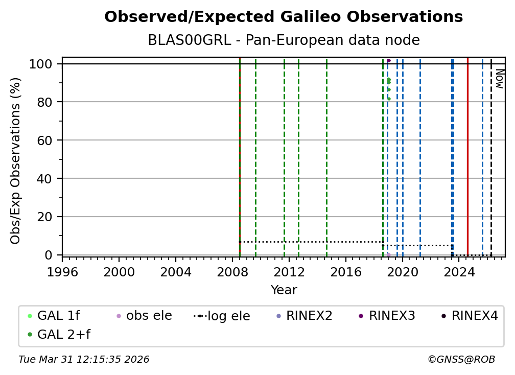 The percentage corresponds, for each constellation tracked by the station, to the ratio of the number of observations in the daily RINEX file with respect to the number of expected observations: