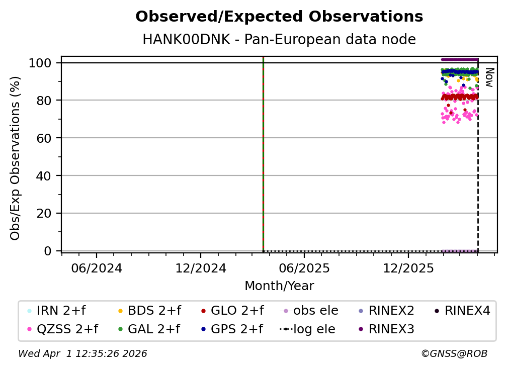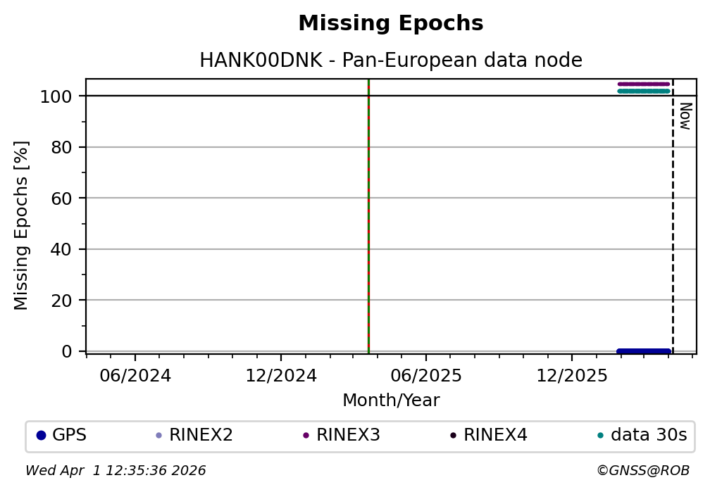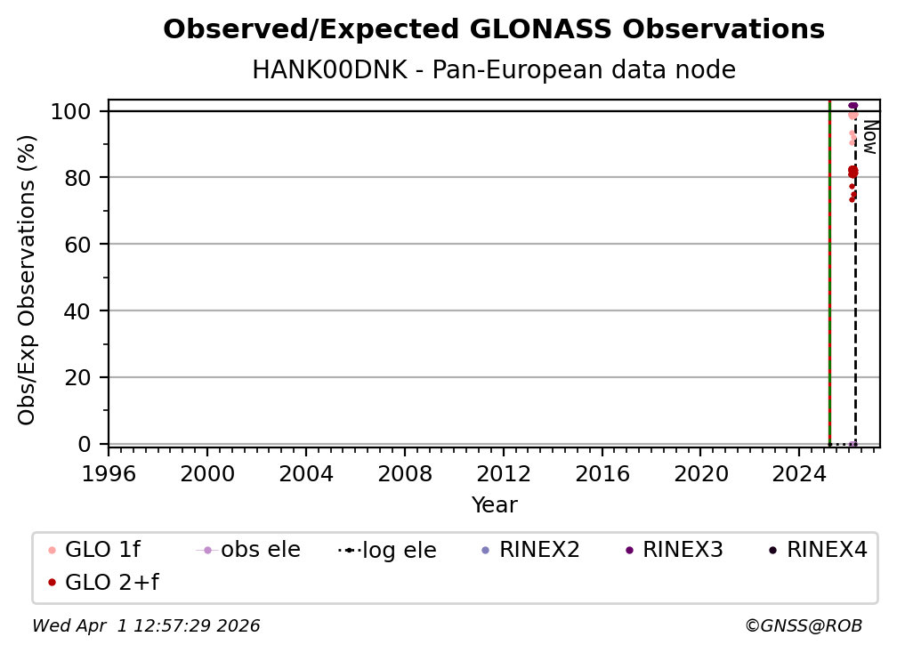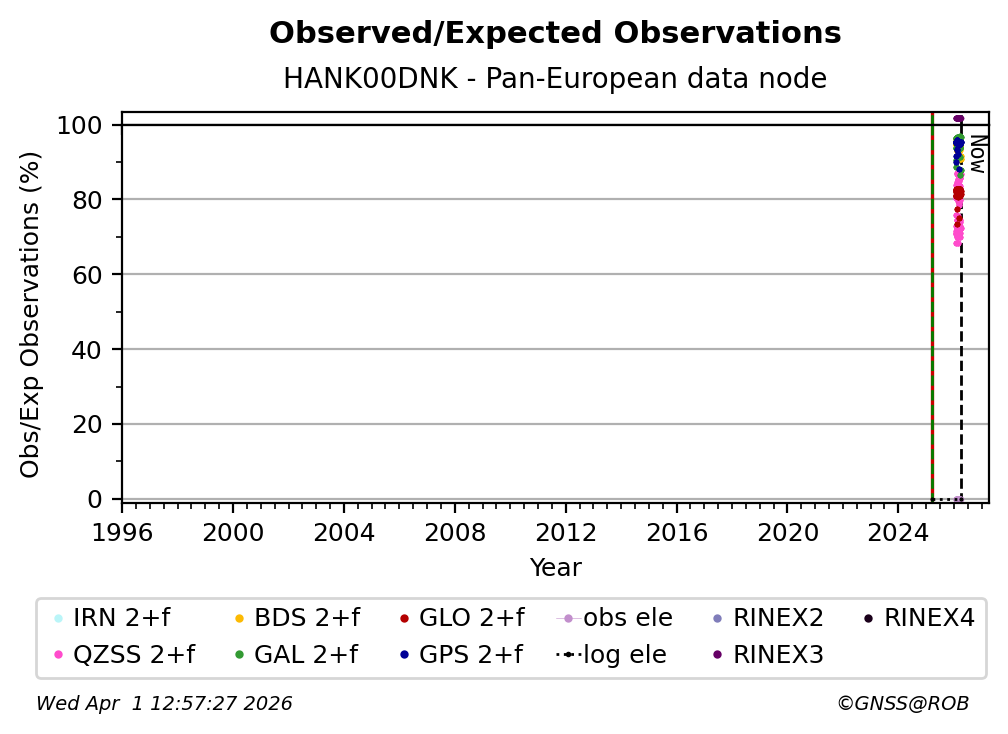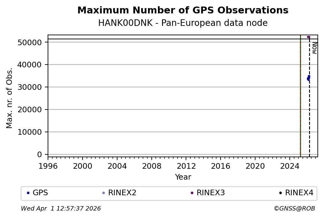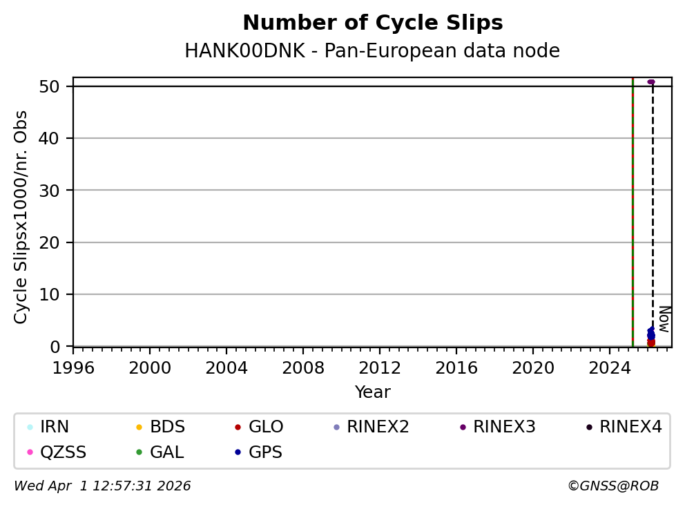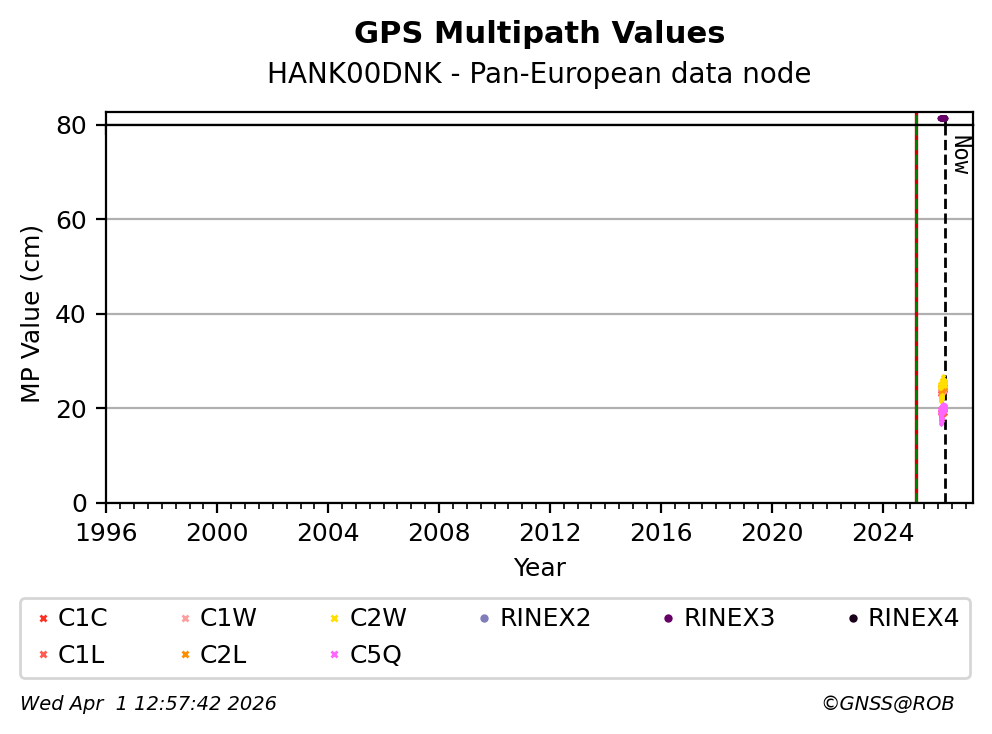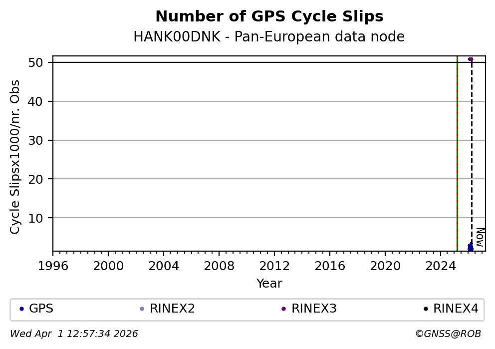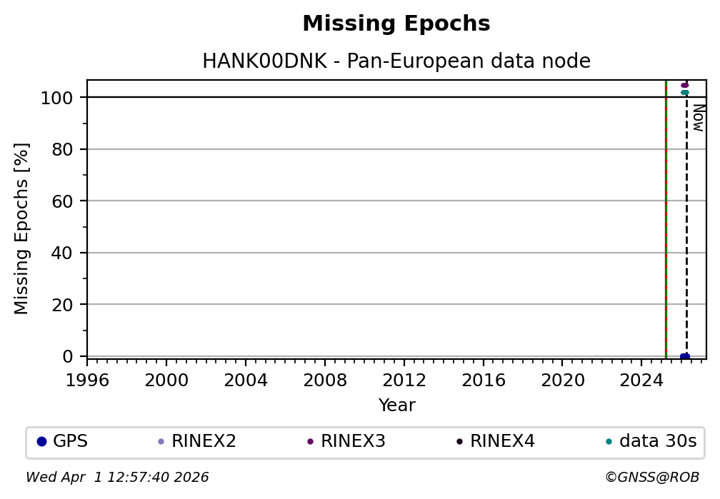The plots below present the long-term tracking performance of the EPOS-GNSS station HANK00DNK based on the daily RINEX data available from the Pan-European EPOS-GNSS data node. The data quality metrics have been computed at the data node using the G-Nut/Anubis software.