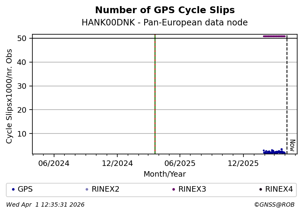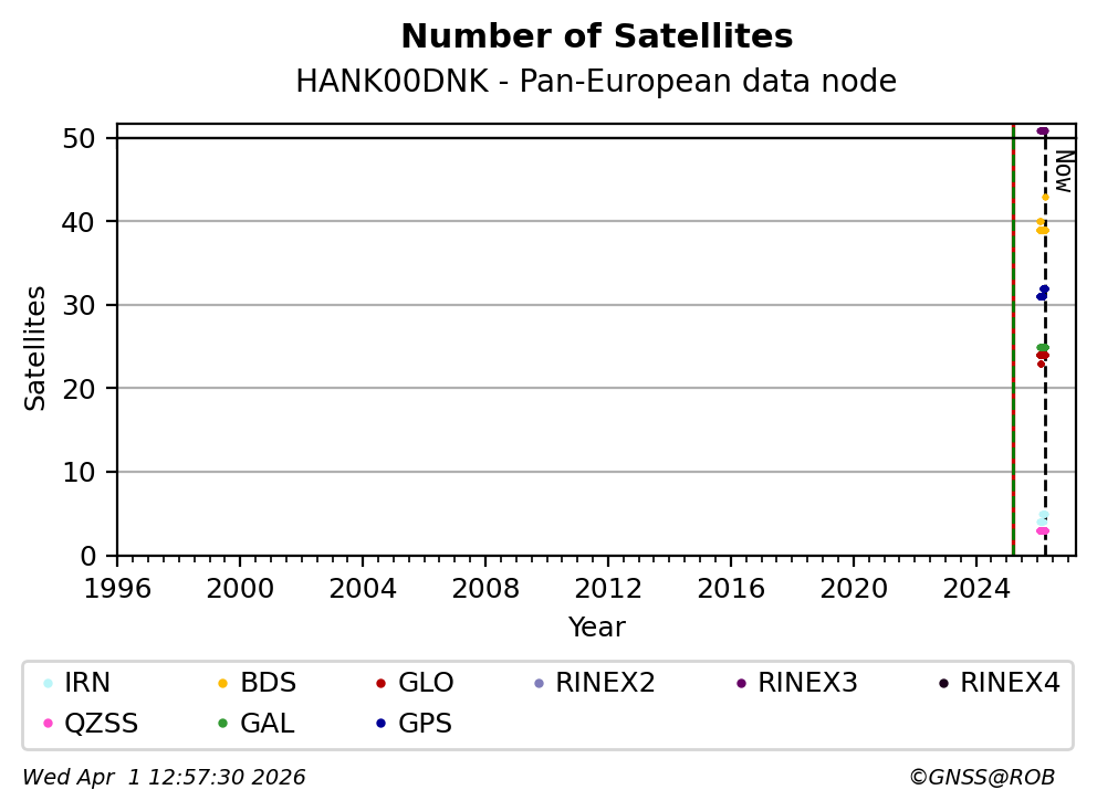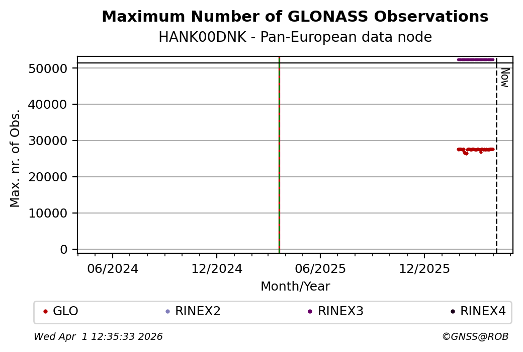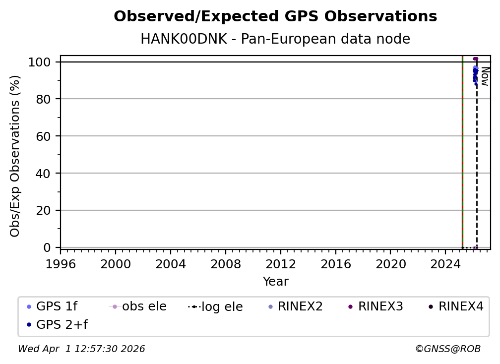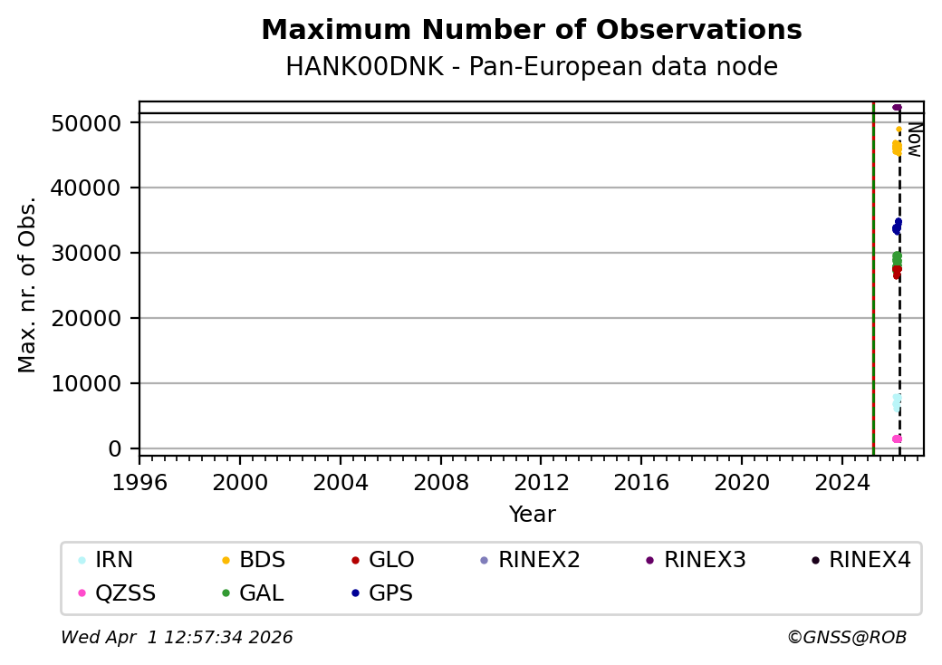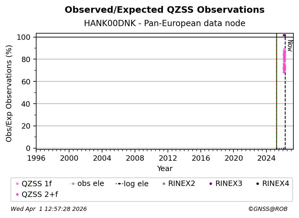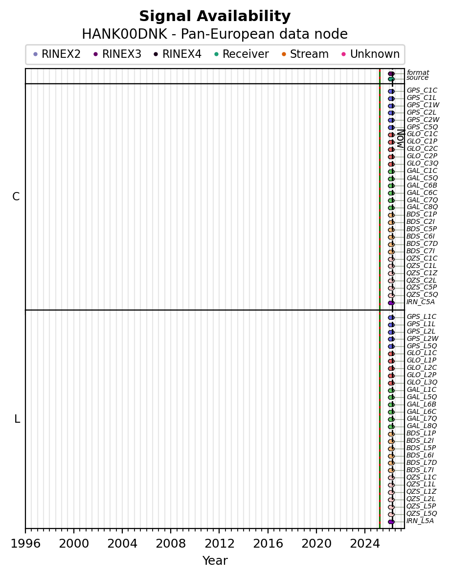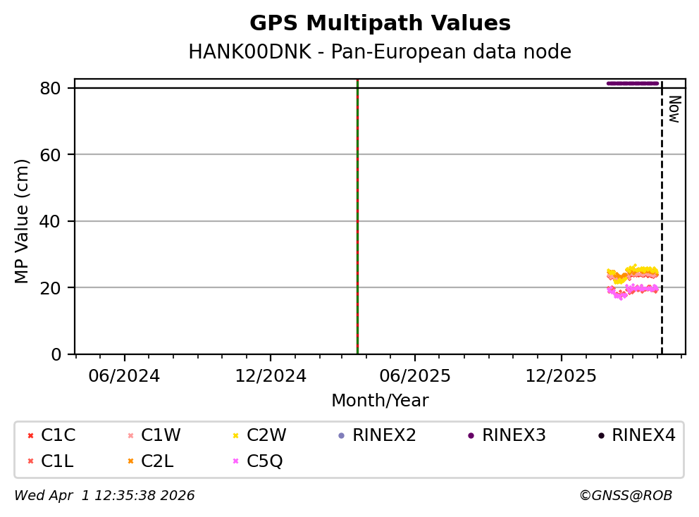 The plots below present the long-term tracking performance of the EPOS-GNSS station HANK00DNK based on the daily RINEX data available from the Pan-European EPOS-GNSS data node. The data quality metrics have been computed at the data node using the G-Nut/Anubis software.