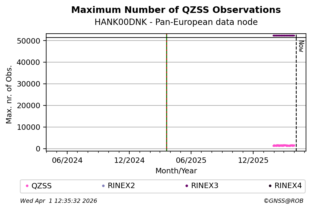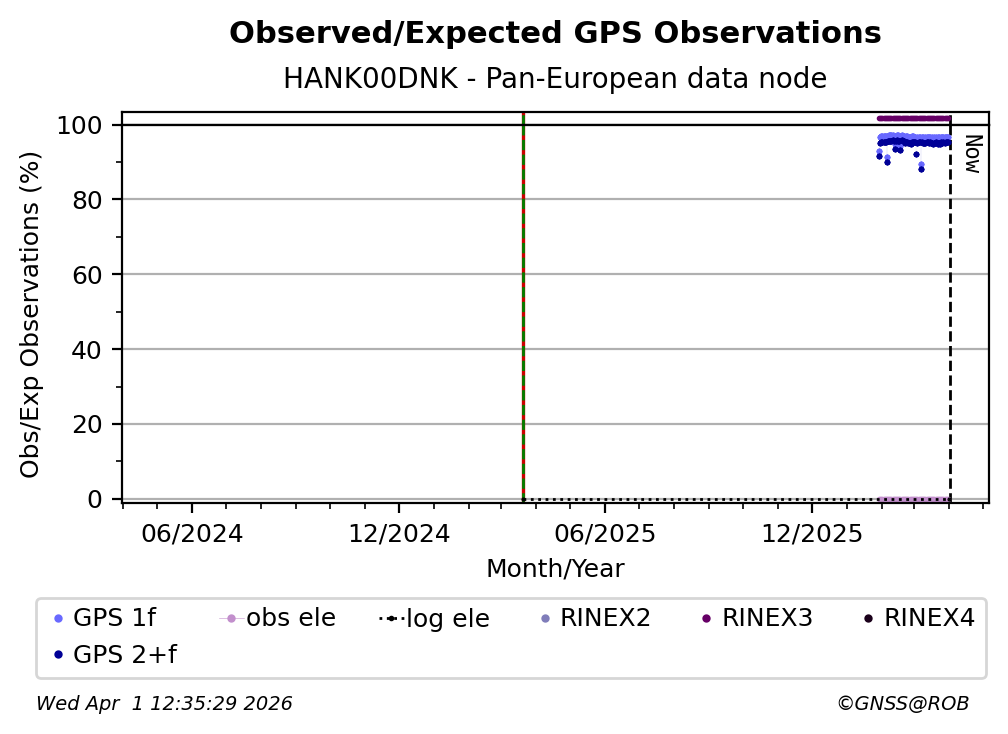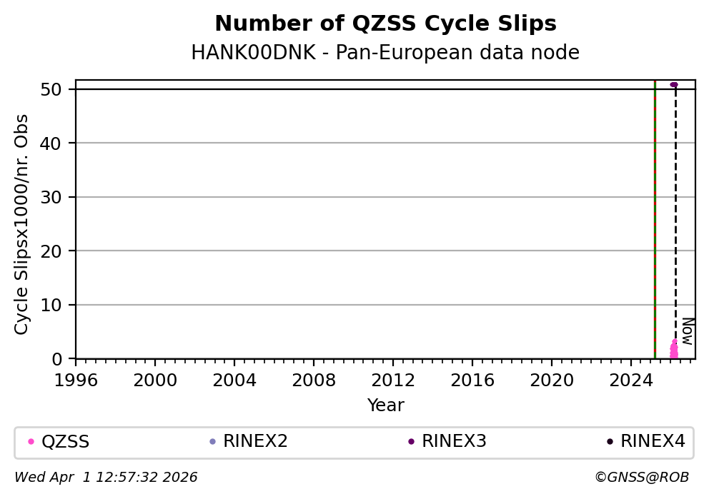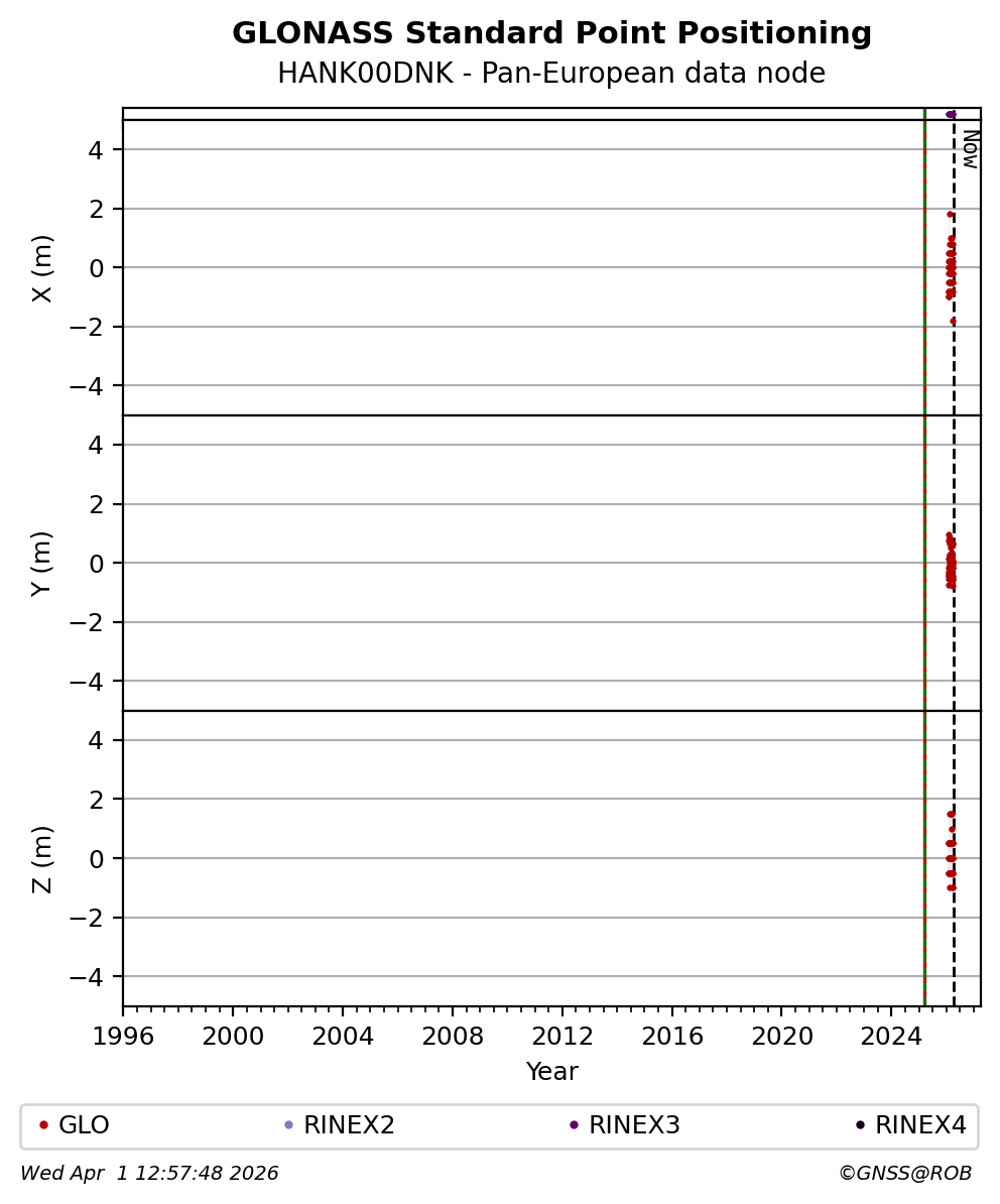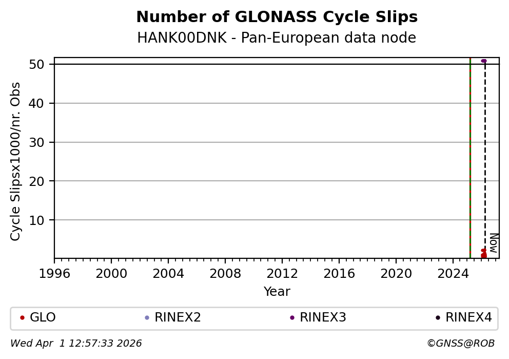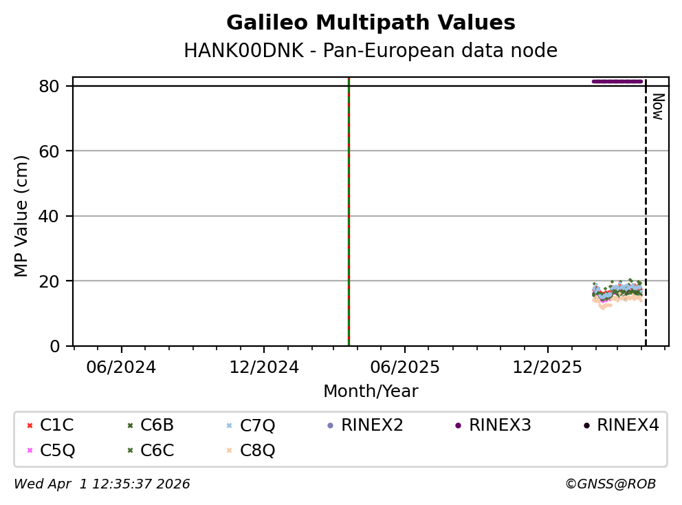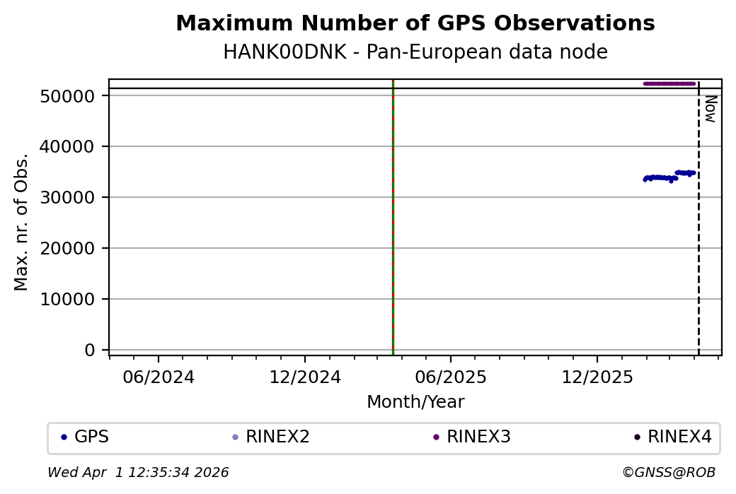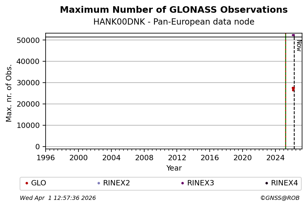 The plots below present the long-term tracking performance of the EPOS-GNSS station HANK00DNK based on the daily RINEX data available from the Pan-European EPOS-GNSS data node. The data quality metrics have been computed at the data node using the G-Nut/Anubis software.