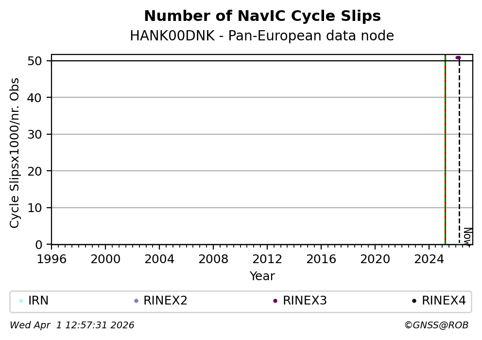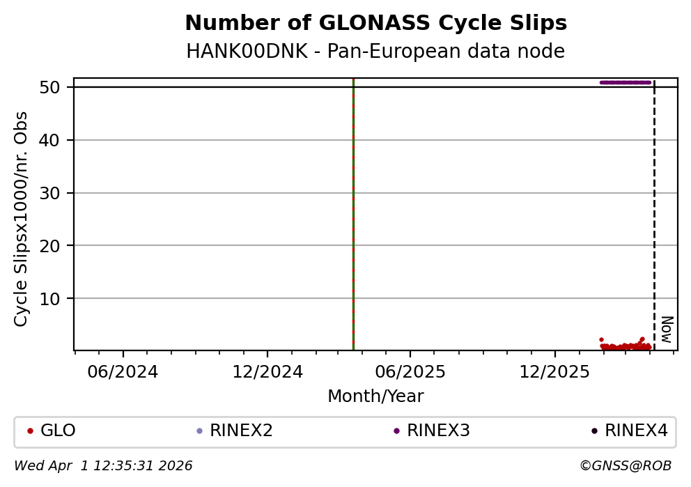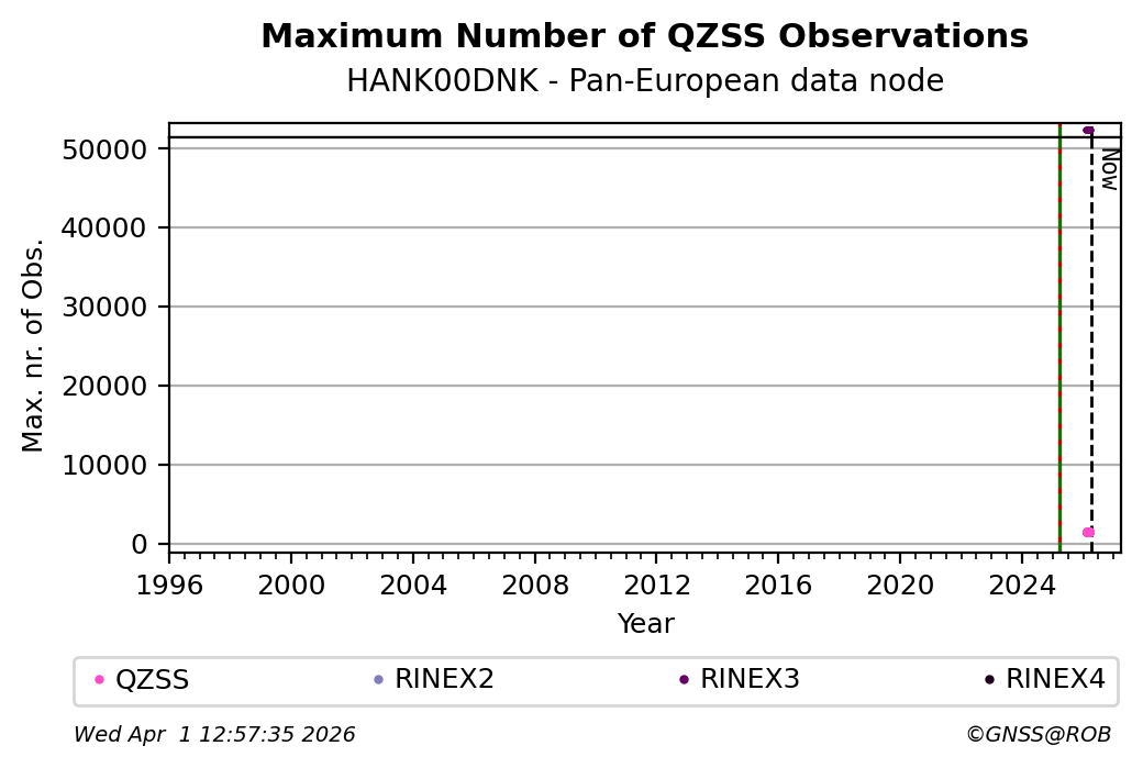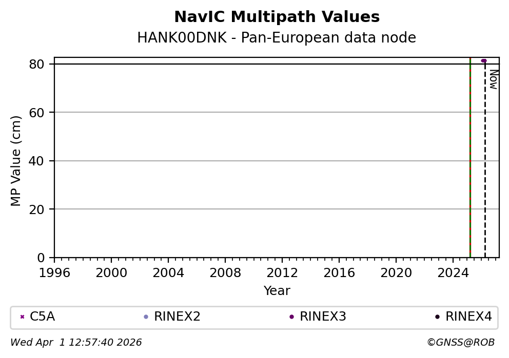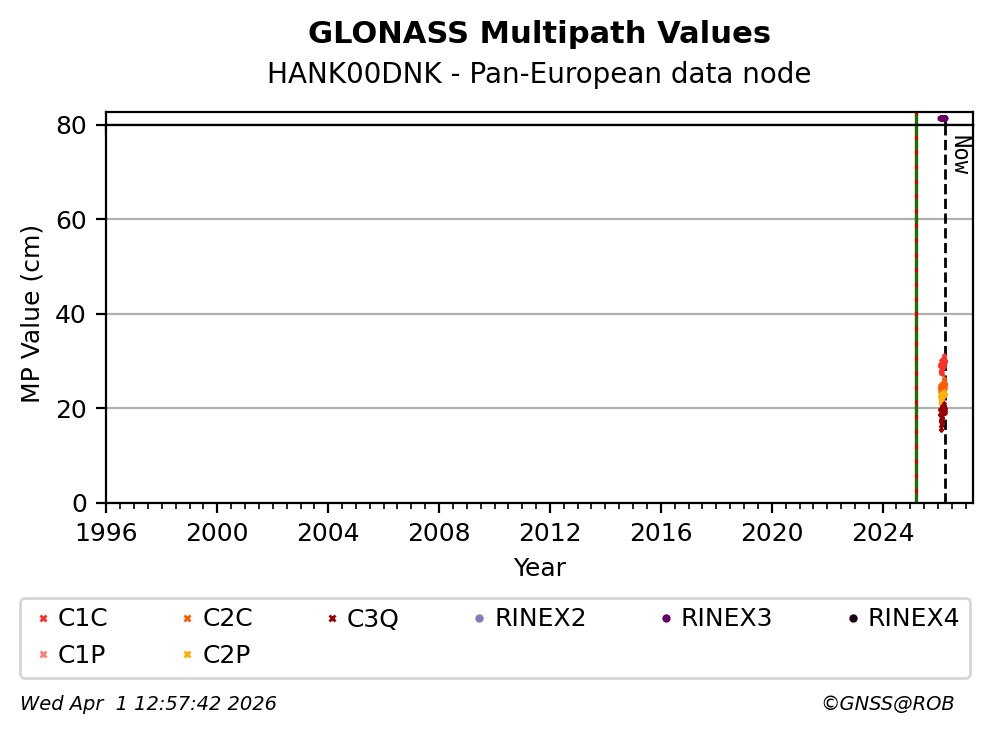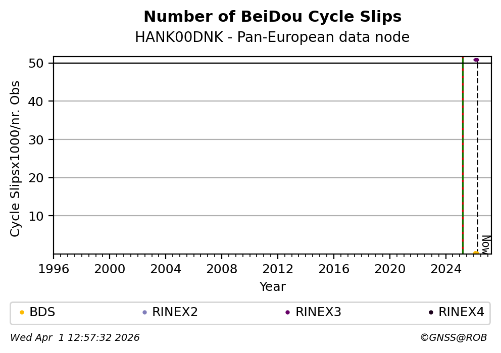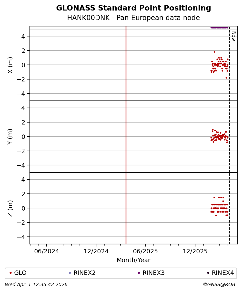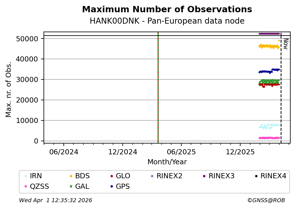 The plots below present the long-term tracking performance of the EPOS-GNSS station HANK00DNK based on the daily RINEX data available from the Pan-European EPOS-GNSS data node. The data quality metrics have been computed at the data node using the G-Nut/Anubis software.