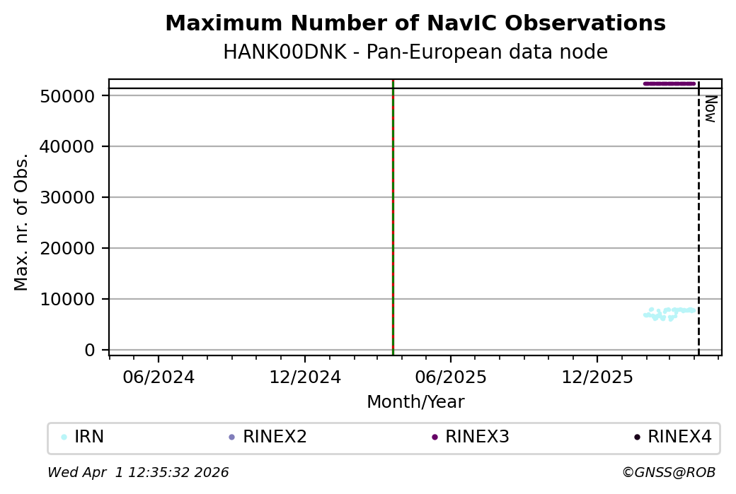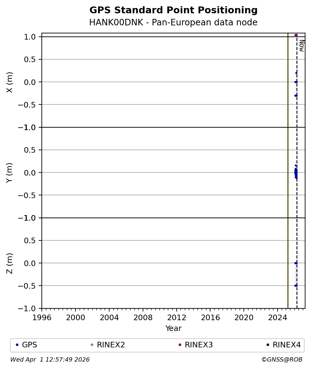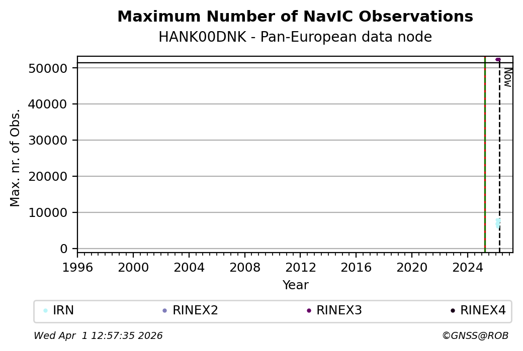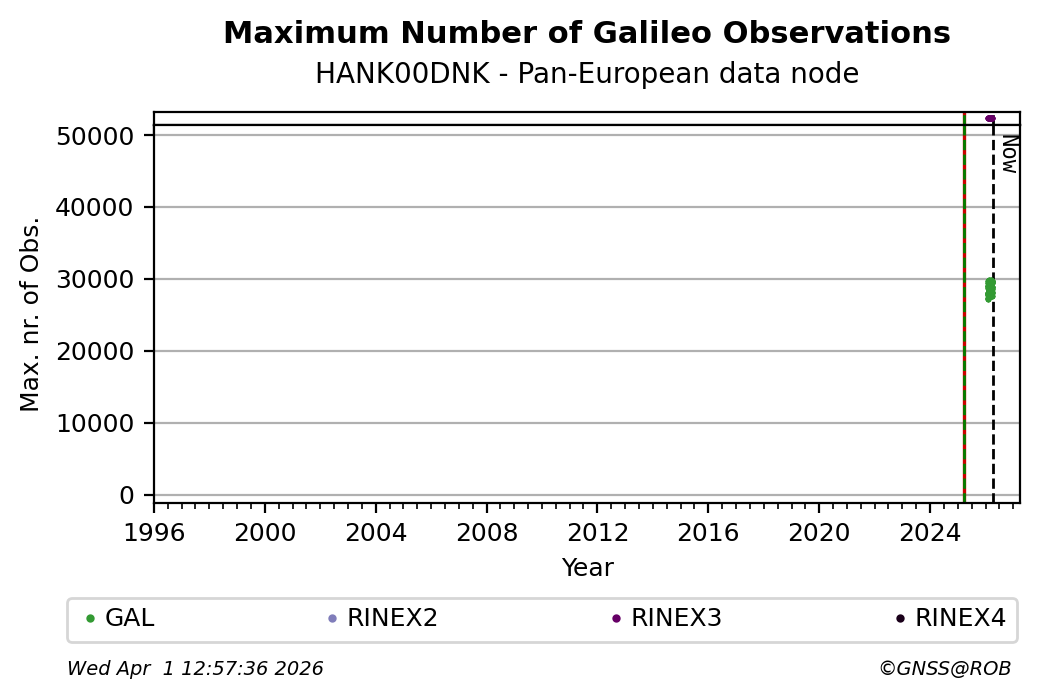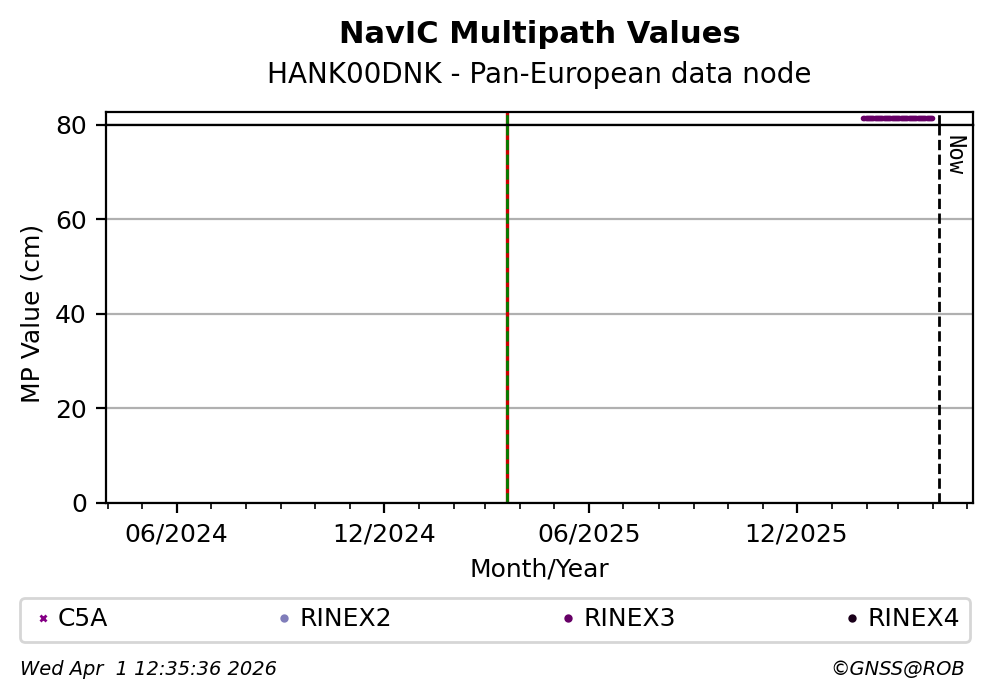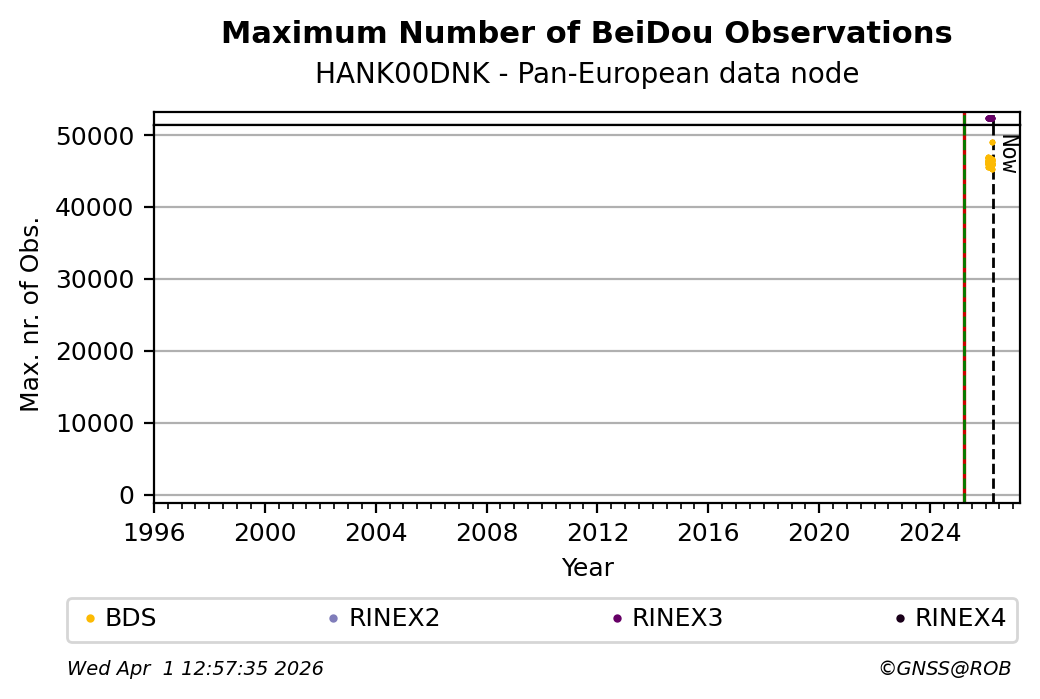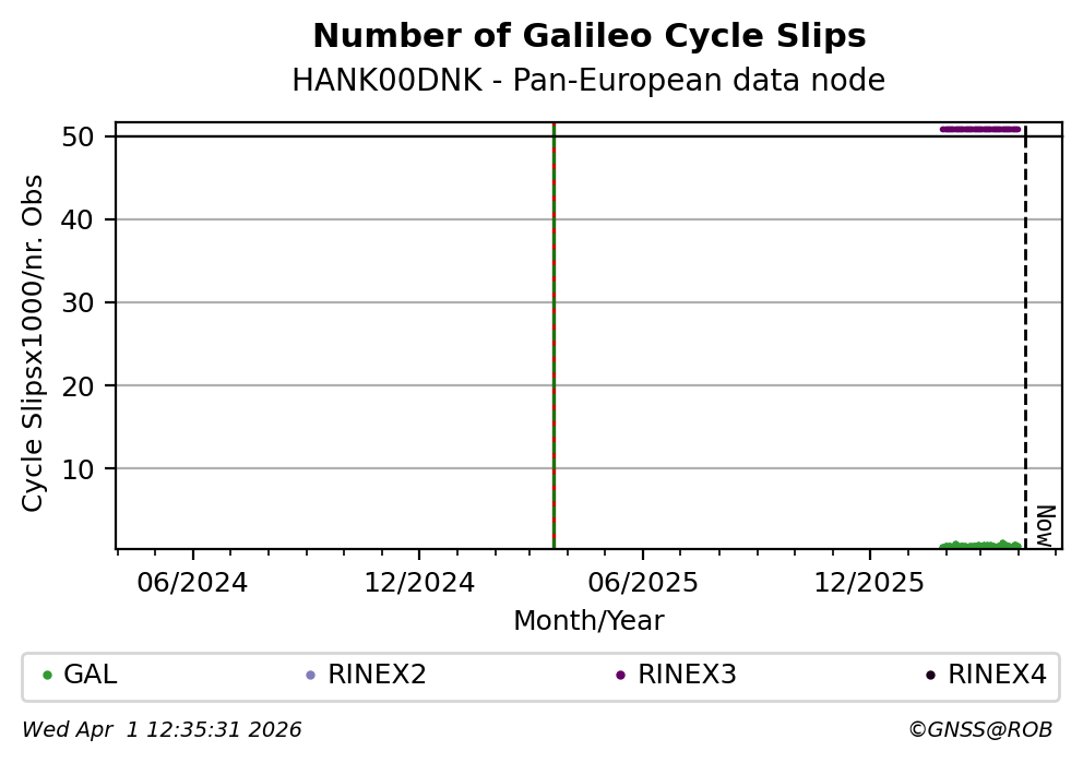 The plots below present the long-term tracking performance of the EPOS-GNSS station HANK00DNK based on the daily RINEX data available from the Pan-European EPOS-GNSS data node. The data quality metrics have been computed at the data node using the G-Nut/Anubis software.
