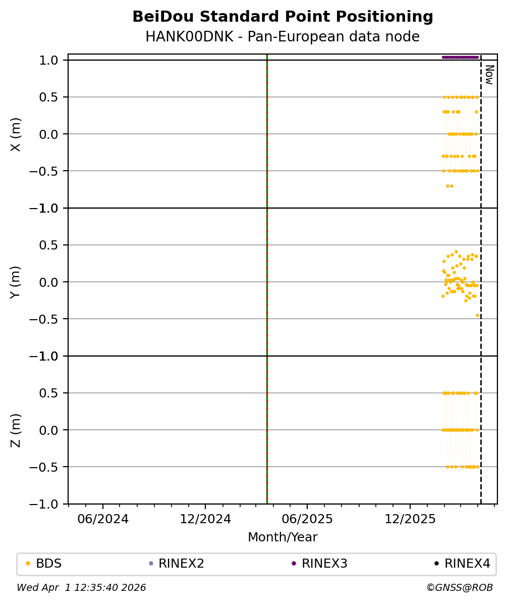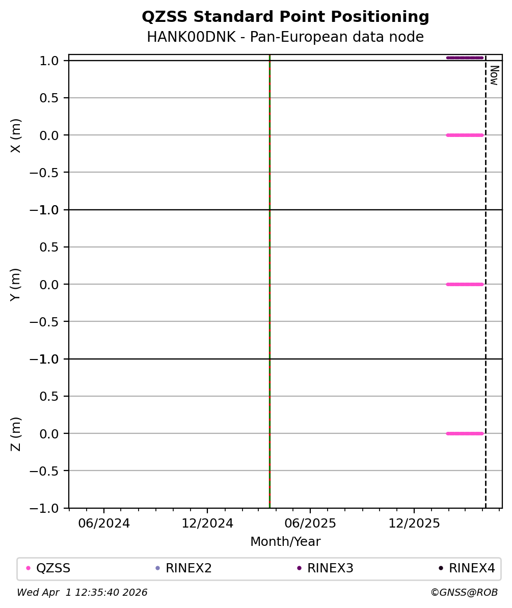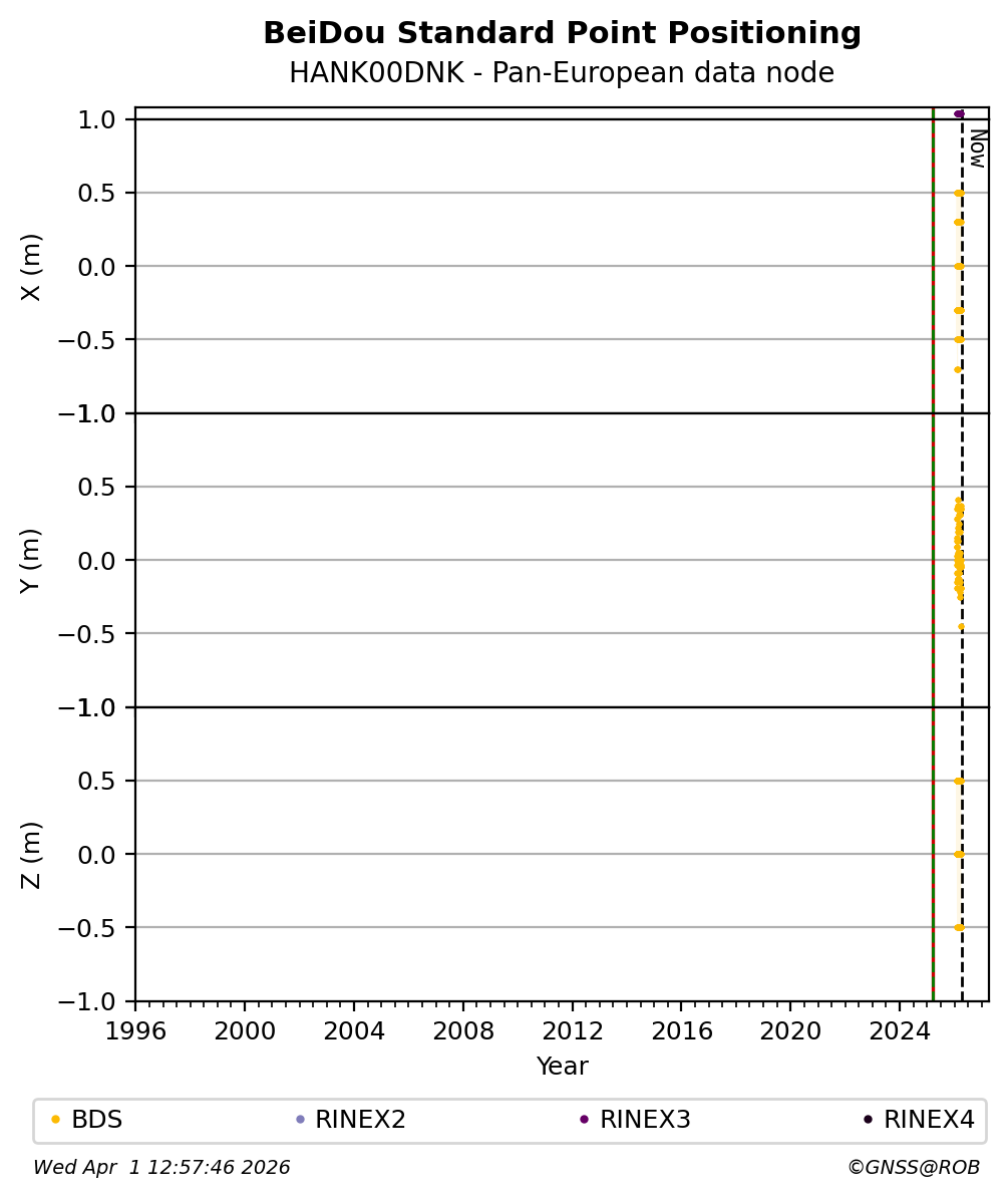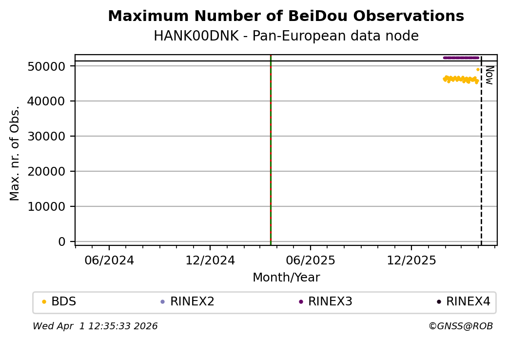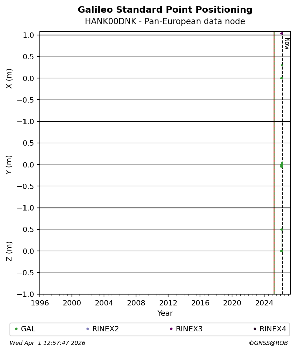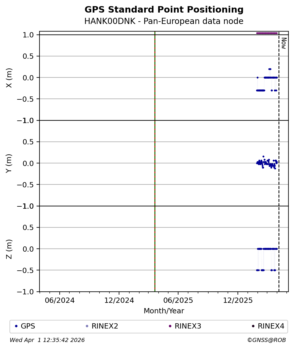 The plots below present the long-term tracking performance of the EPOS-GNSS station HANK00DNK based on the daily RINEX data available from the Pan-European EPOS-GNSS data node. The data quality metrics have been computed at the data node using the G-Nut/Anubis software.