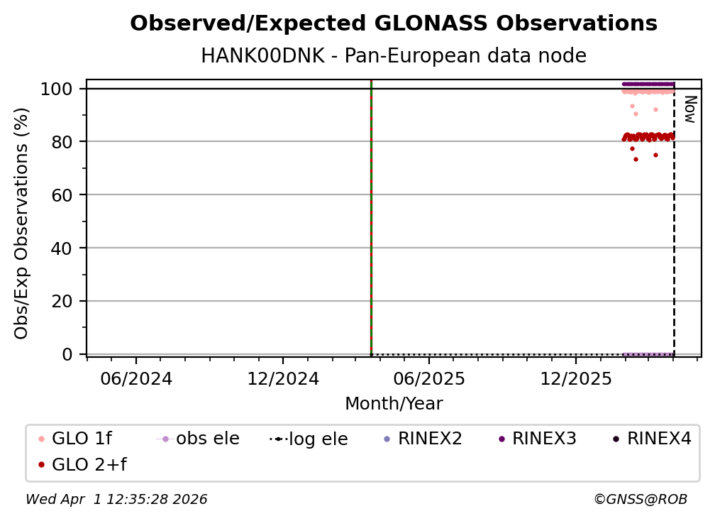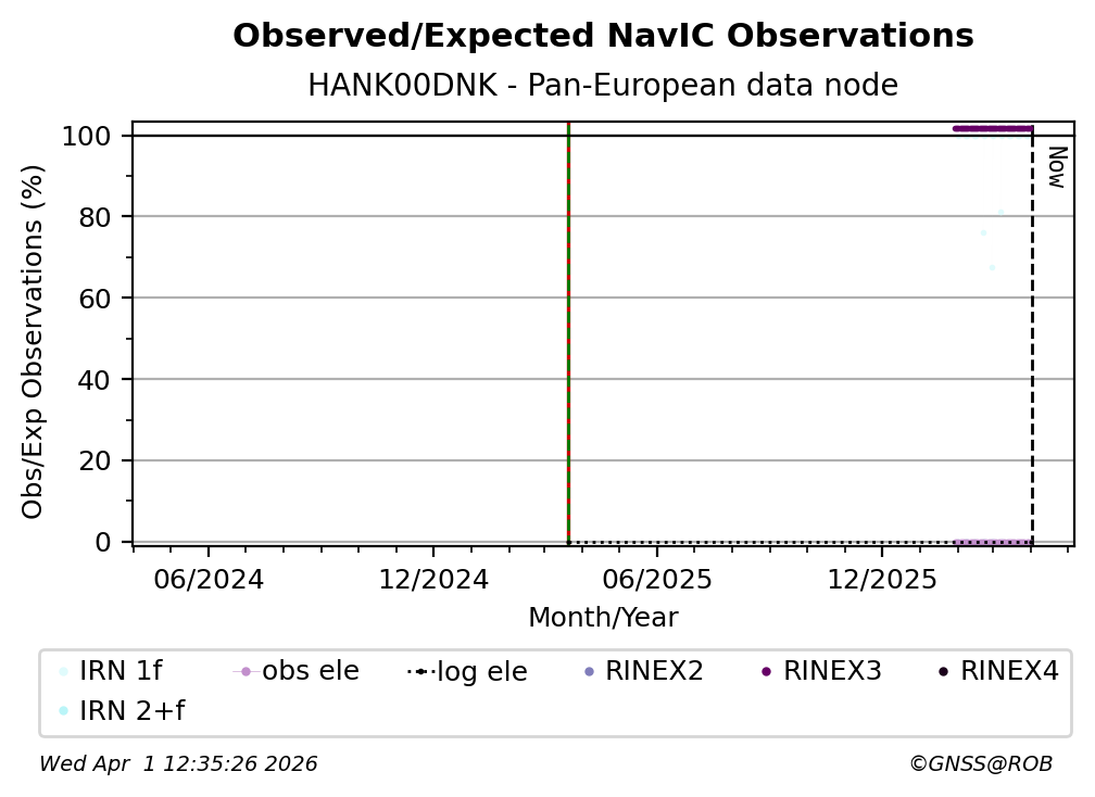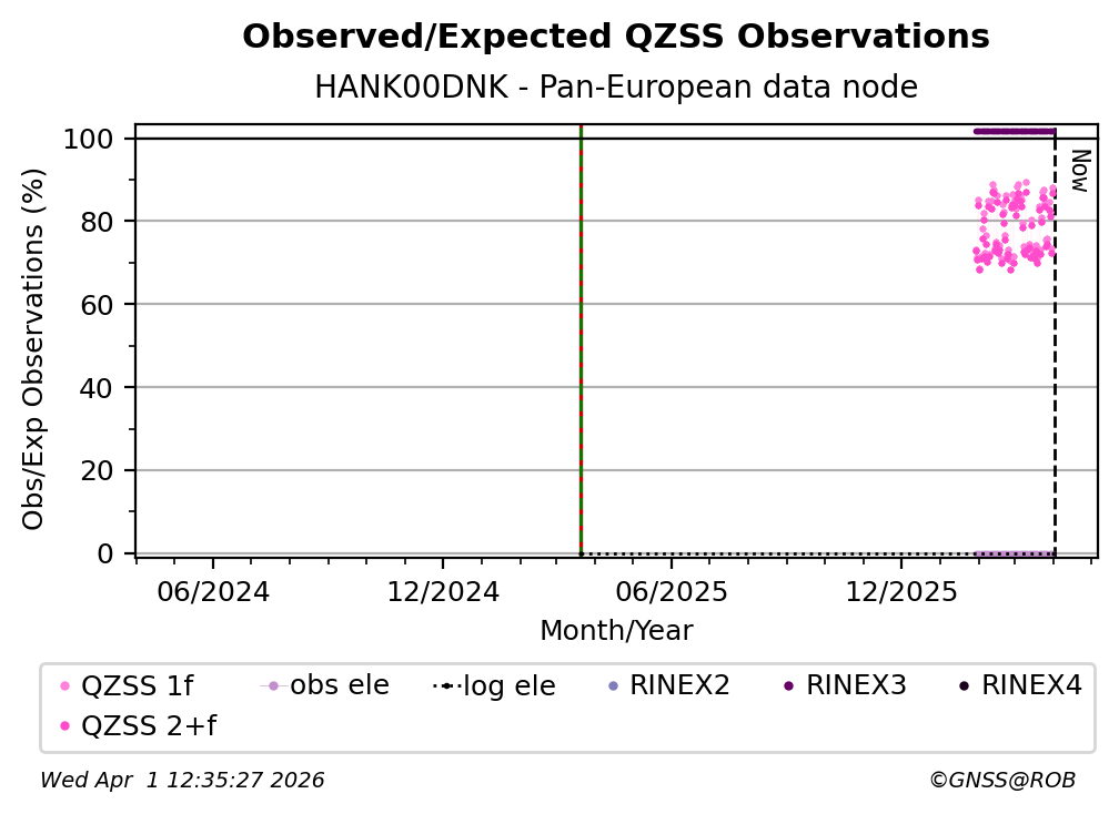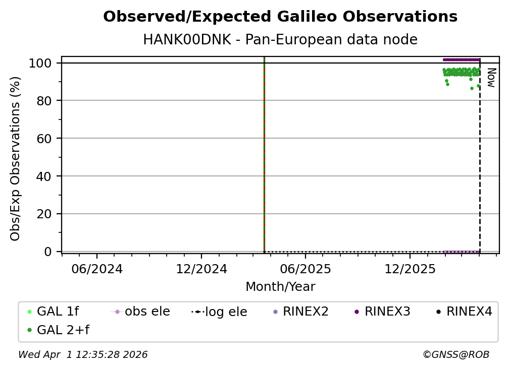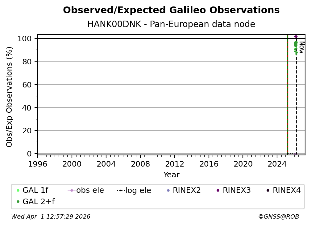 The percentage corresponds, for each constellation tracked by the station, to the ratio of the number of observations in the daily RINEX file with respect to the number of expected observations: