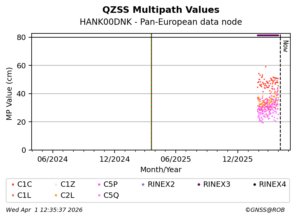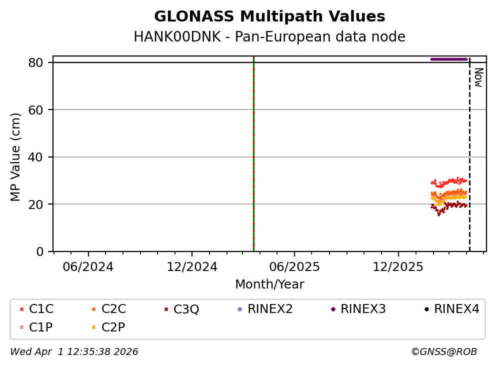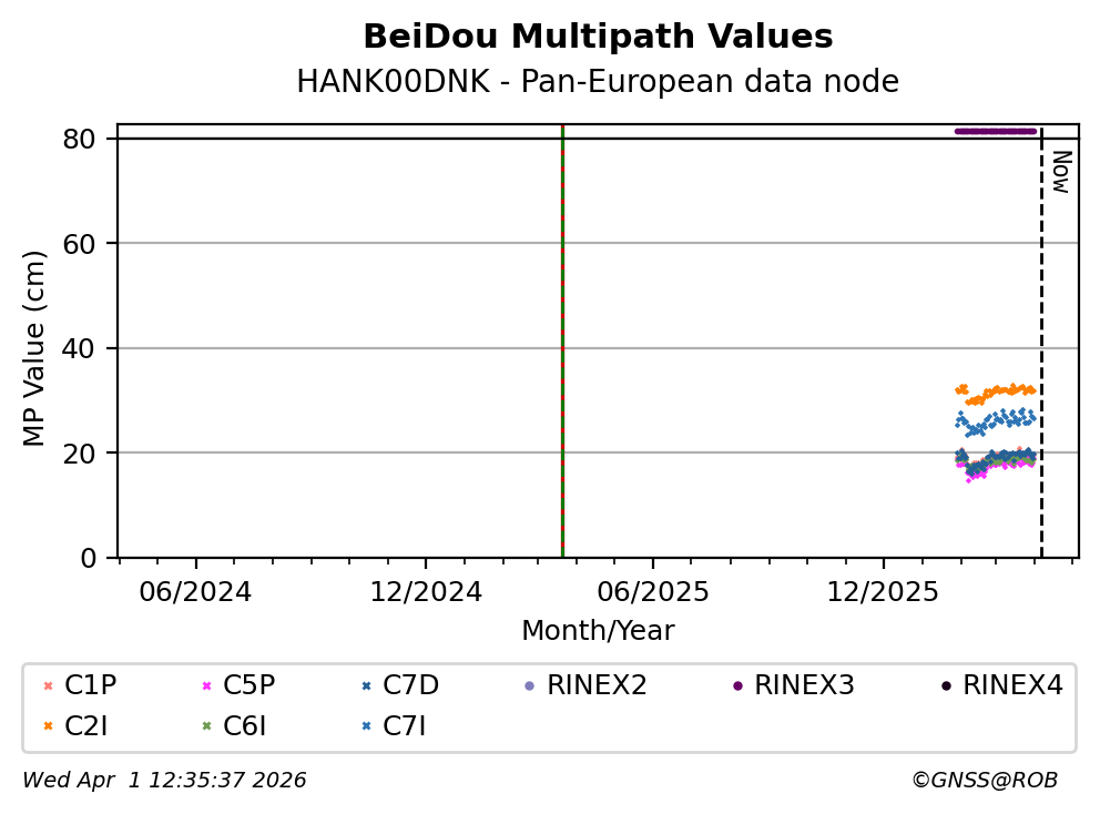 These plots display the daily mean of code multipath per frequency band and satellite constellation. Code multipath statistics are calculated for all pseudorange codes of all GNSS satellites providing dual-frequency carrier-phase observations. The code multipath characterizes the quality of the observed signal and the site environment.
