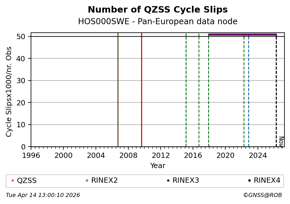 The plots below present the long-term tracking performance of the EPOS-GNSS station HOS000SWE based on the daily RINEX data available from the Pan-European EPOS-GNSS data node. The data quality metrics have been computed at the data node using the G-Nut/Anubis software.