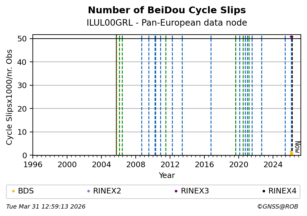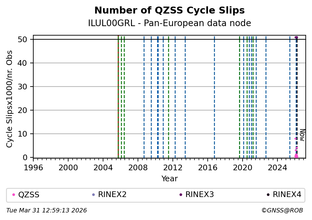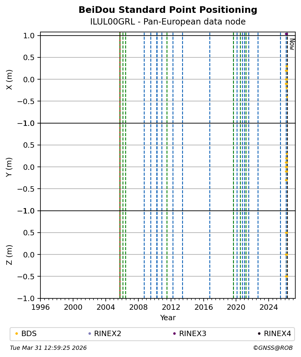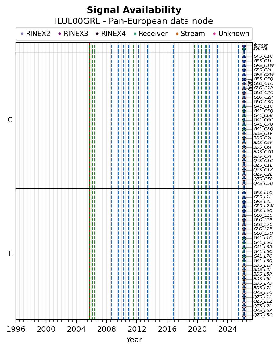 Red vertical lines, green and blue vertical dotted lines indicate respectively a change of antenna, receiver or receiver configuration (including firmware) as indicated by the station manager in the station site log available from the M3G GNSS Metadata Catalog. The purple points in the top of the plot indicate the daily RINEX data availability at the data node.