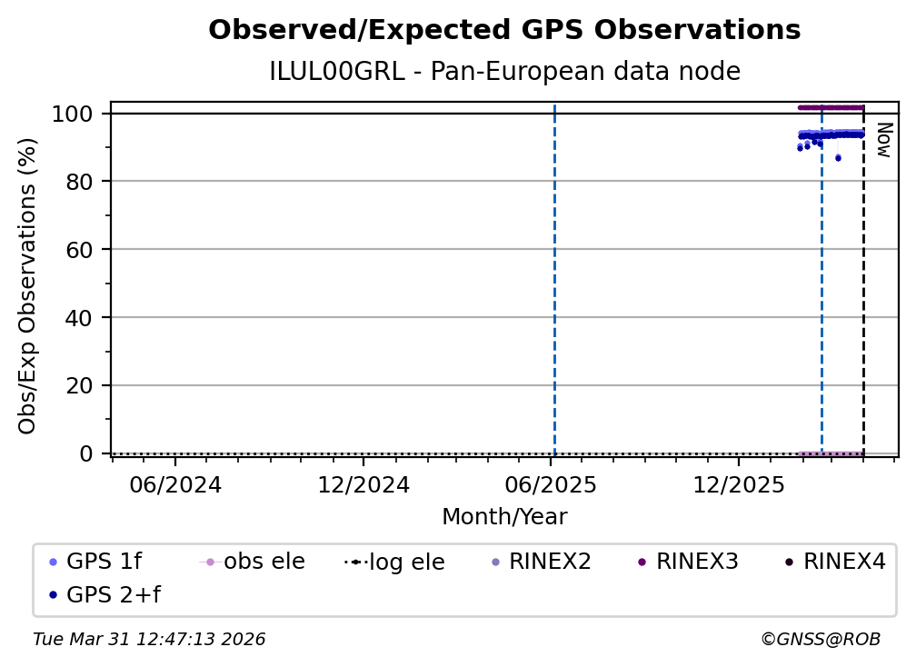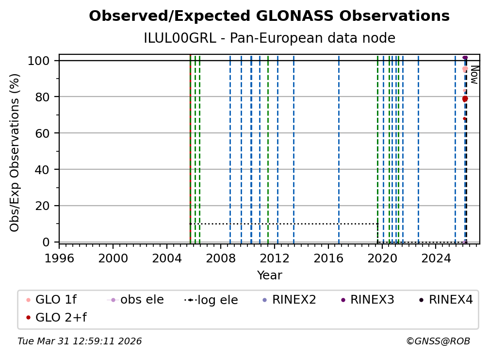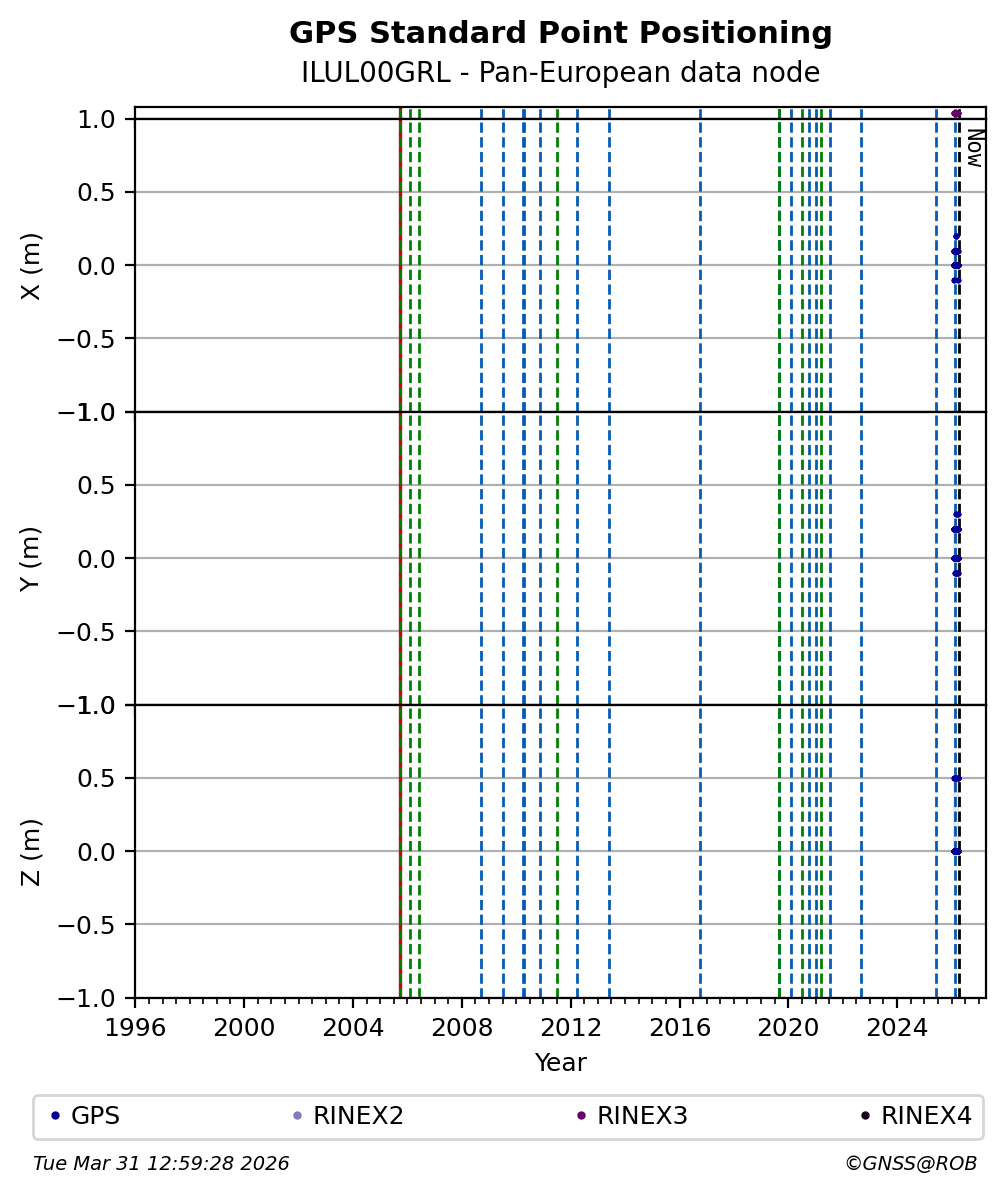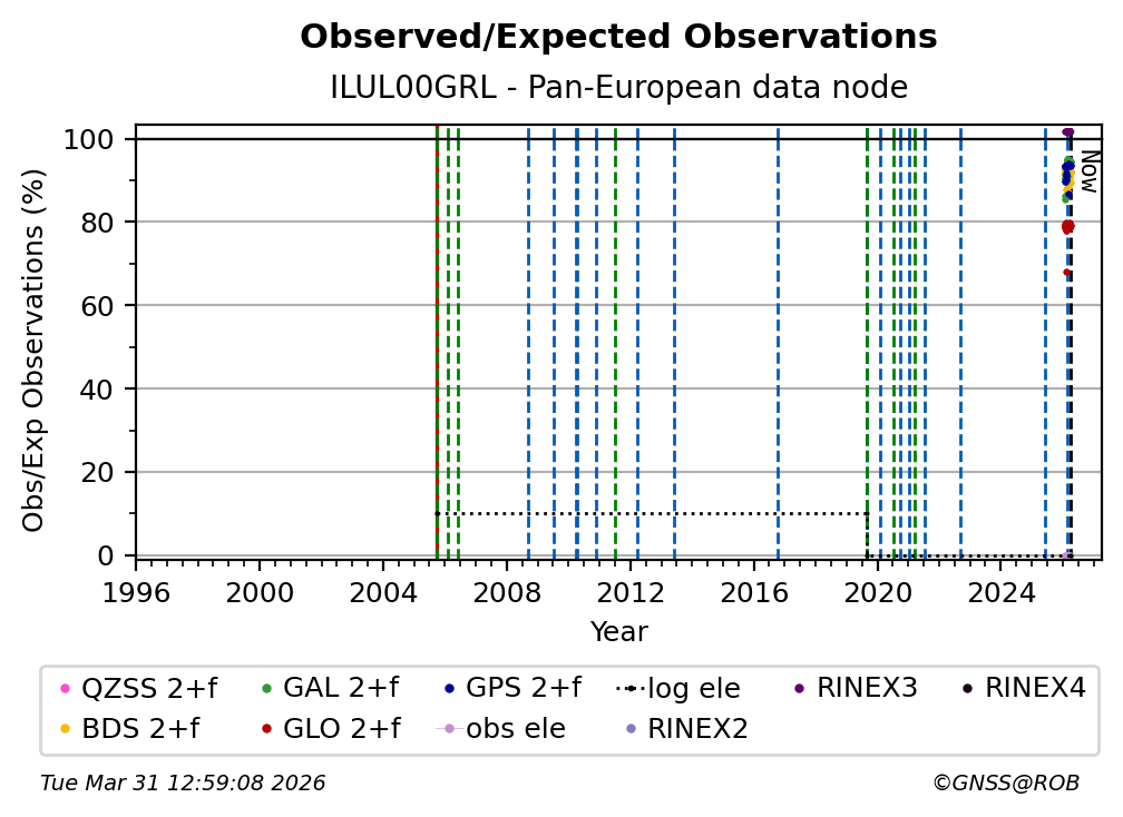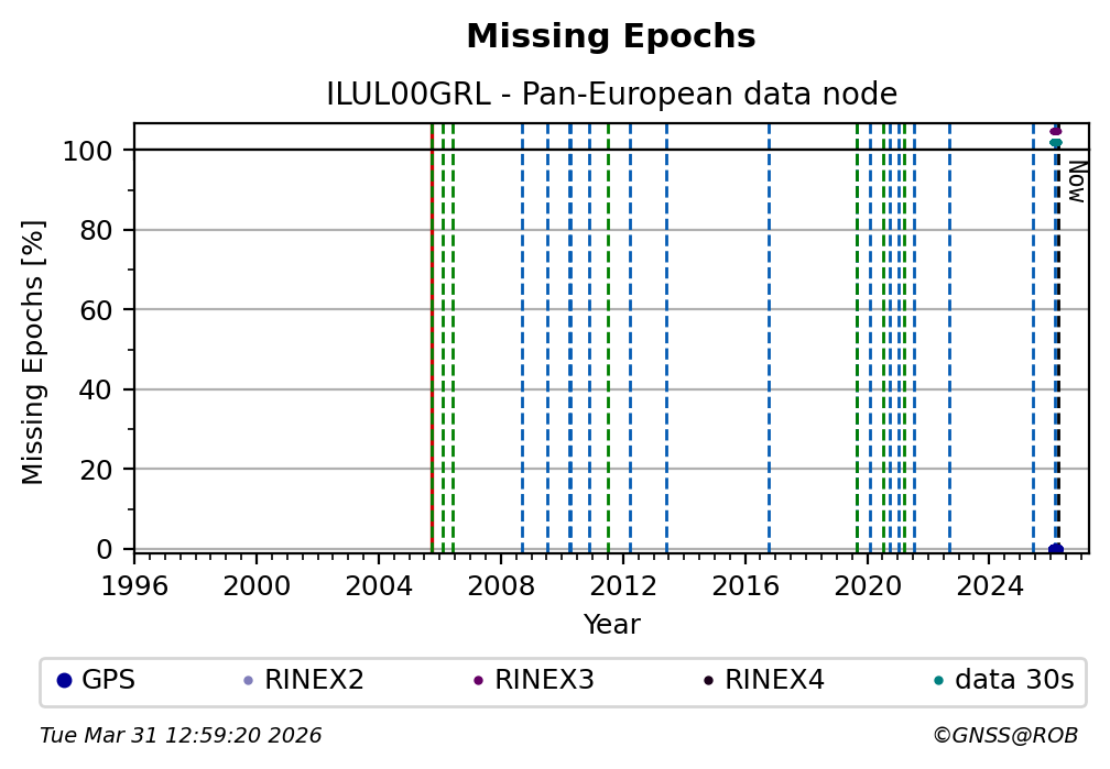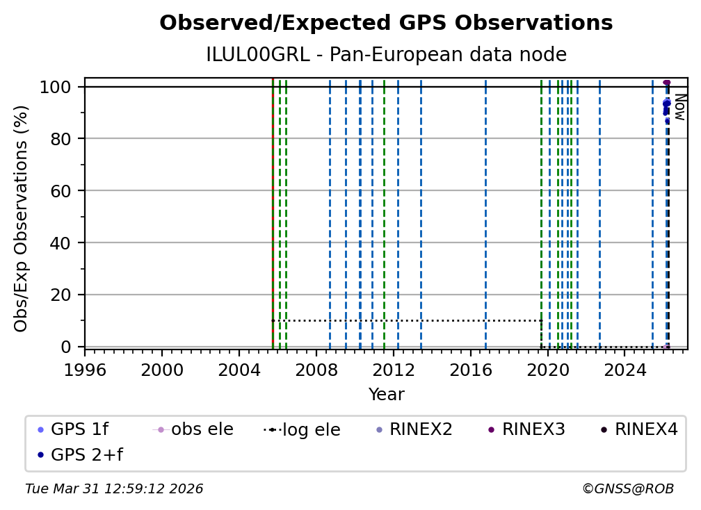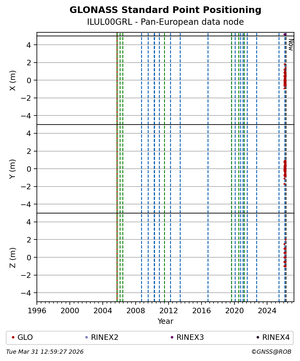 The plots below present the long-term tracking performance of the EPOS-GNSS station ILUL00GRL based on the daily RINEX data available from the Pan-European EPOS-GNSS data node. The data quality metrics have been computed at the data node using the G-Nut/Anubis software.