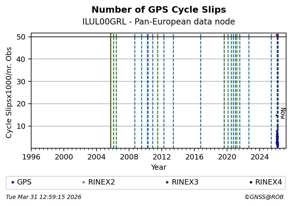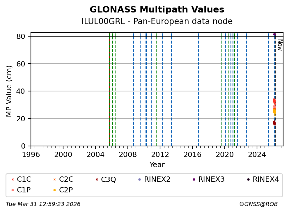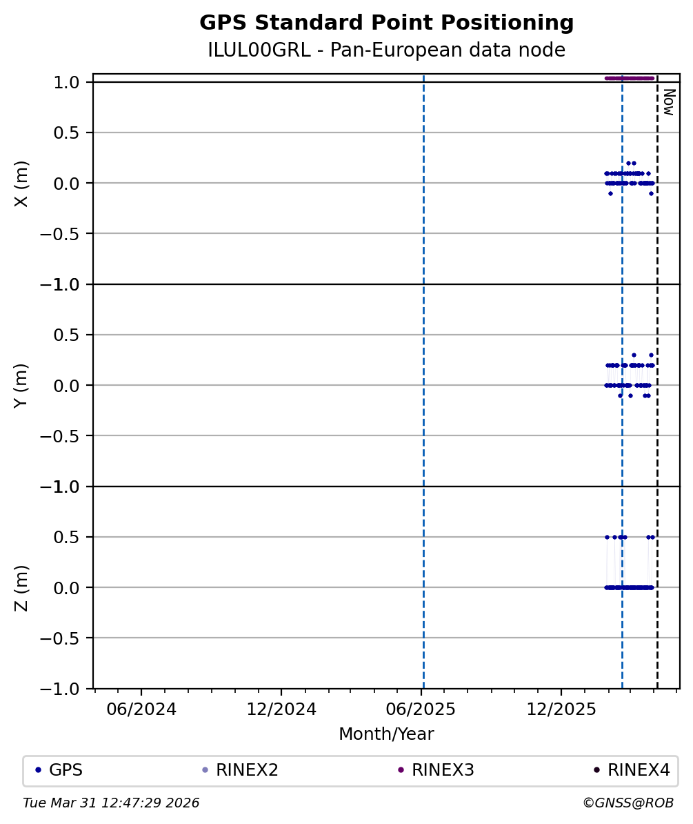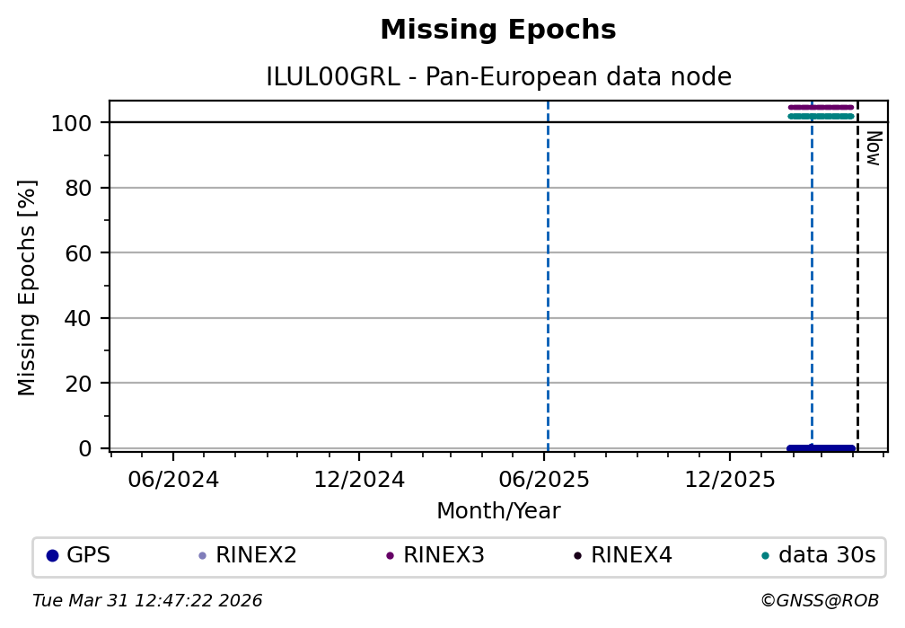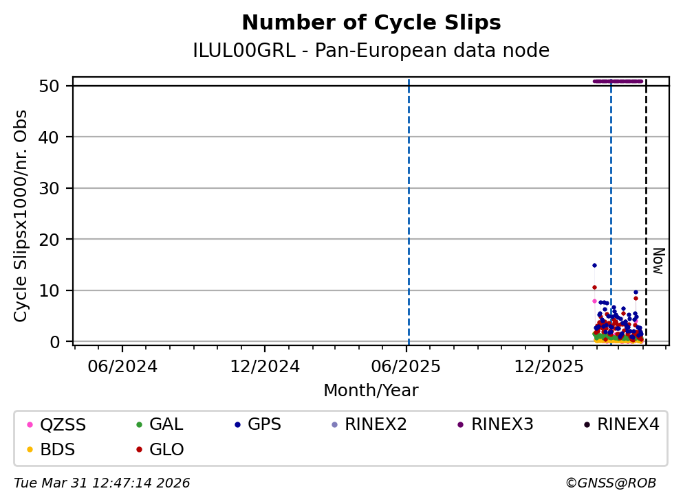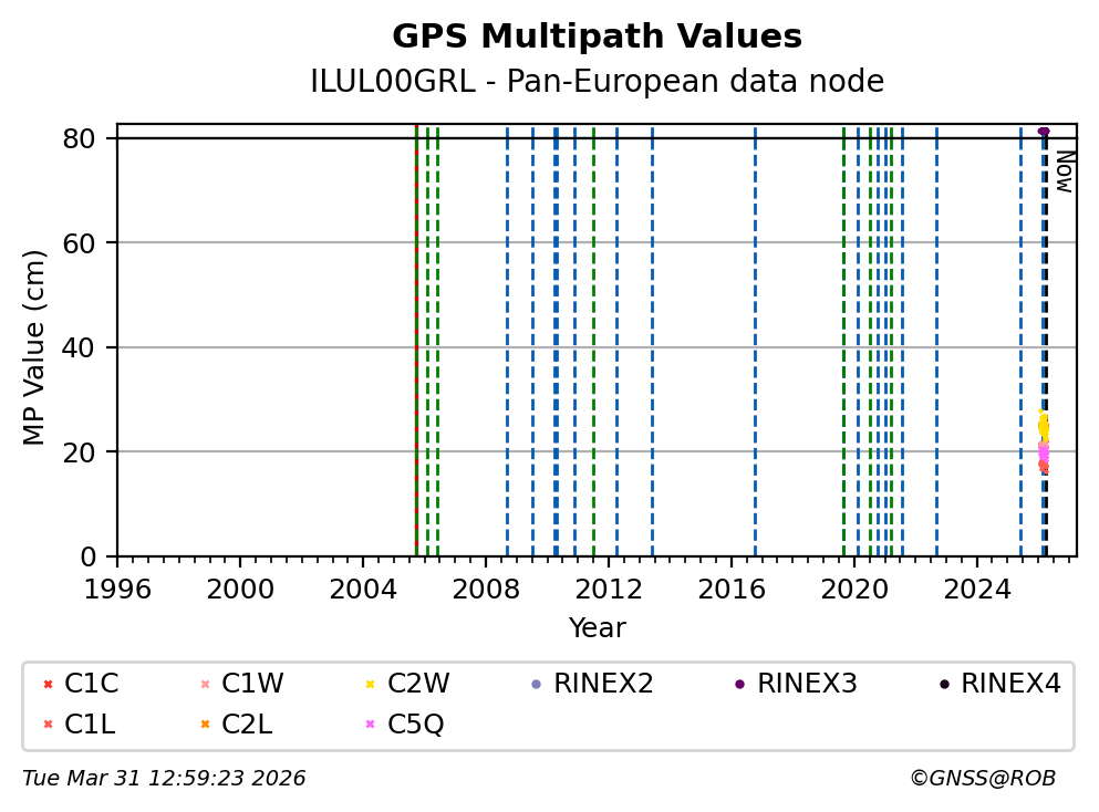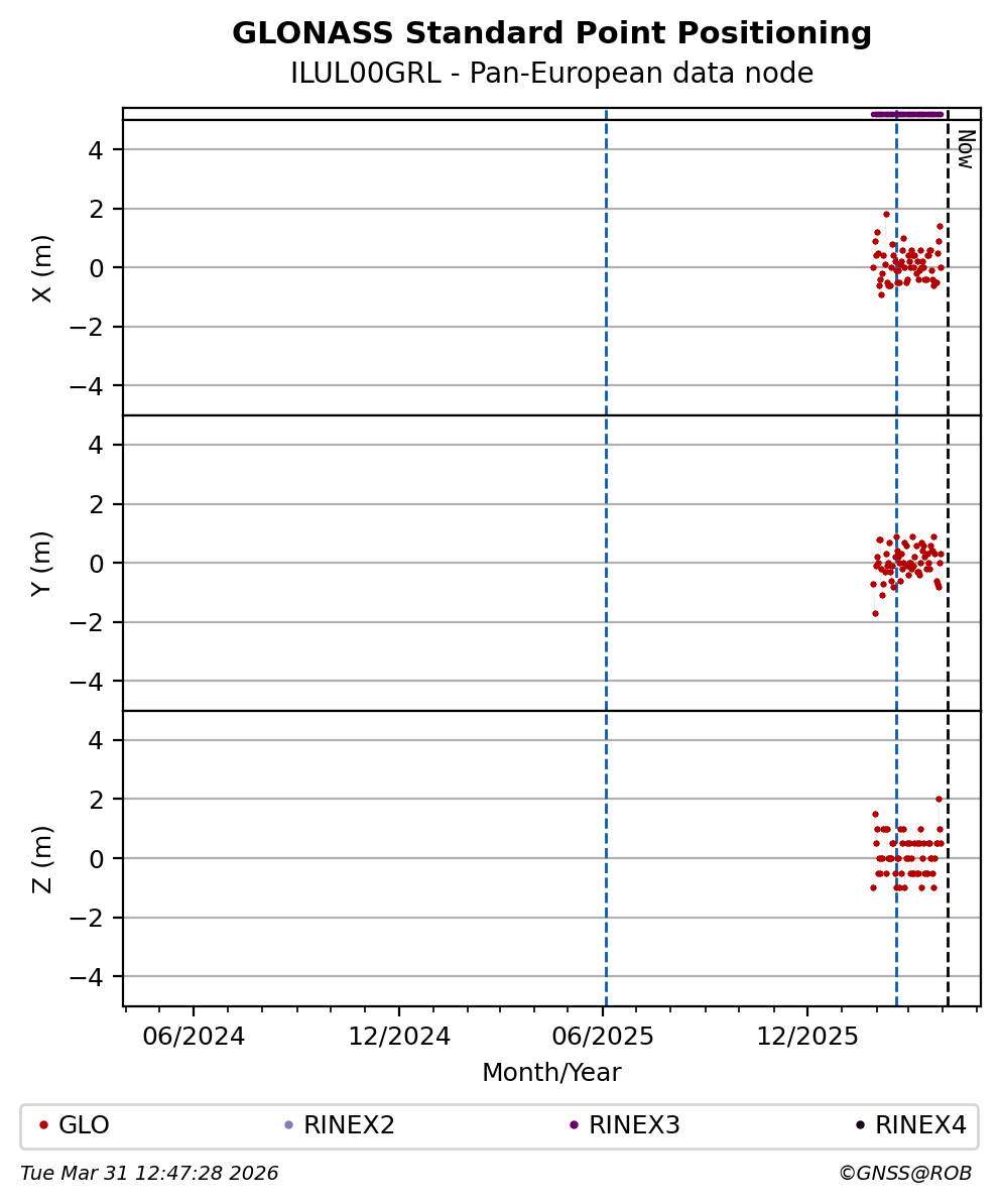 The plots below present the long-term tracking performance of the EPOS-GNSS station ILUL00GRL based on the daily RINEX data available from the Pan-European EPOS-GNSS data node. The data quality metrics have been computed at the data node using the G-Nut/Anubis software.