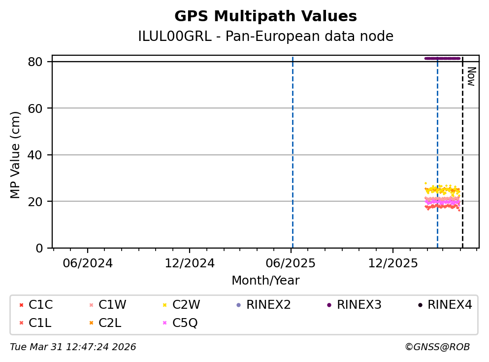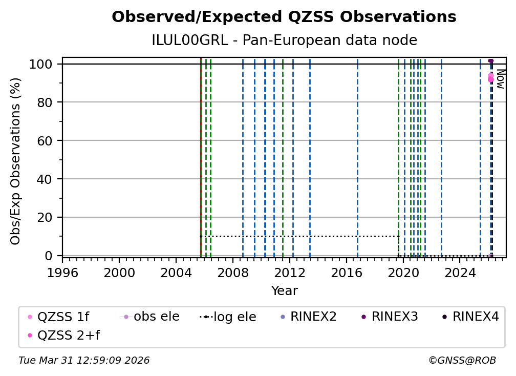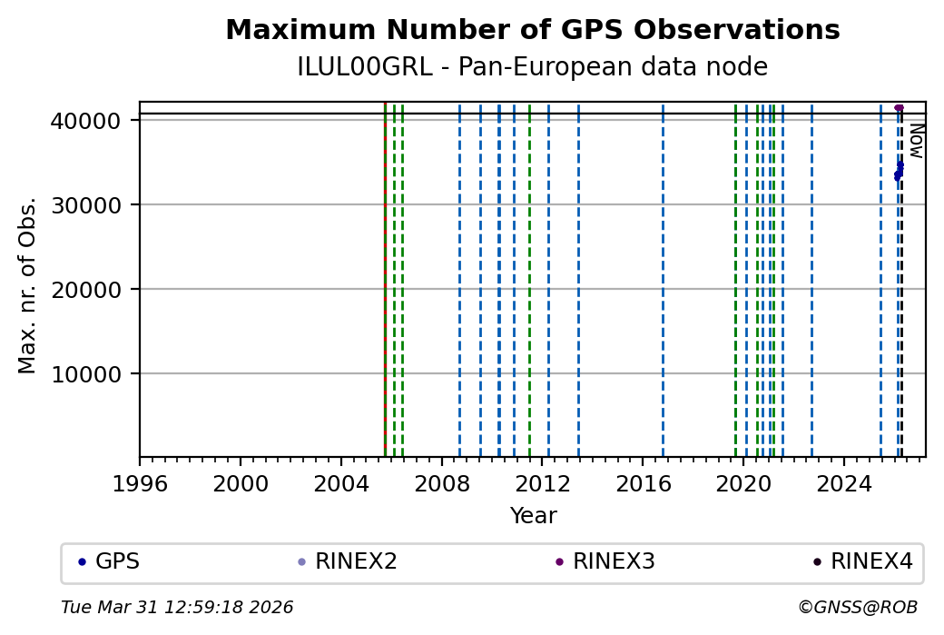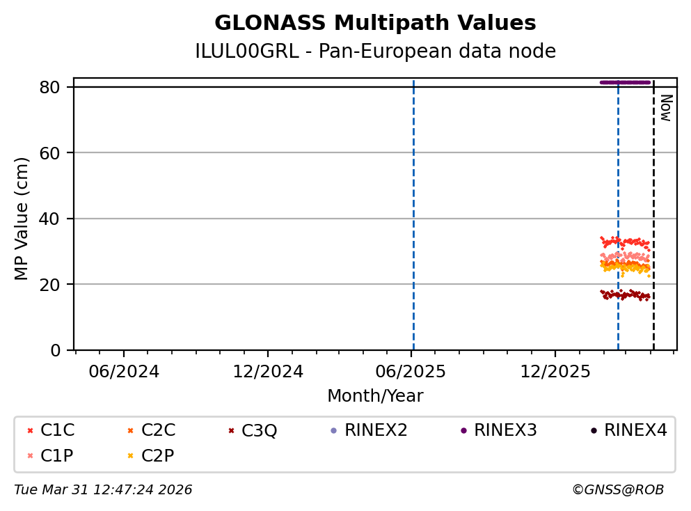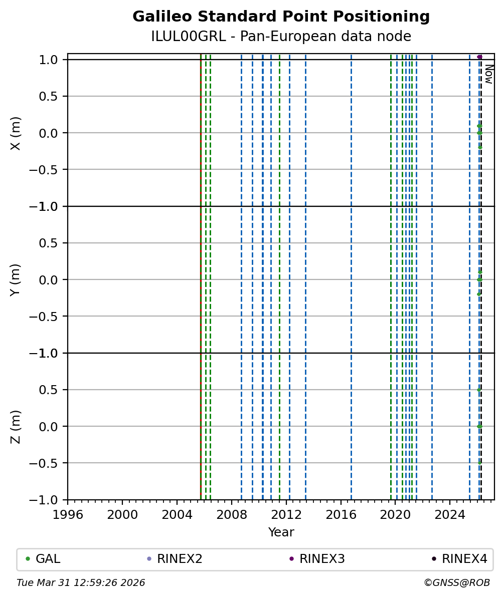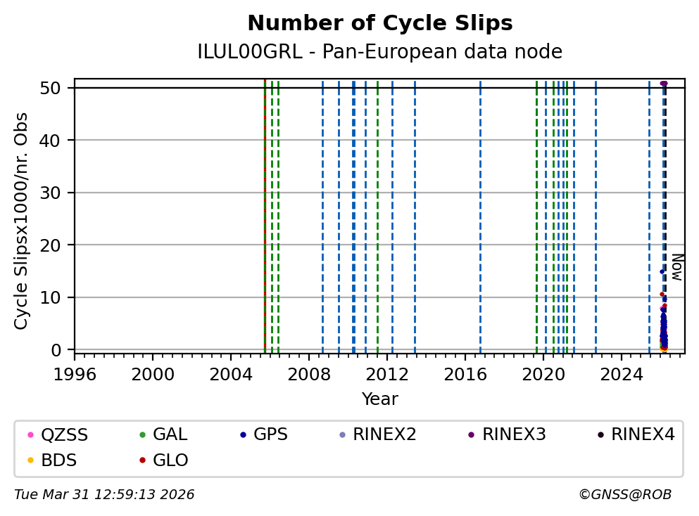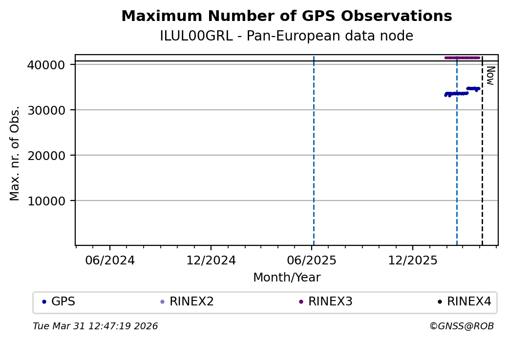 The plots below present the long-term tracking performance of the EPOS-GNSS station ILUL00GRL based on the daily RINEX data available from the Pan-European EPOS-GNSS data node. The data quality metrics have been computed at the data node using the G-Nut/Anubis software.