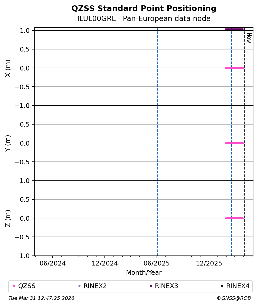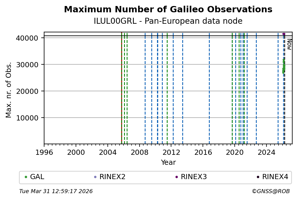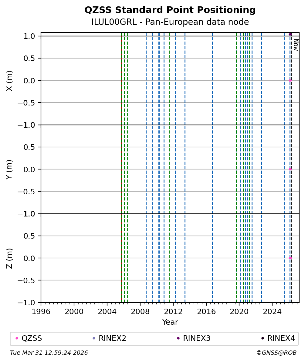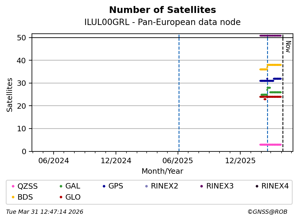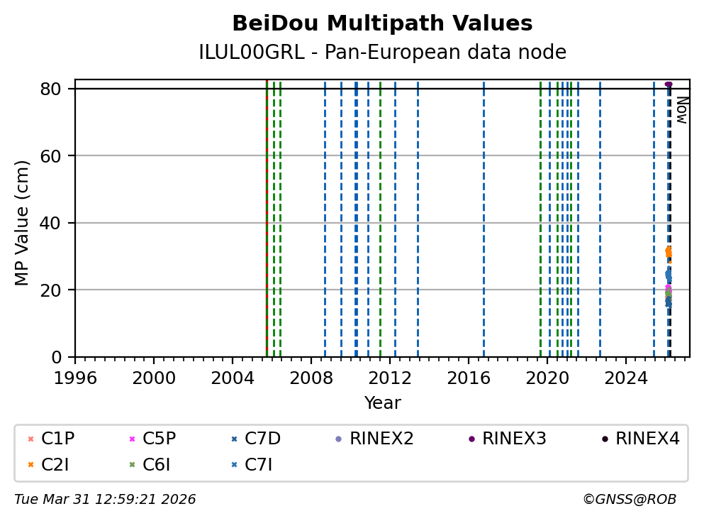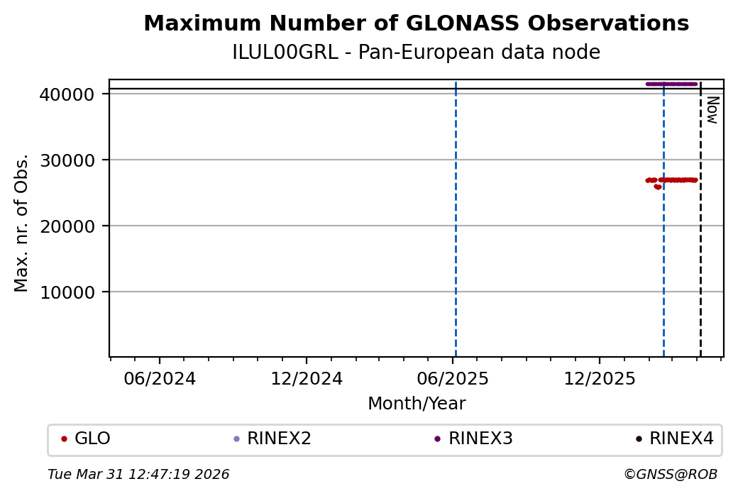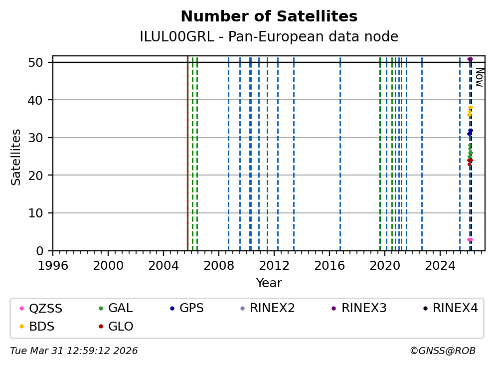The plots below present the long-term tracking performance of the EPOS-GNSS station ILUL00GRL based on the daily RINEX data available from the Pan-European EPOS-GNSS data node. The data quality metrics have been computed at the data node using the G-Nut/Anubis software.