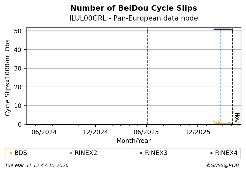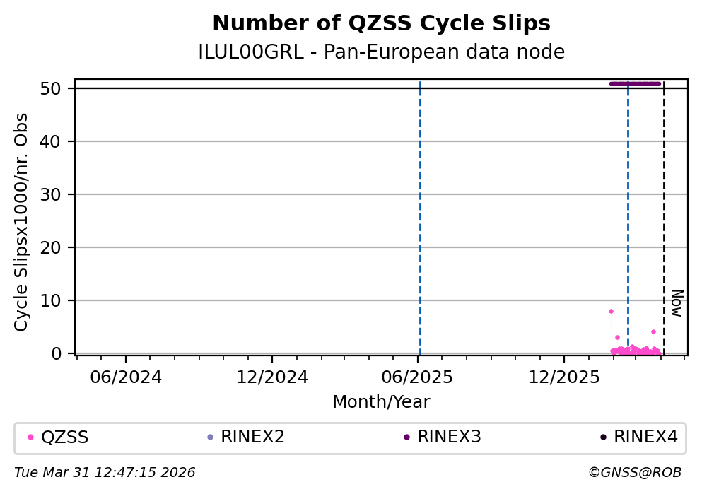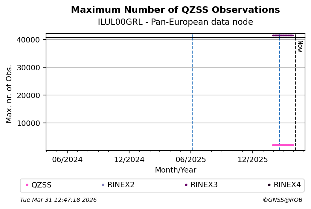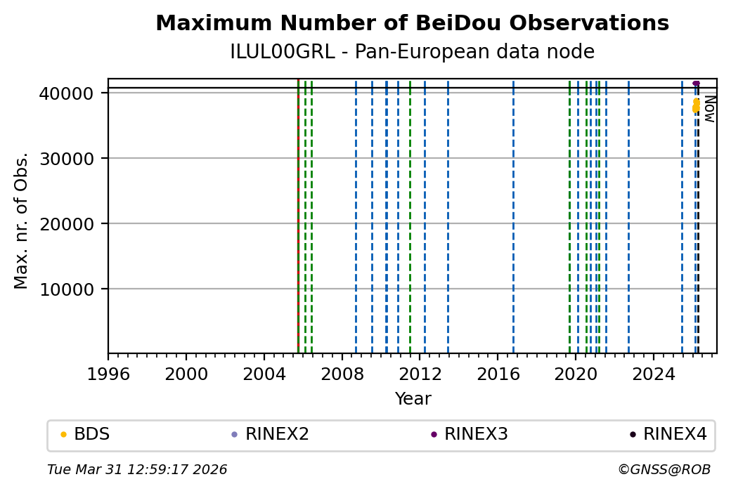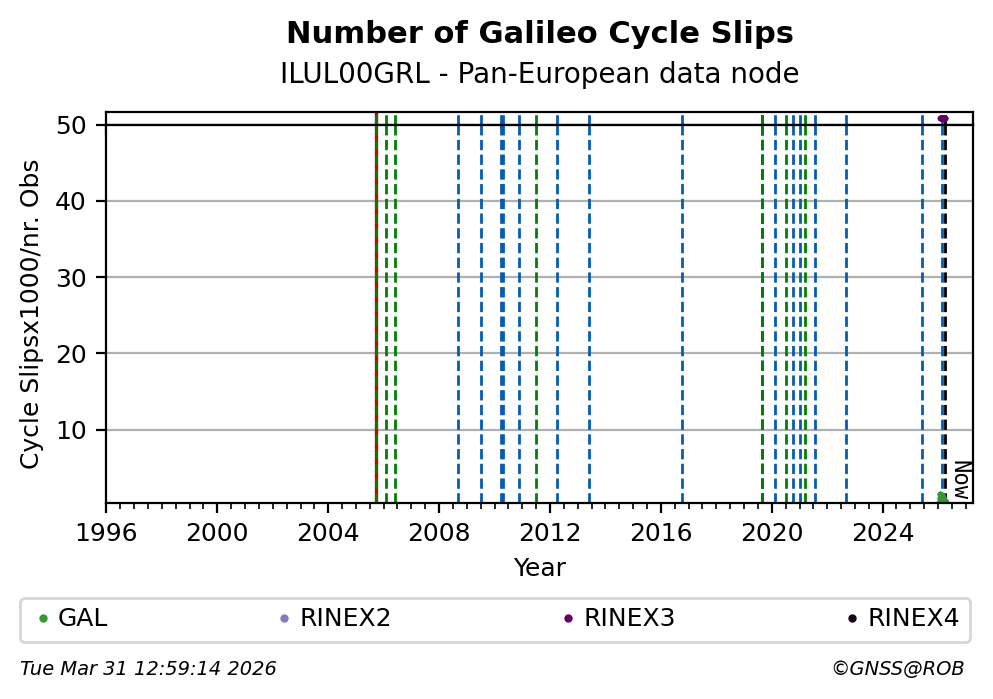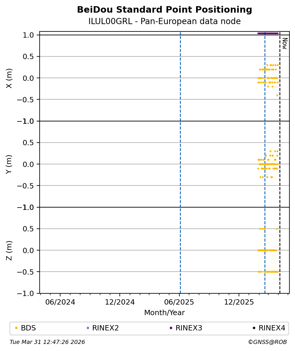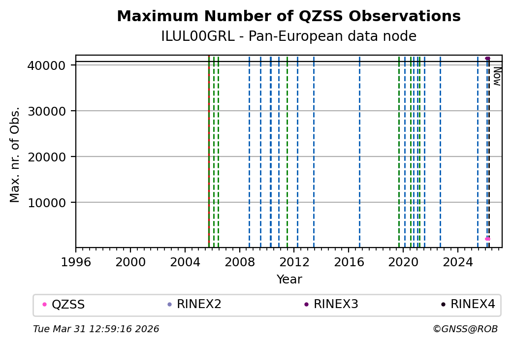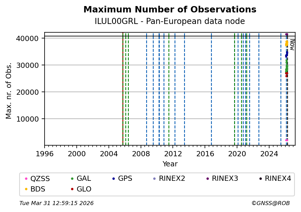 The plots below present the long-term tracking performance of the EPOS-GNSS station ILUL00GRL based on the daily RINEX data available from the Pan-European EPOS-GNSS data node. The data quality metrics have been computed at the data node using the G-Nut/Anubis software.