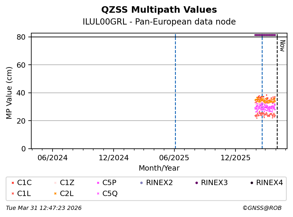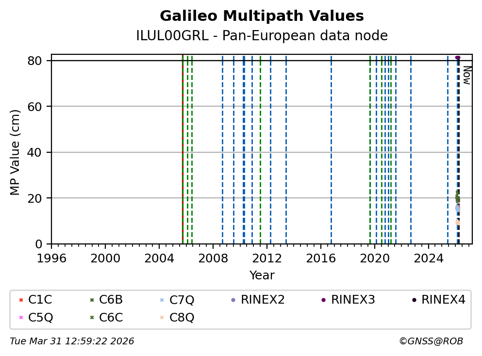 These plots display the daily mean of code multipath per frequency band and satellite constellation. Code multipath statistics are calculated for all pseudorange codes of all GNSS satellites providing dual-frequency carrier-phase observations. The code multipath characterizes the quality of the observed signal and the site environment.