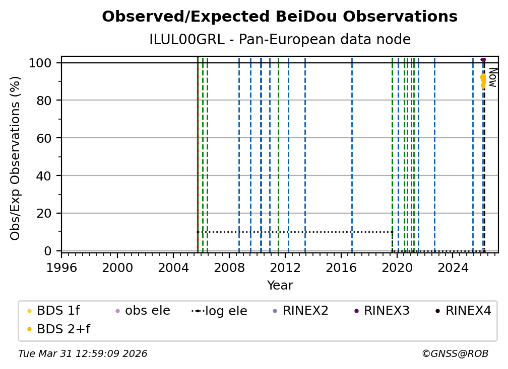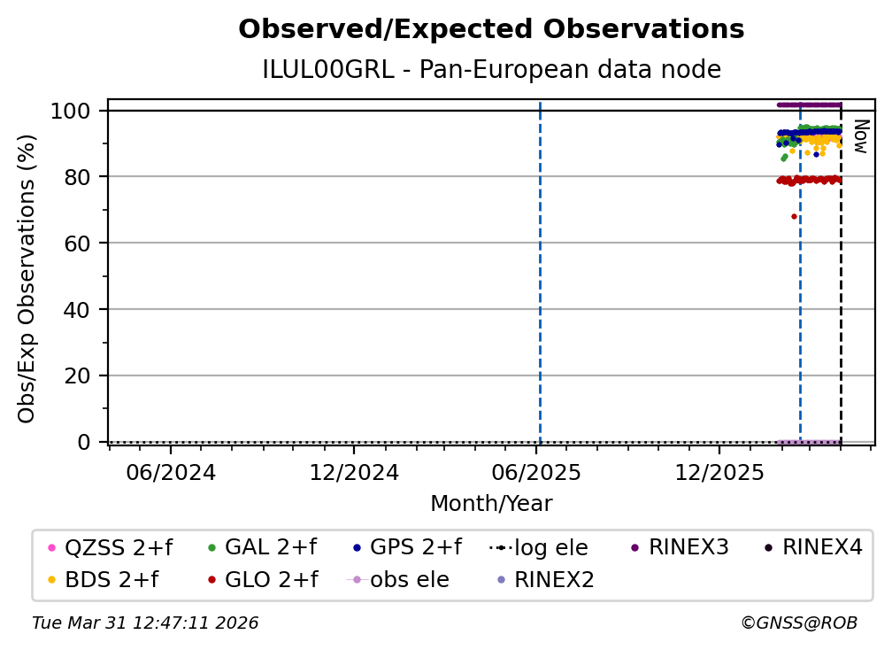 The percentage corresponds, for each constellation tracked by the station, to the ratio of the number of observations in the daily RINEX file with respect to the number of expected observations: