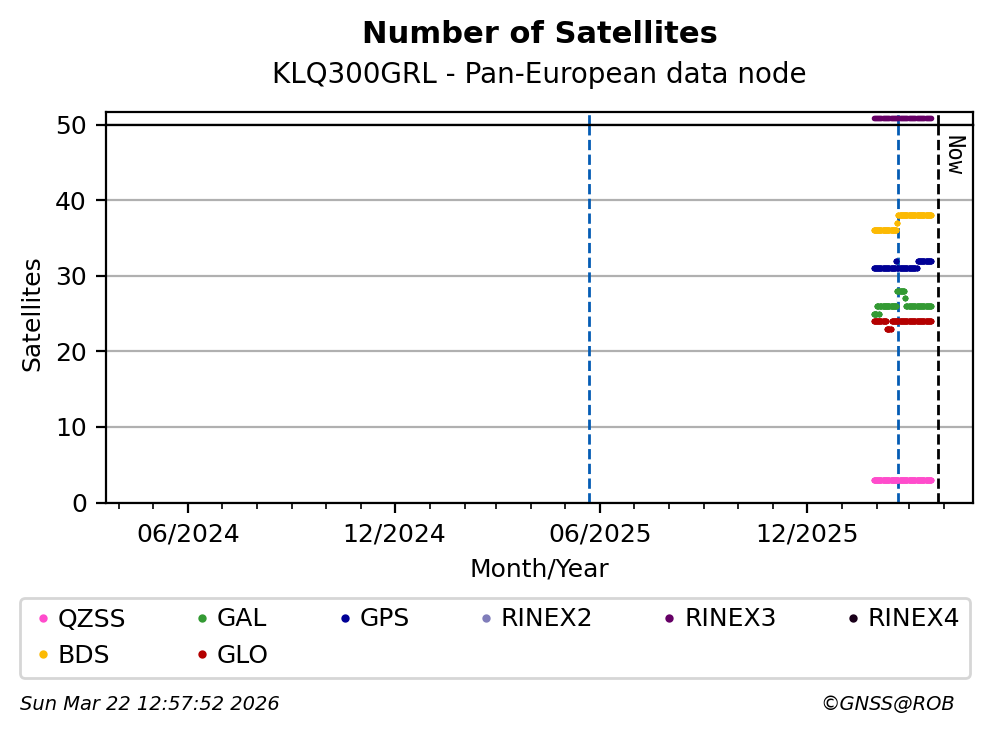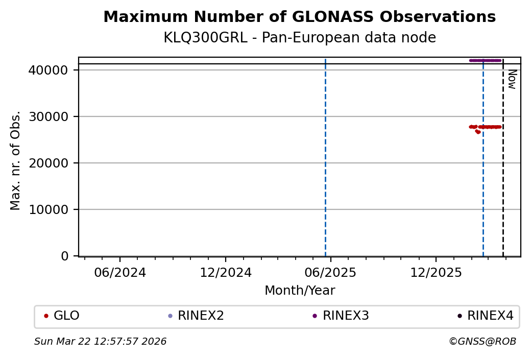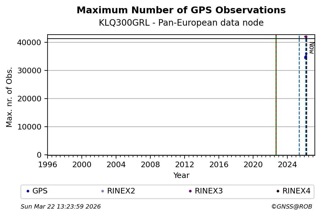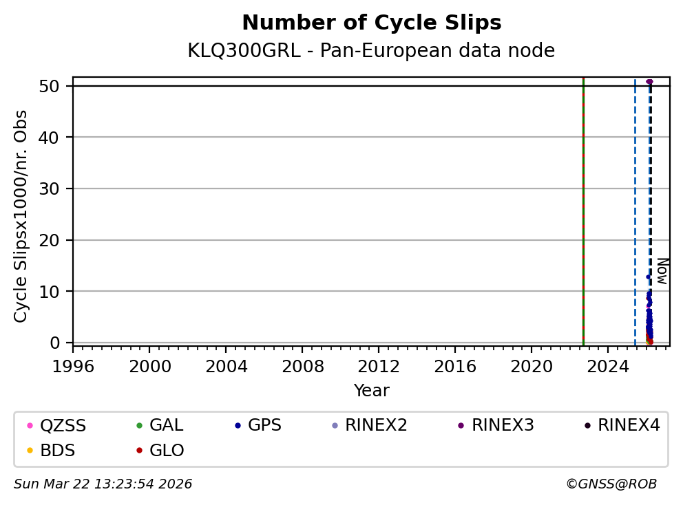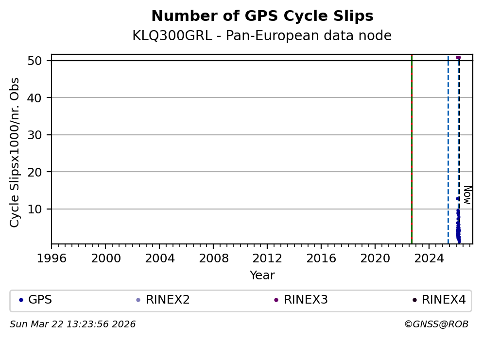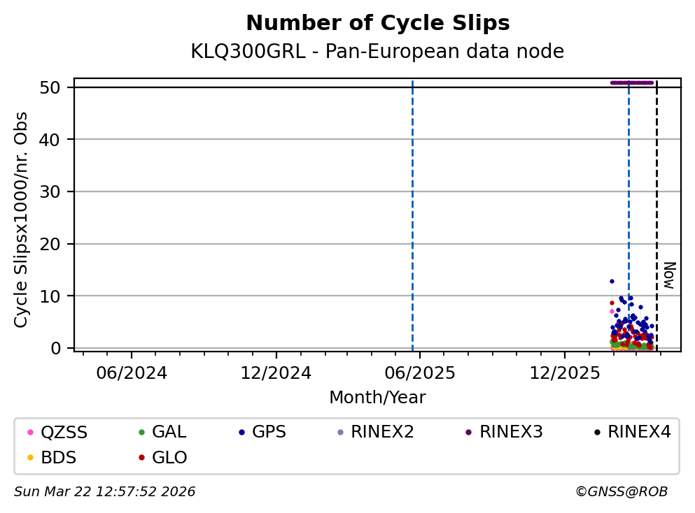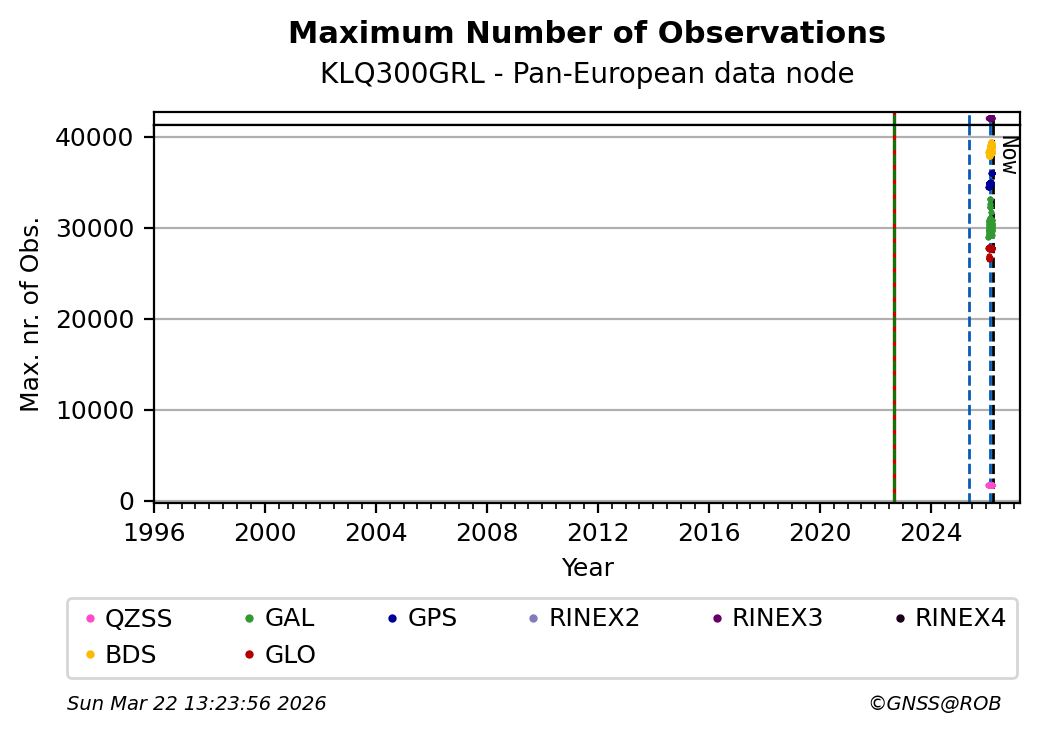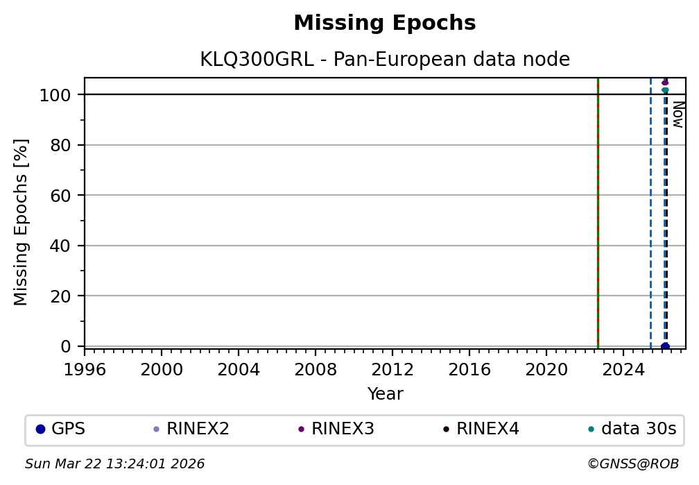 The plots below present the long-term tracking performance of the EPOS-GNSS station KLQ300GRL based on the daily RINEX data available from the Pan-European EPOS-GNSS data node. The data quality metrics have been computed at the data node using the G-Nut/Anubis software.