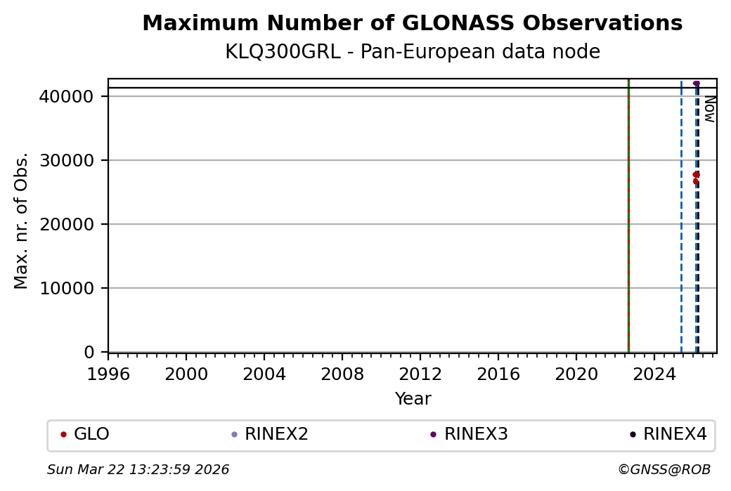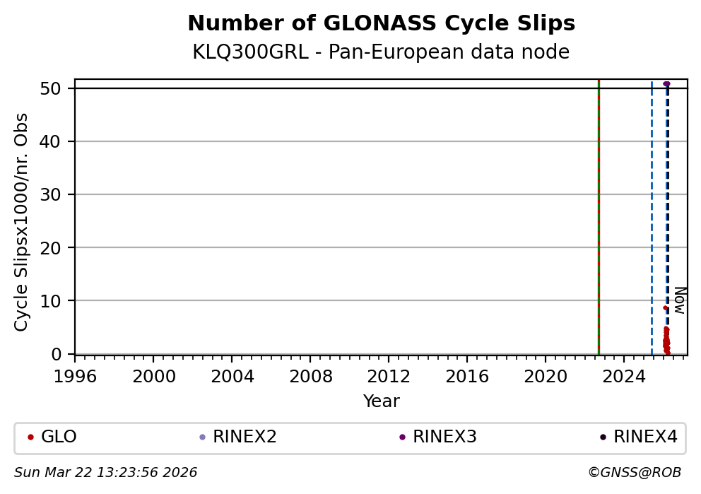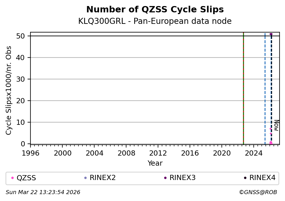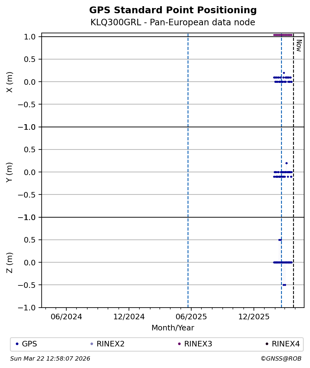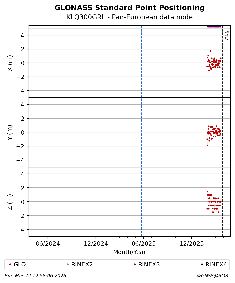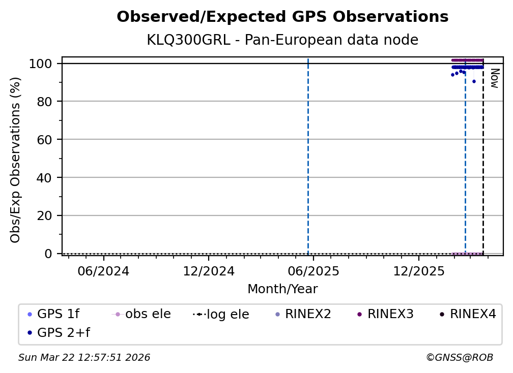 The plots below present the long-term tracking performance of the EPOS-GNSS station KLQ300GRL based on the daily RINEX data available from the Pan-European EPOS-GNSS data node. The data quality metrics have been computed at the data node using the G-Nut/Anubis software.