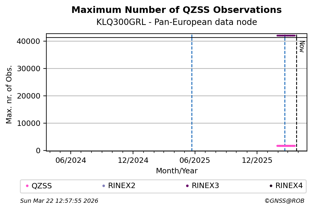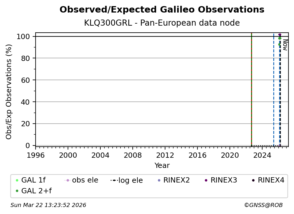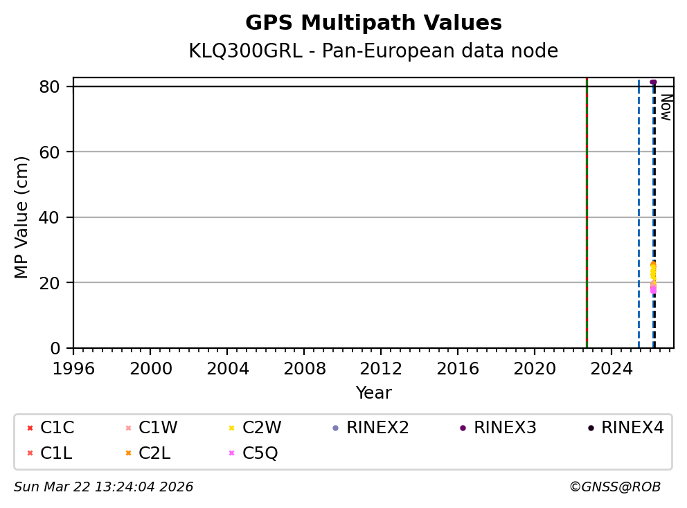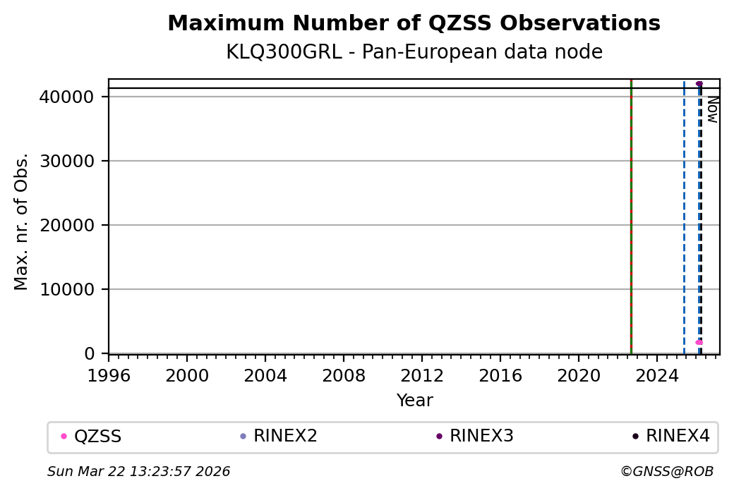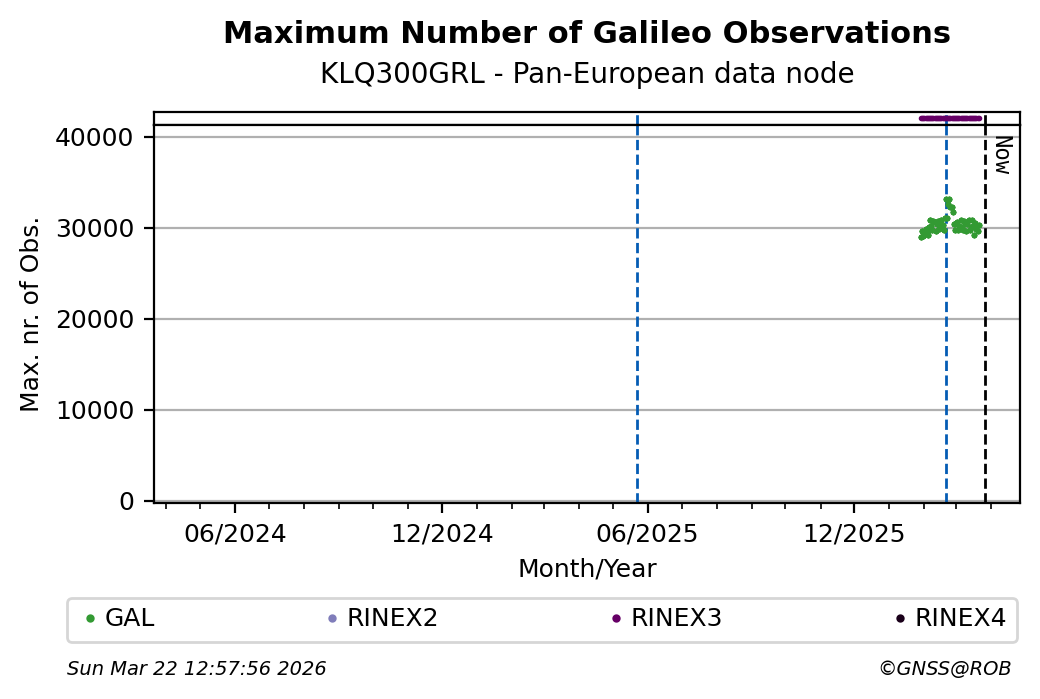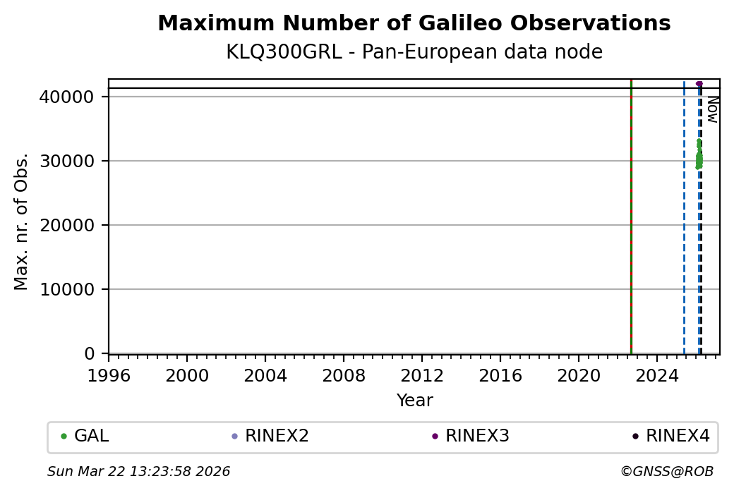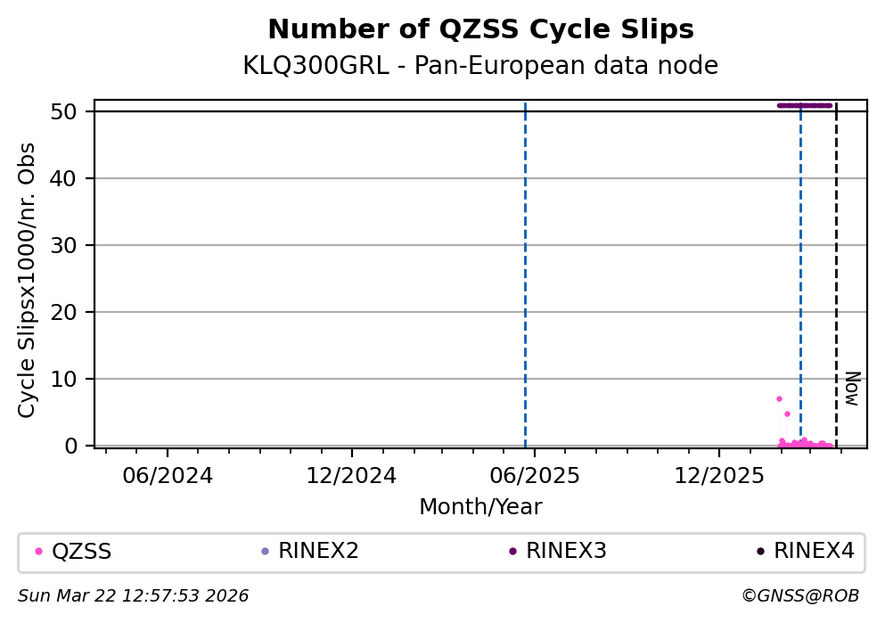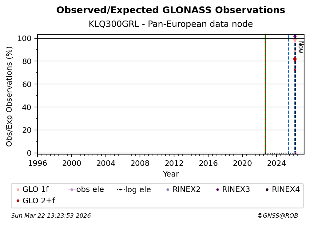 The plots below present the long-term tracking performance of the EPOS-GNSS station KLQ300GRL based on the daily RINEX data available from the Pan-European EPOS-GNSS data node. The data quality metrics have been computed at the data node using the G-Nut/Anubis software.