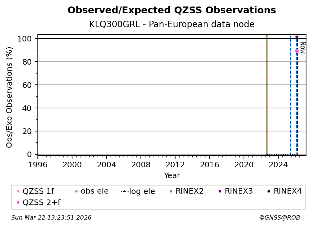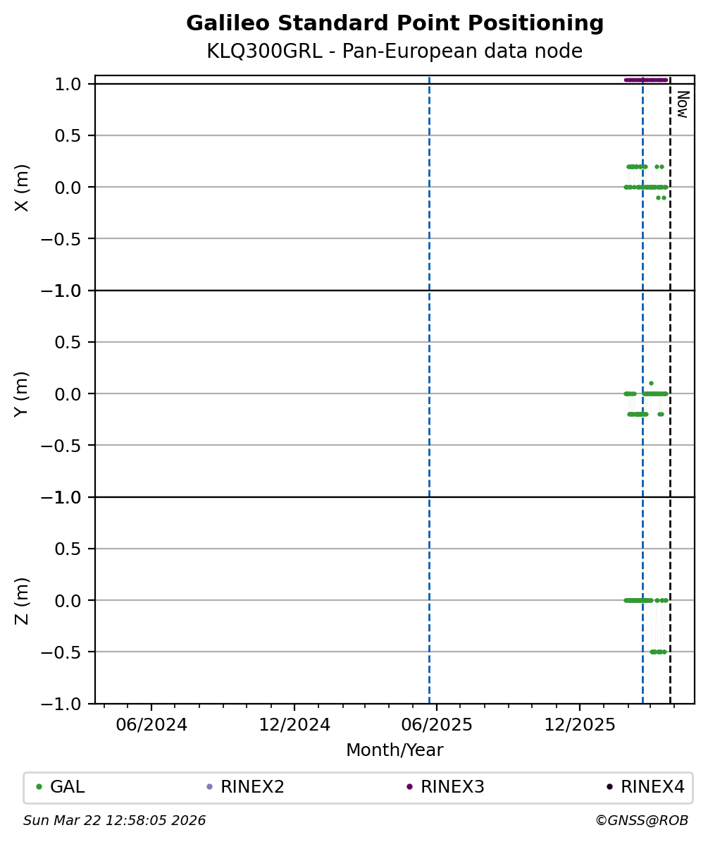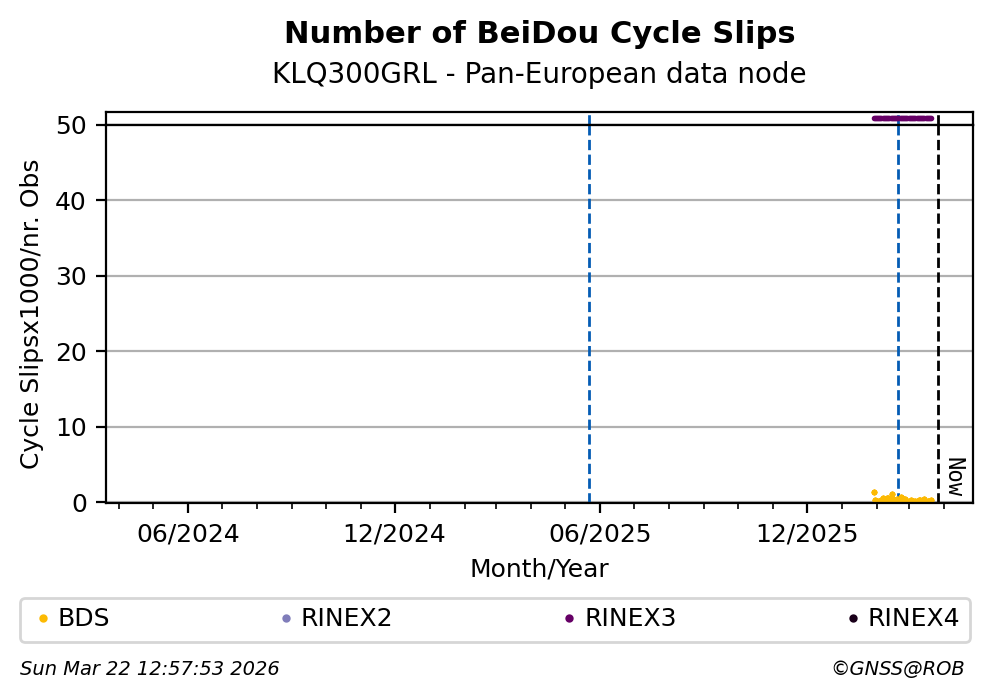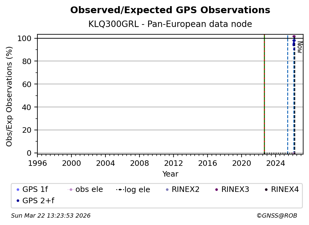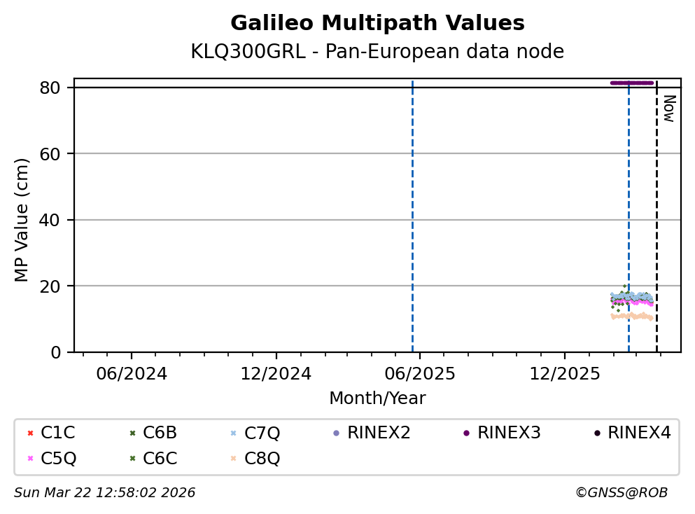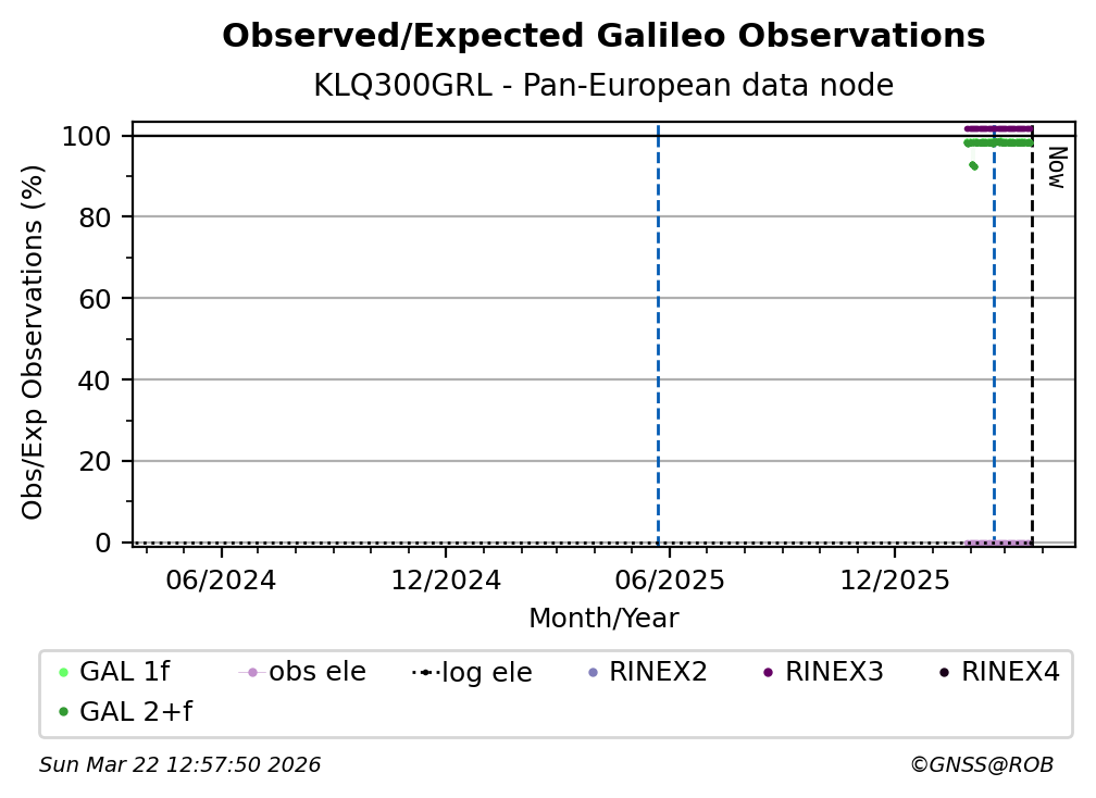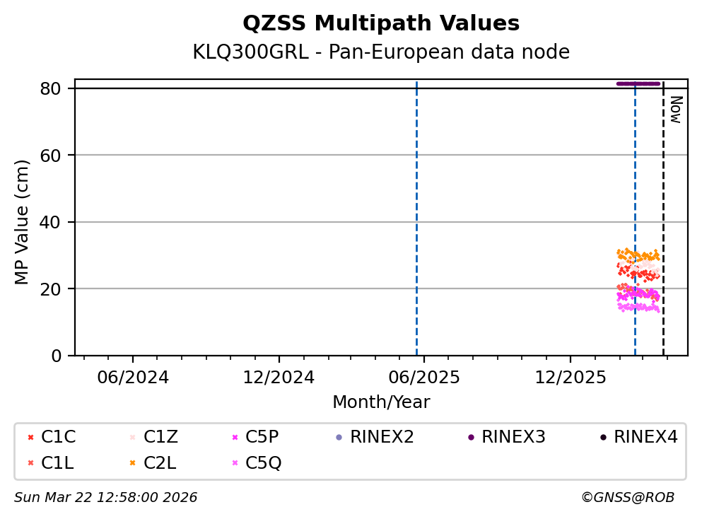 The plots below present the long-term tracking performance of the EPOS-GNSS station KLQ300GRL based on the daily RINEX data available from the Pan-European EPOS-GNSS data node. The data quality metrics have been computed at the data node using the G-Nut/Anubis software.