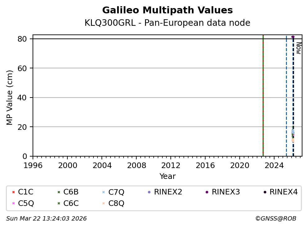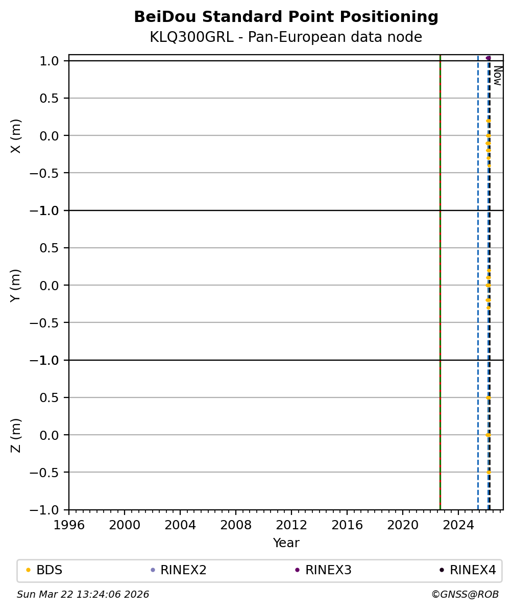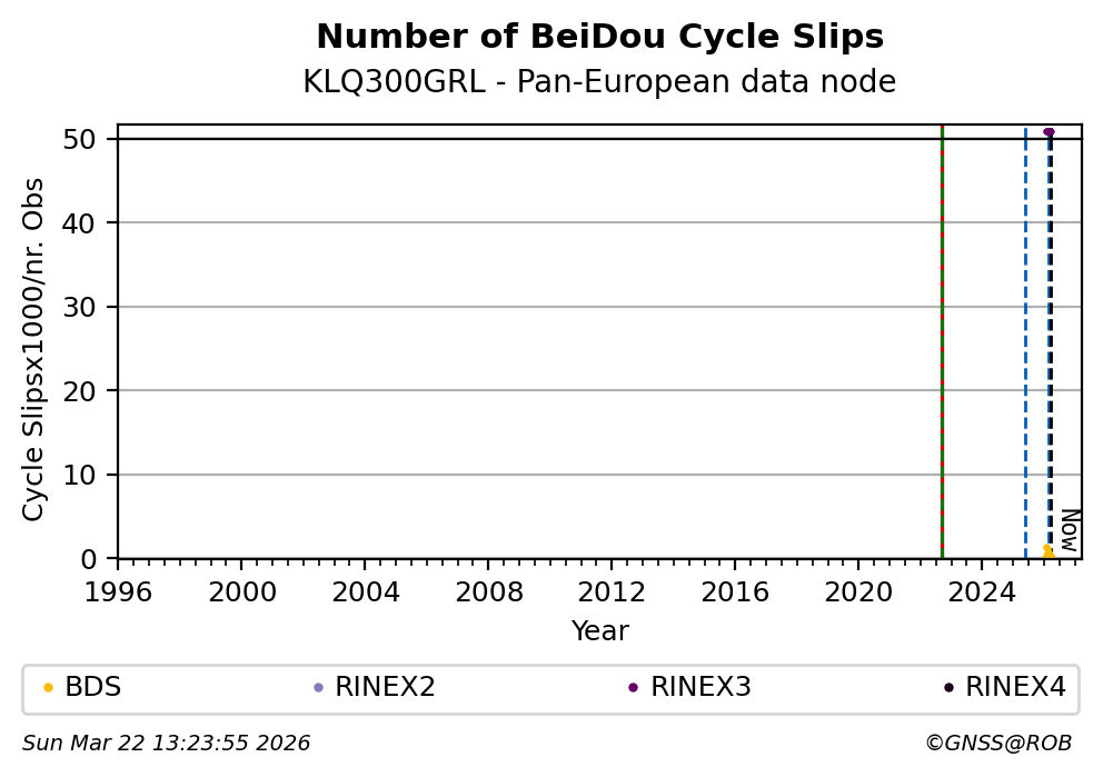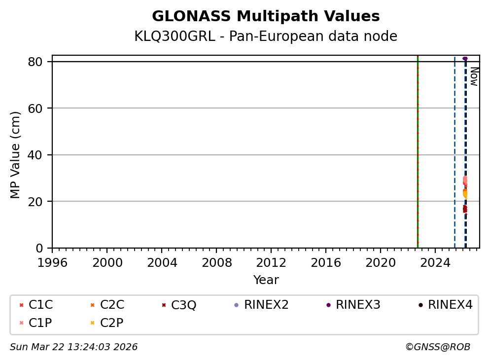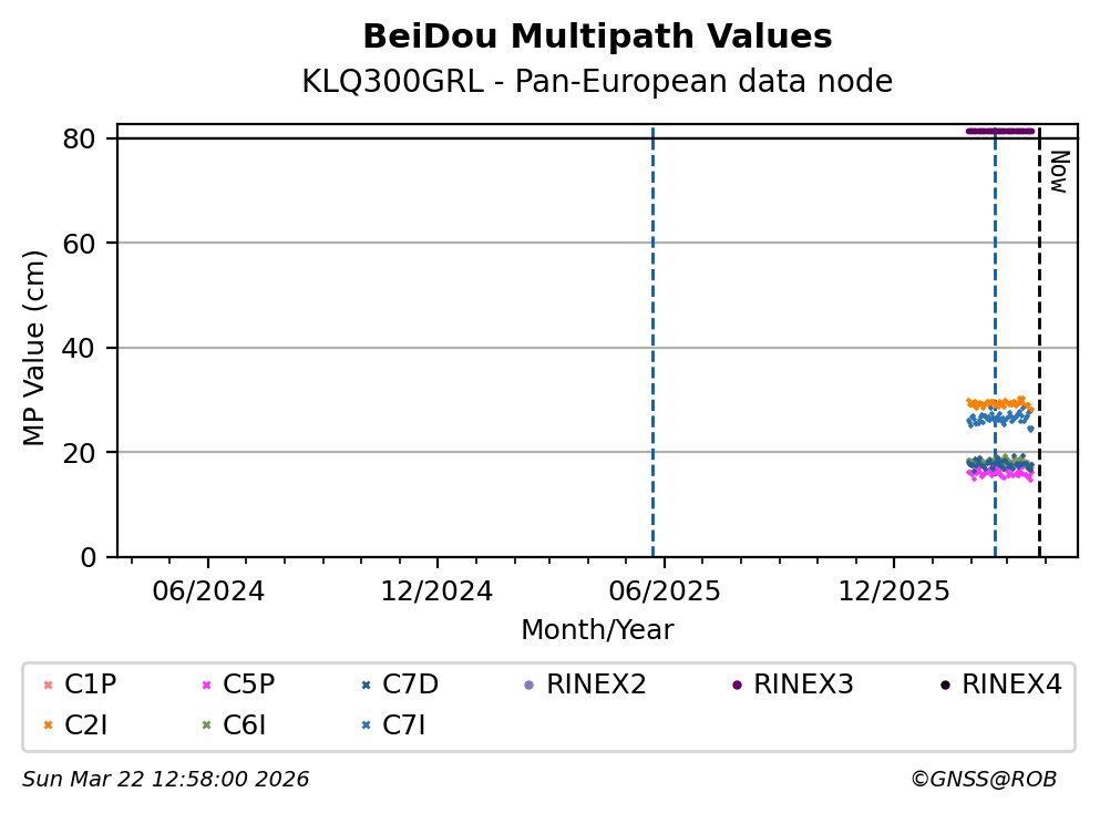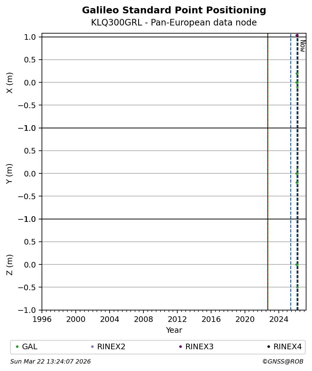 The plots below present the long-term tracking performance of the EPOS-GNSS station KLQ300GRL based on the daily RINEX data available from the Pan-European EPOS-GNSS data node. The data quality metrics have been computed at the data node using the G-Nut/Anubis software.