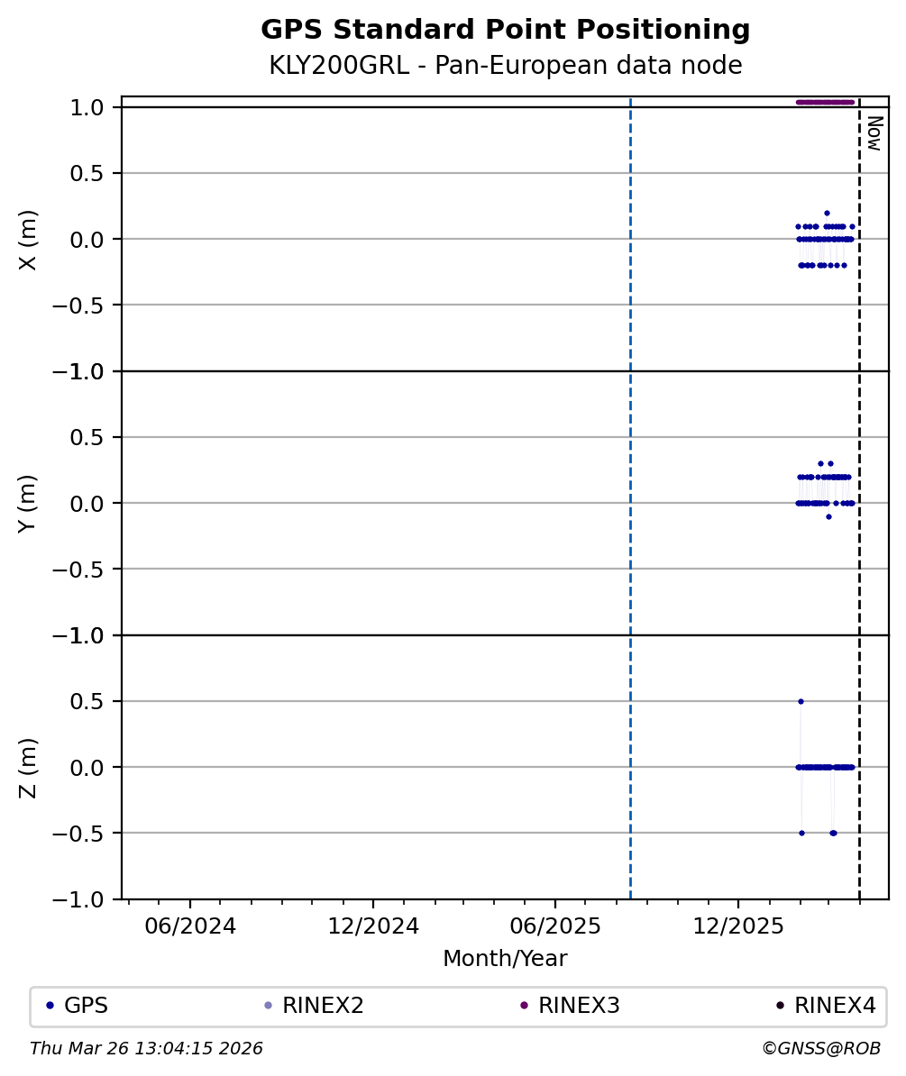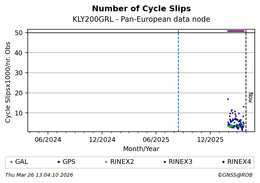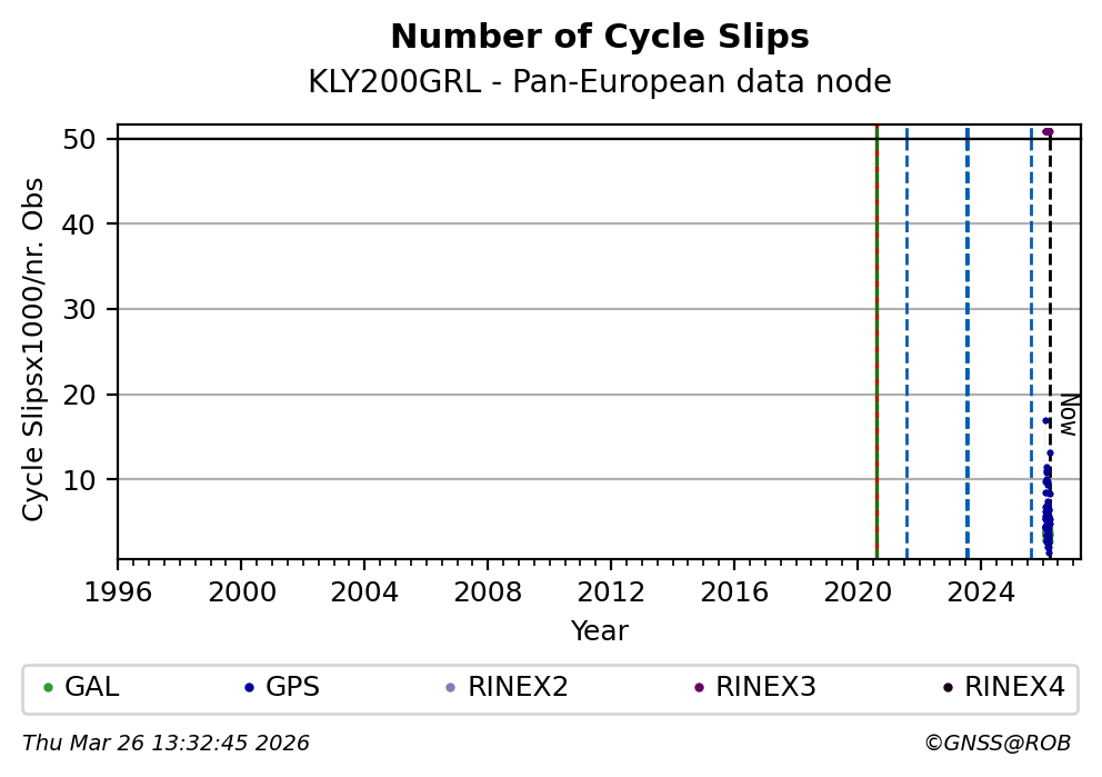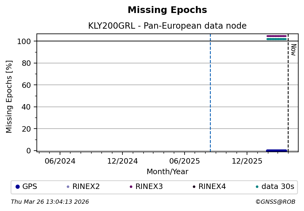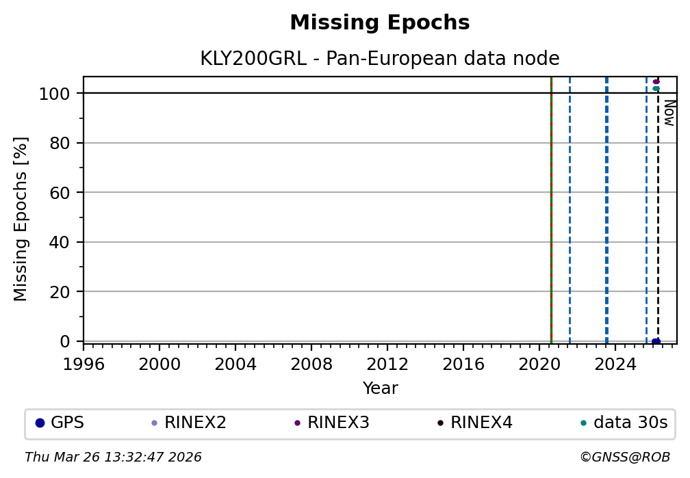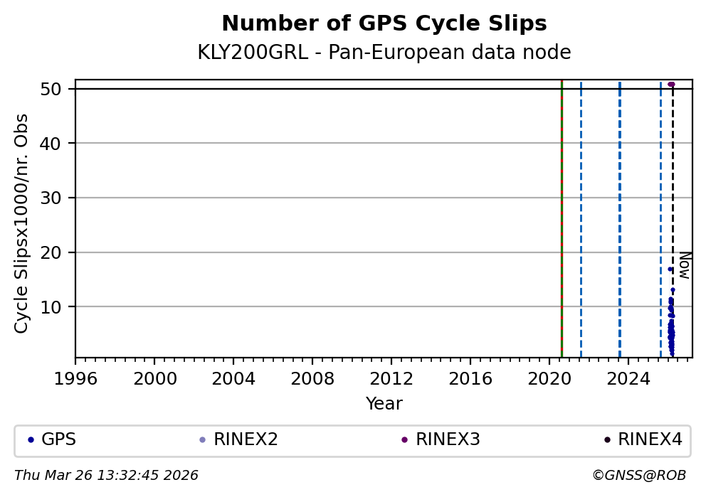The plots below present the long-term tracking performance of the EPOS-GNSS station KLY200GRL based on the daily RINEX data available from the Pan-European EPOS-GNSS data node. The data quality metrics have been computed at the data node using the G-Nut/Anubis software.