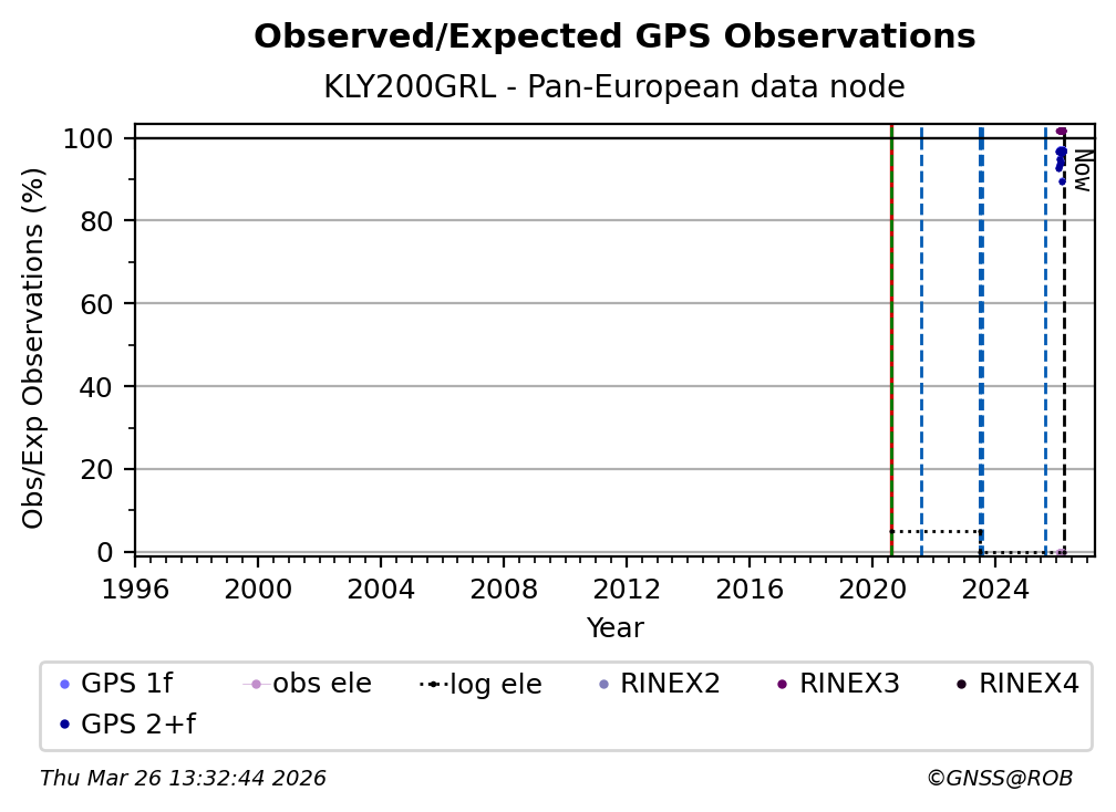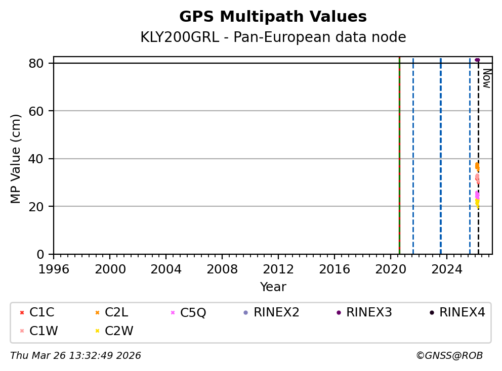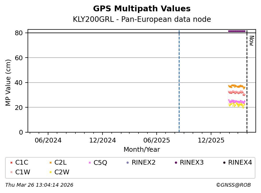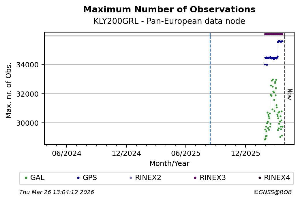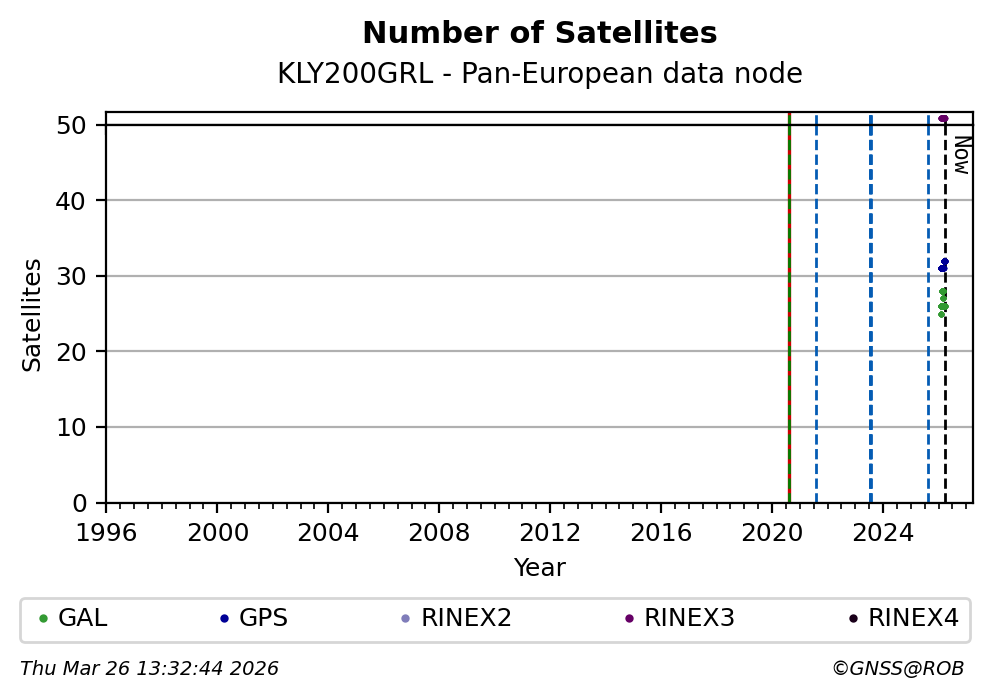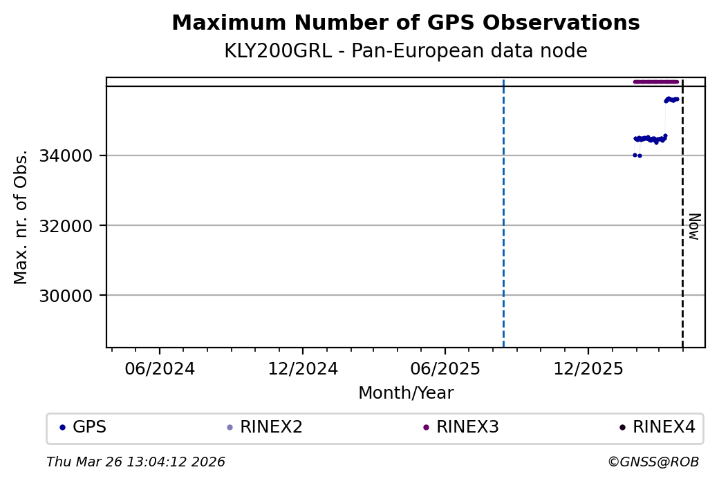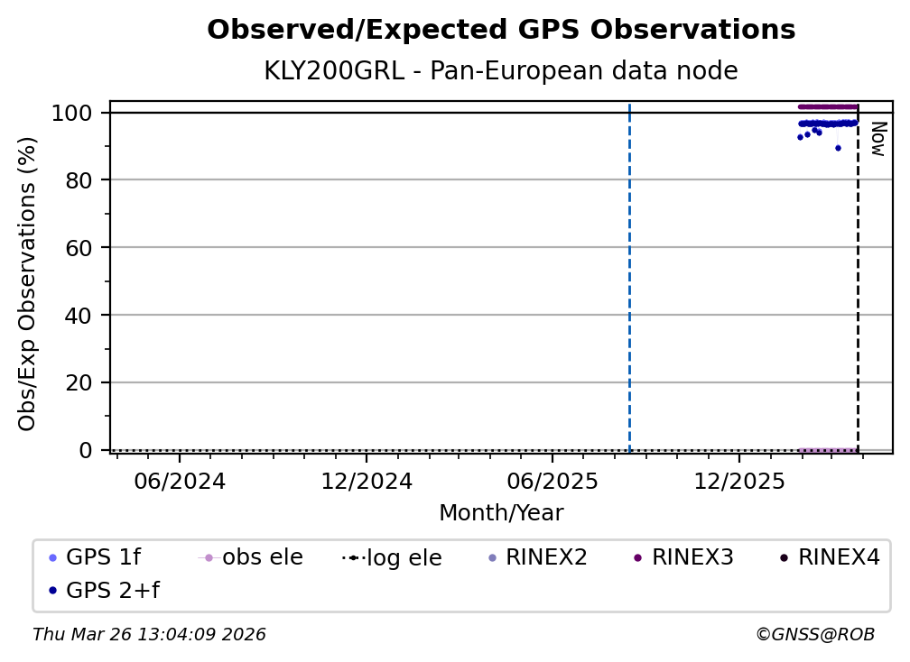 The plots below present the long-term tracking performance of the EPOS-GNSS station KLY200GRL based on the daily RINEX data available from the Pan-European EPOS-GNSS data node. The data quality metrics have been computed at the data node using the G-Nut/Anubis software.
