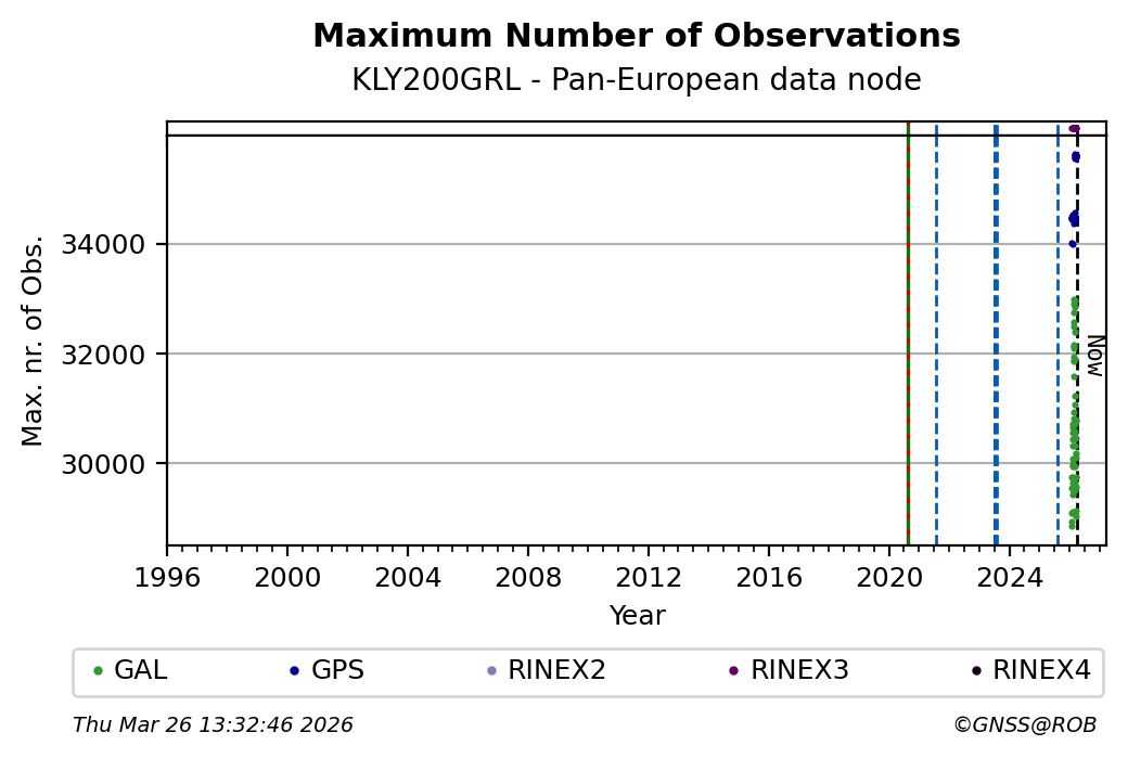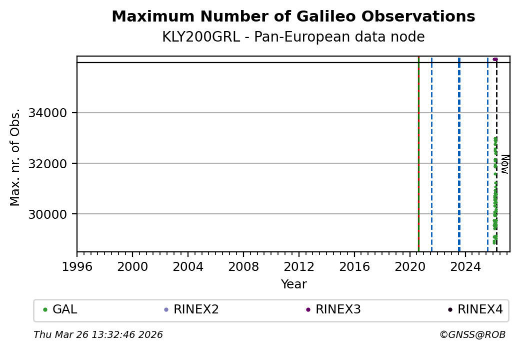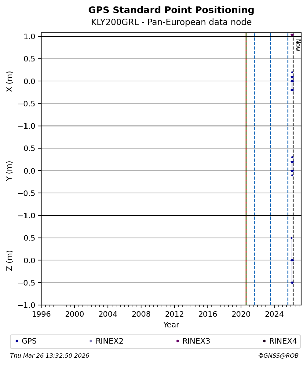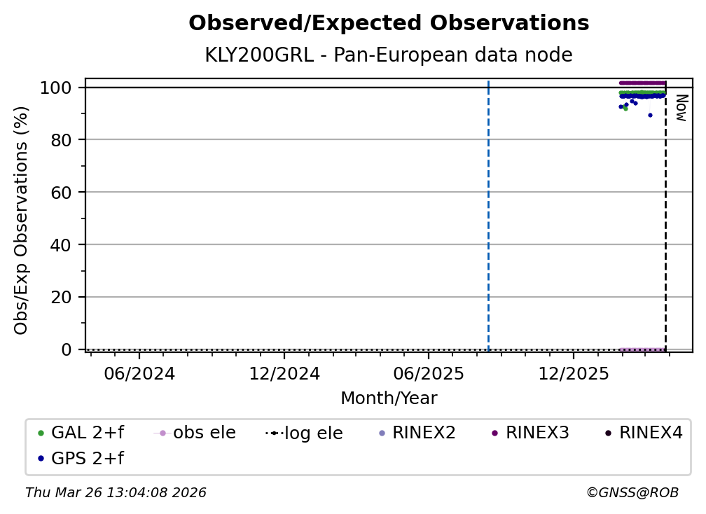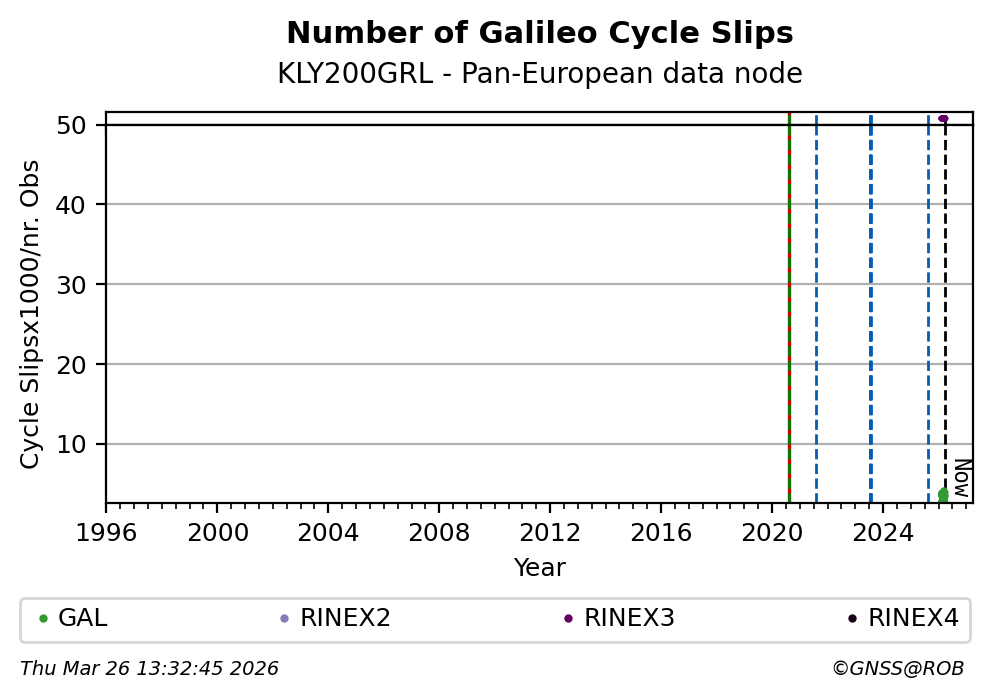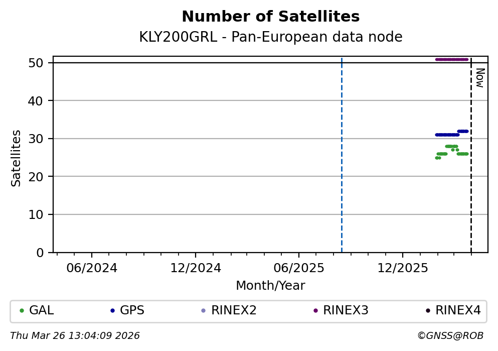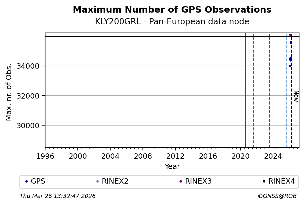 The plots below present the long-term tracking performance of the EPOS-GNSS station KLY200GRL based on the daily RINEX data available from the Pan-European EPOS-GNSS data node. The data quality metrics have been computed at the data node using the G-Nut/Anubis software.