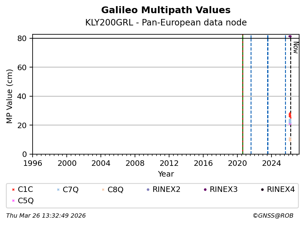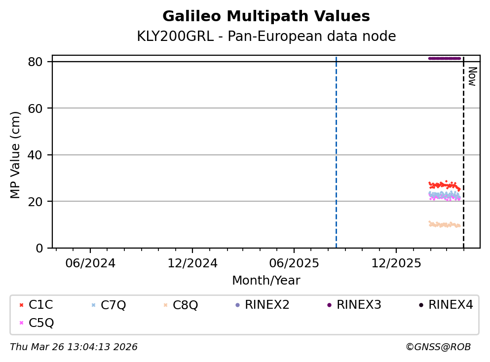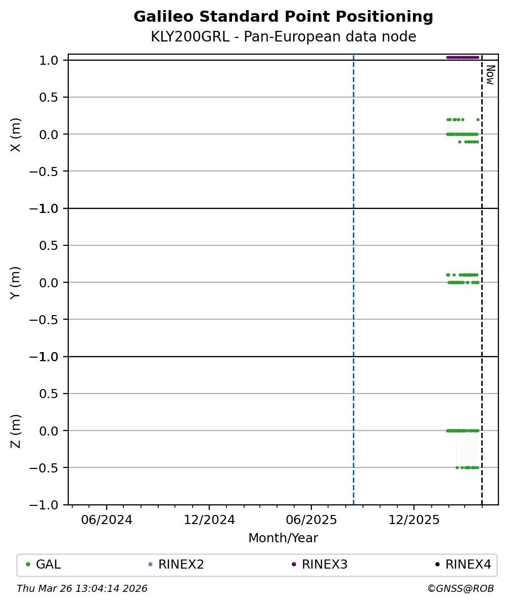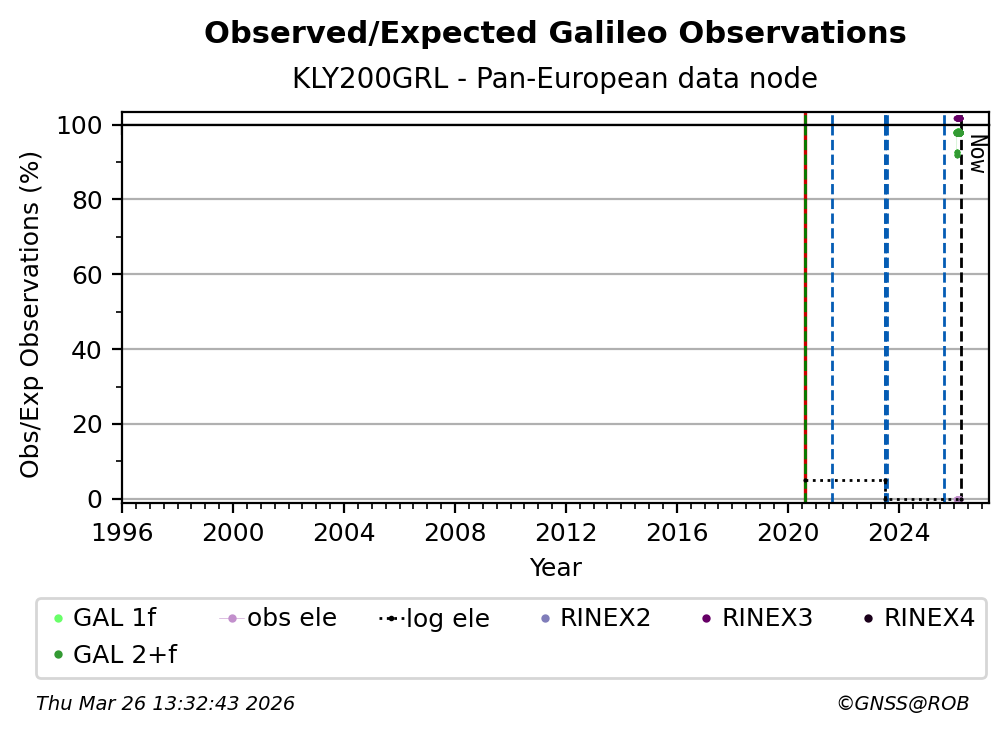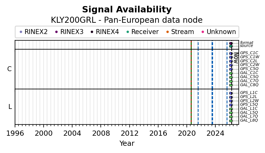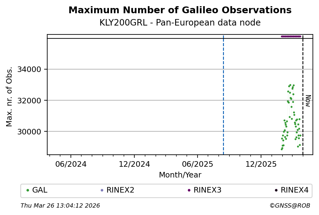 The plots below present the long-term tracking performance of the EPOS-GNSS station KLY200GRL based on the daily RINEX data available from the Pan-European EPOS-GNSS data node. The data quality metrics have been computed at the data node using the G-Nut/Anubis software.