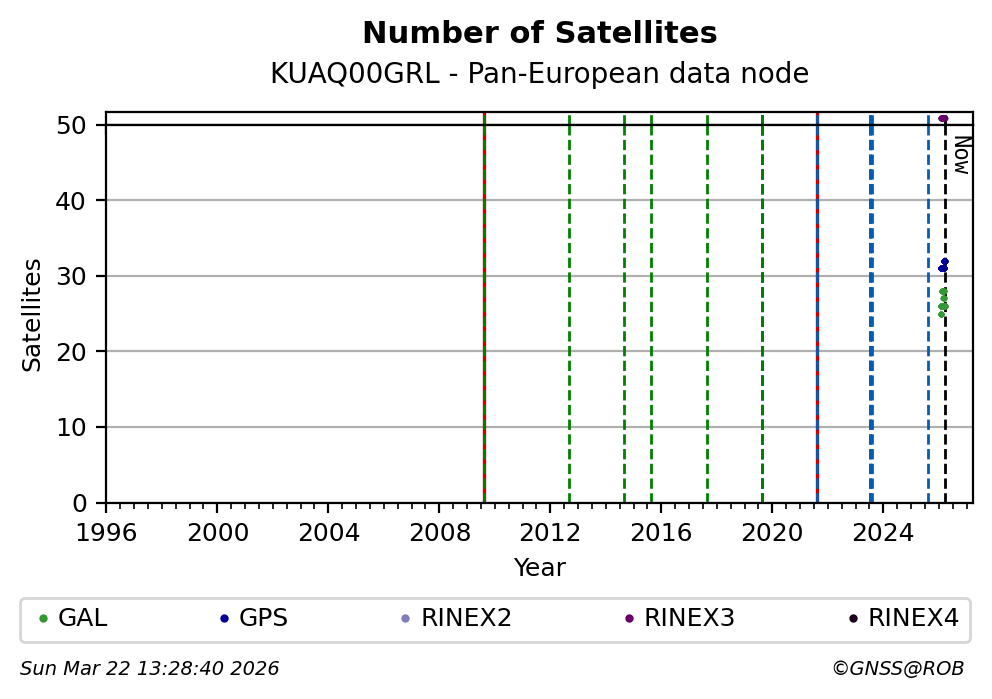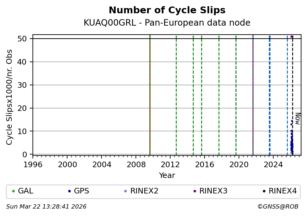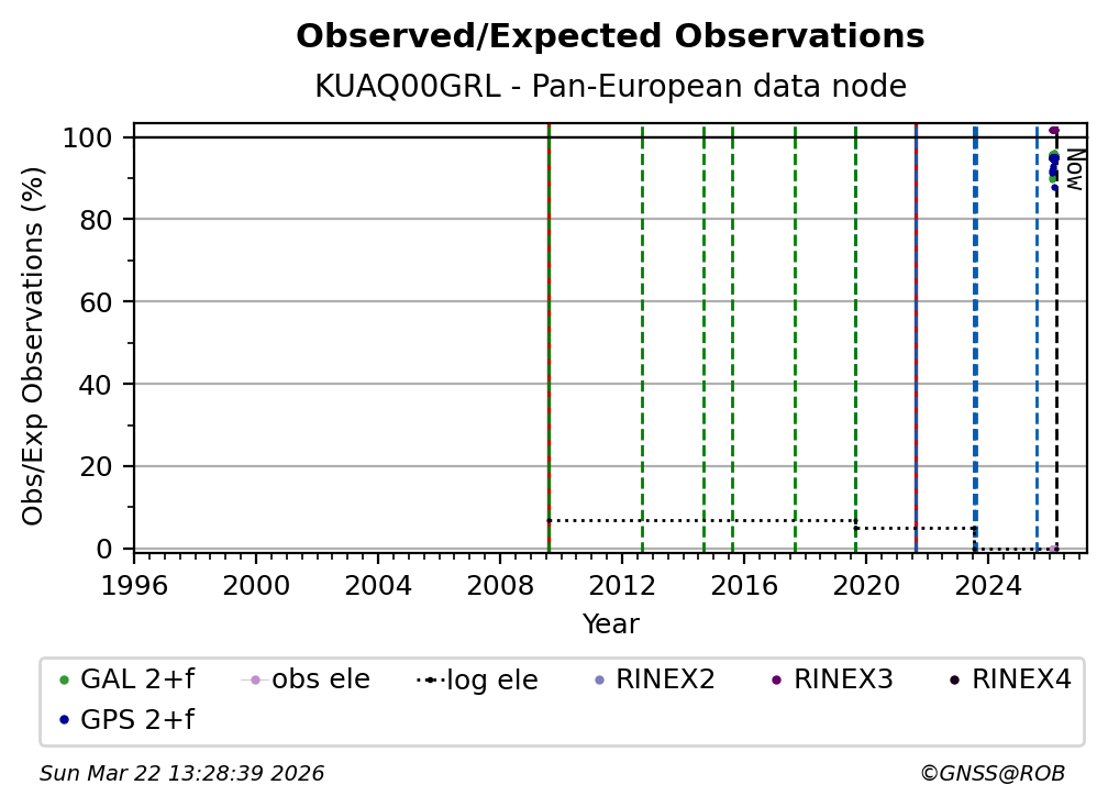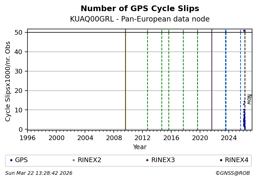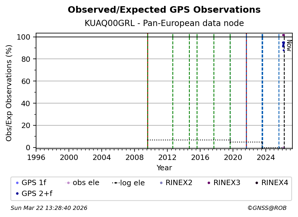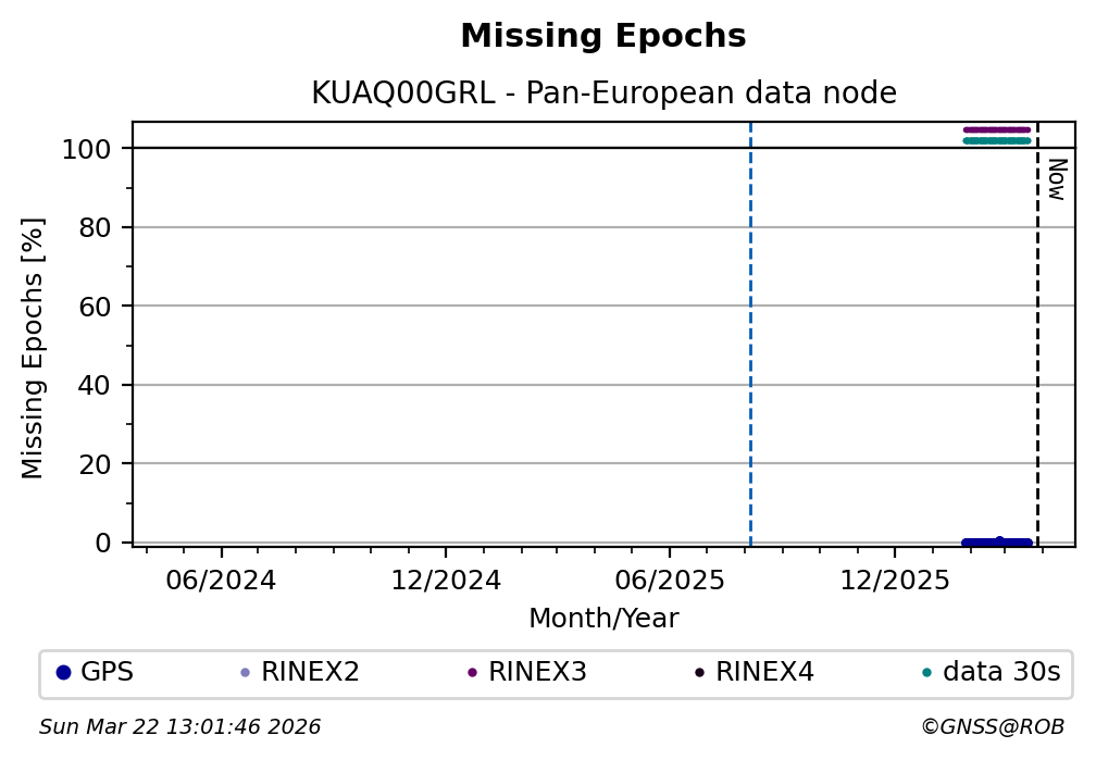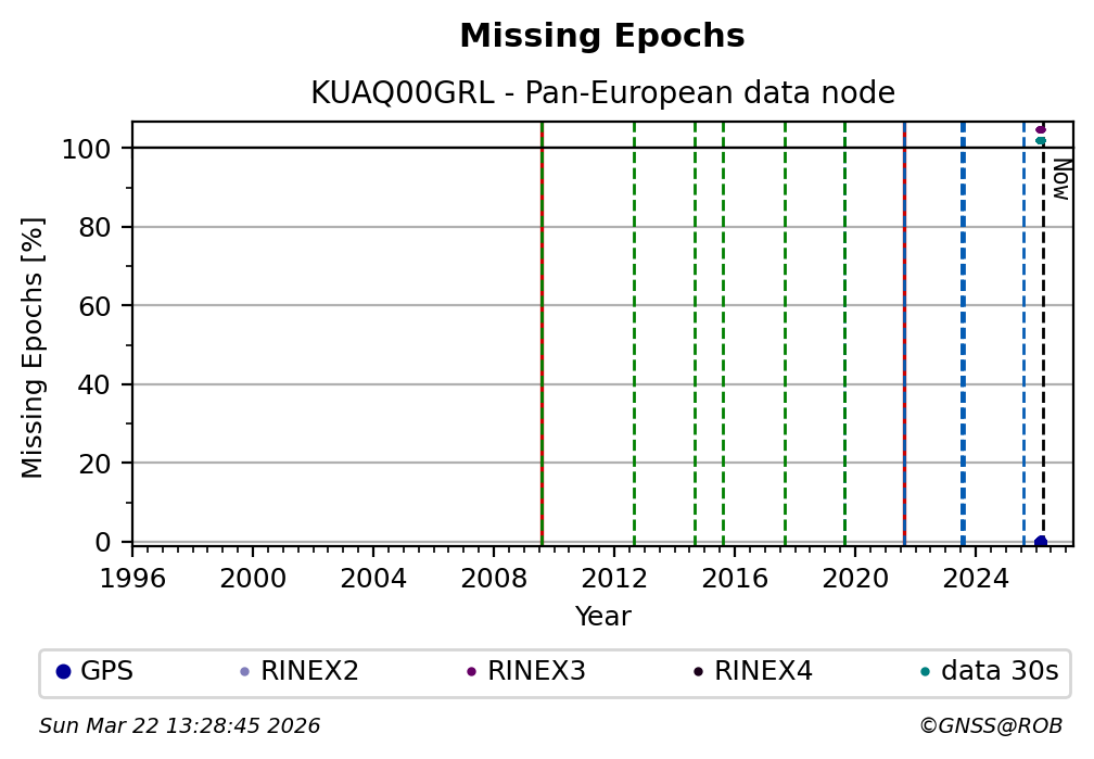 The plots below present the long-term tracking performance of the EPOS-GNSS station KUAQ00GRL based on the daily RINEX data available from the Pan-European EPOS-GNSS data node. The data quality metrics have been computed at the data node using the G-Nut/Anubis software.