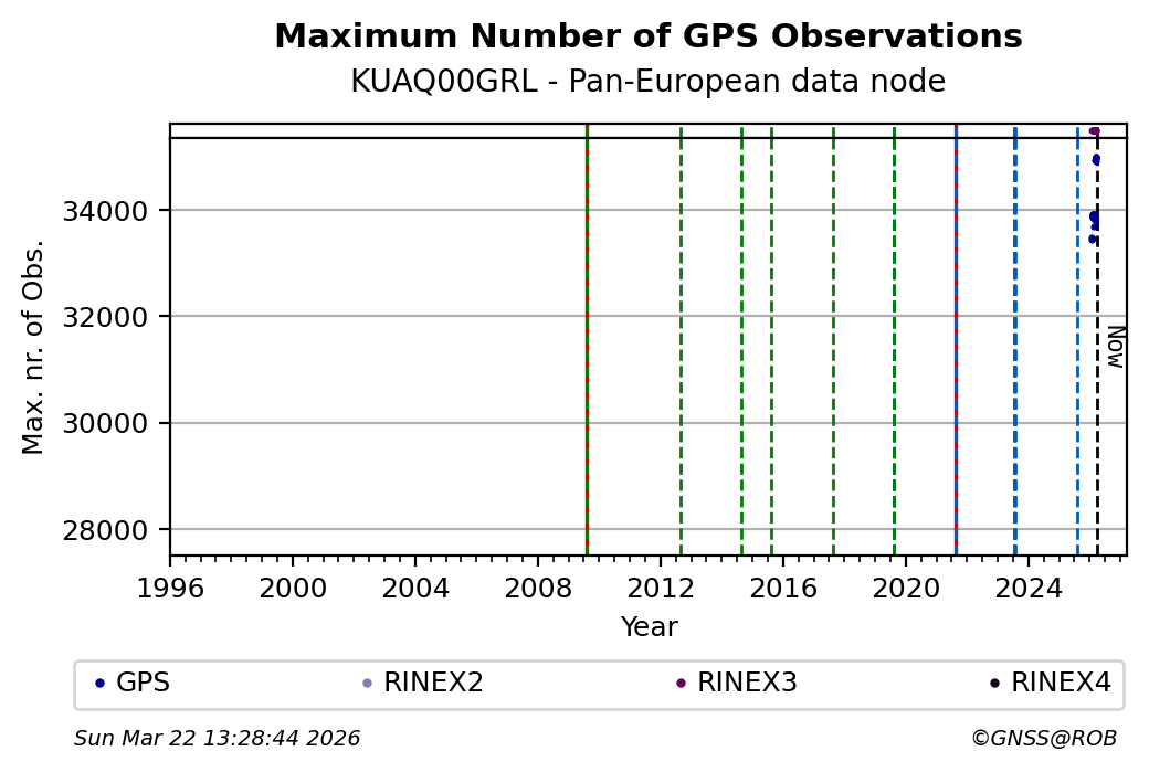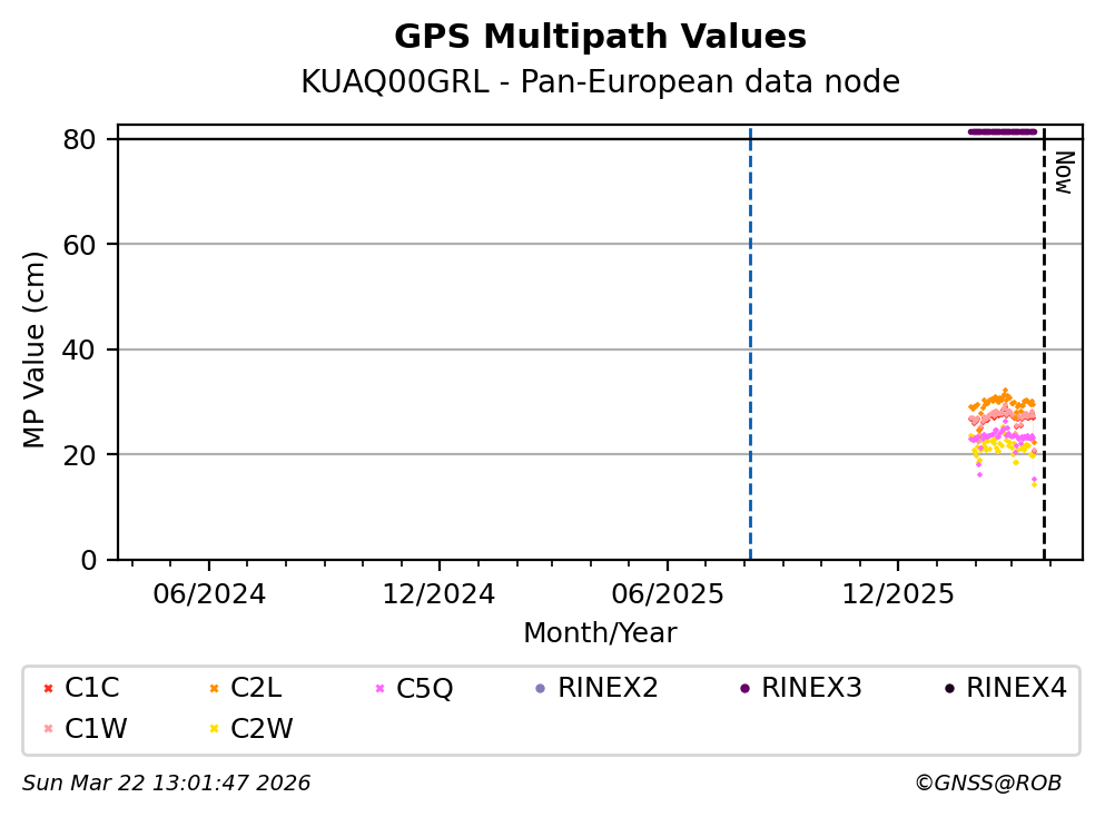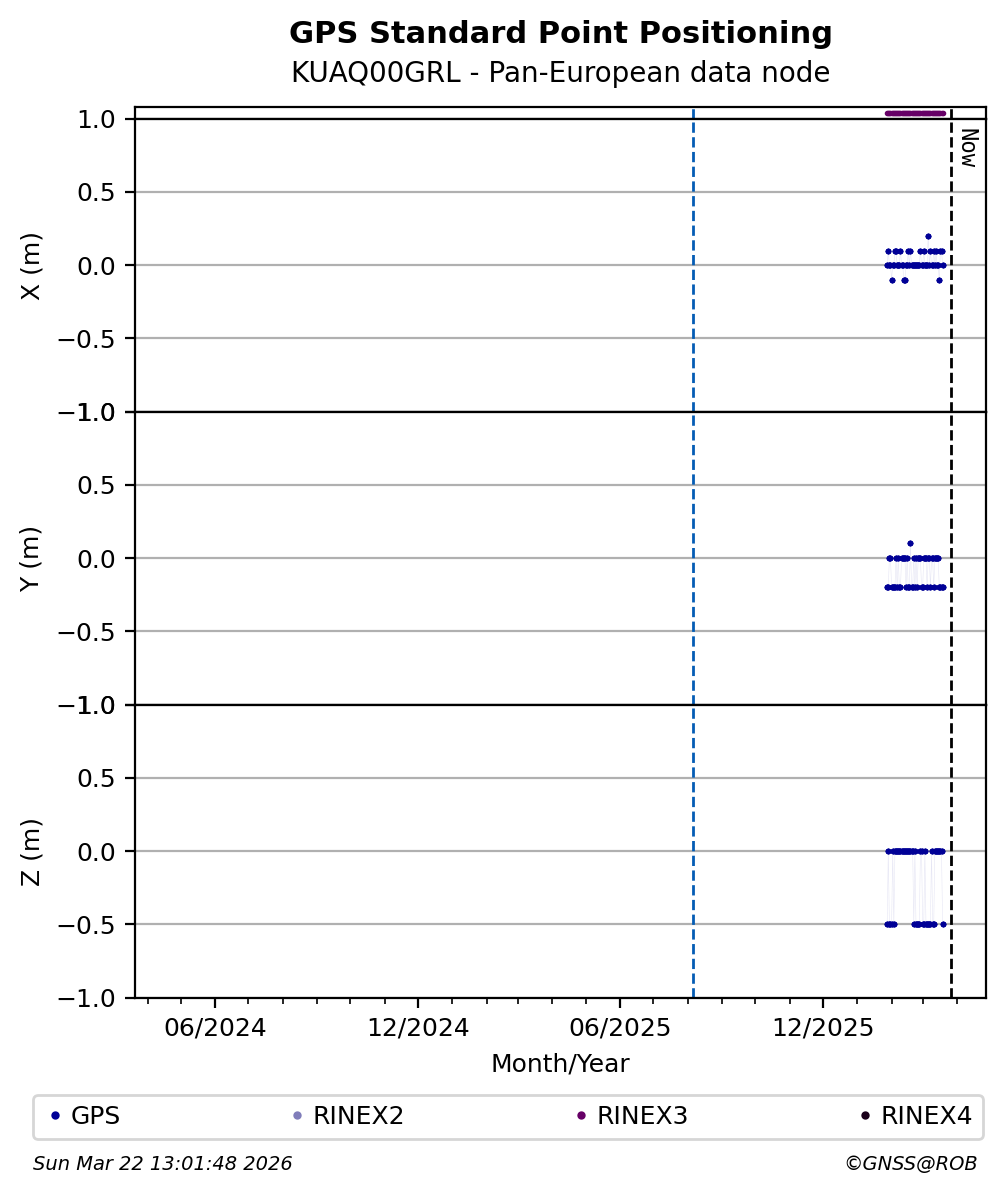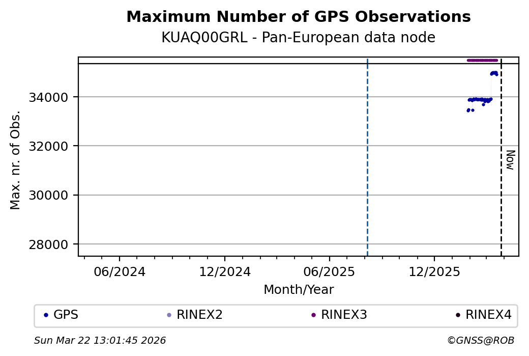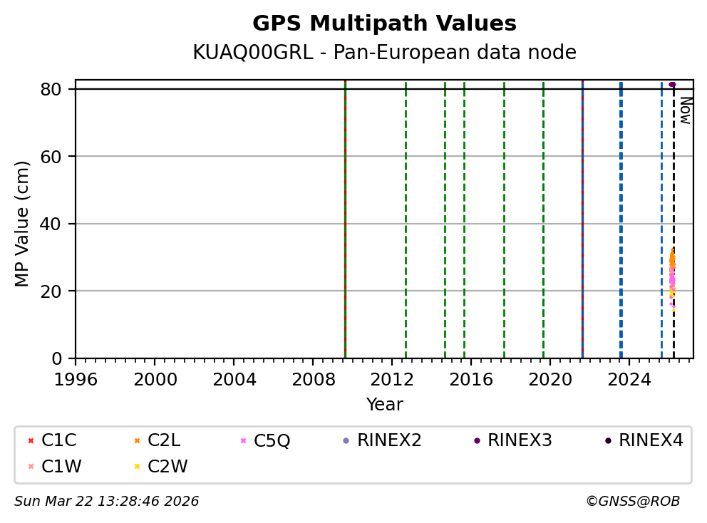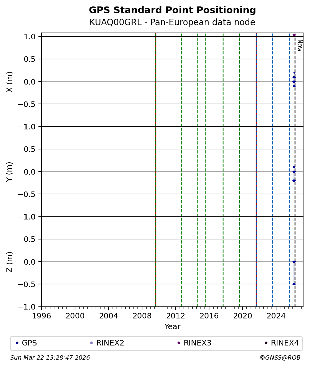 The plots below present the long-term tracking performance of the EPOS-GNSS station KUAQ00GRL based on the daily RINEX data available from the Pan-European EPOS-GNSS data node. The data quality metrics have been computed at the data node using the G-Nut/Anubis software.