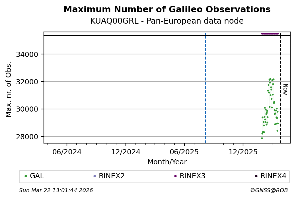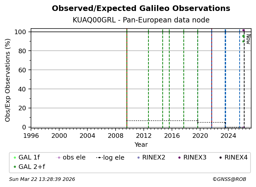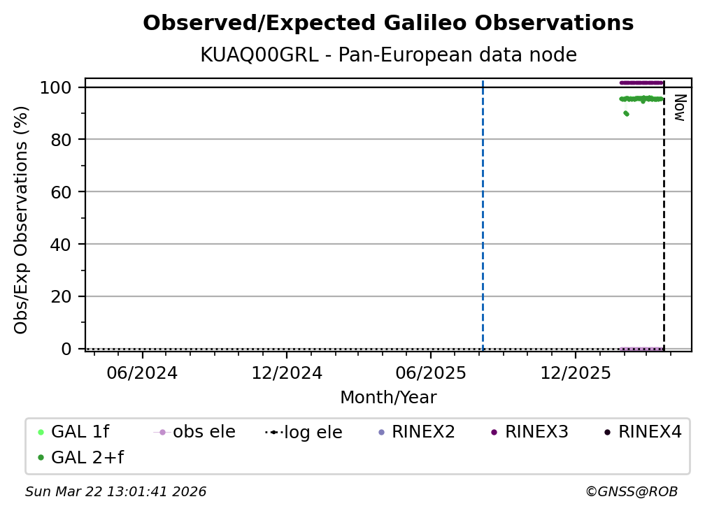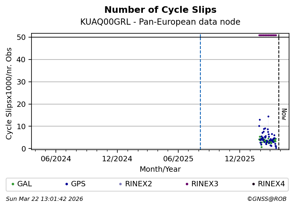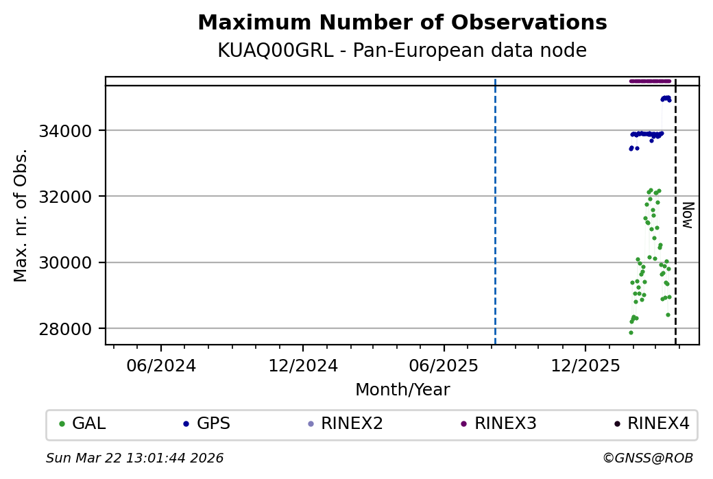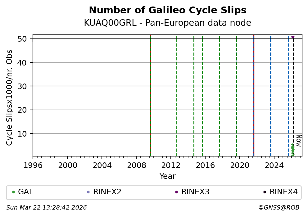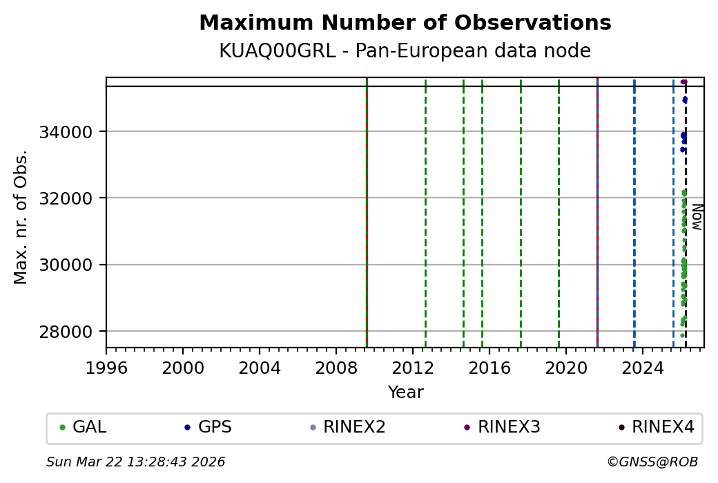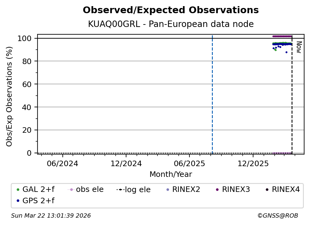 The plots below present the long-term tracking performance of the EPOS-GNSS station KUAQ00GRL based on the daily RINEX data available from the Pan-European EPOS-GNSS data node. The data quality metrics have been computed at the data node using the G-Nut/Anubis software.