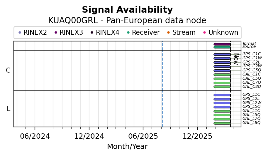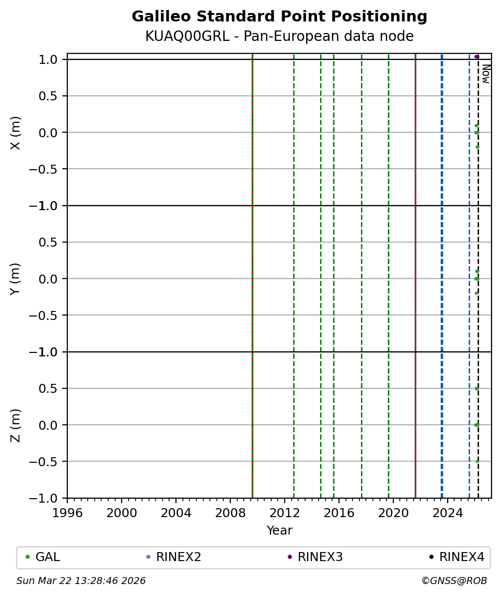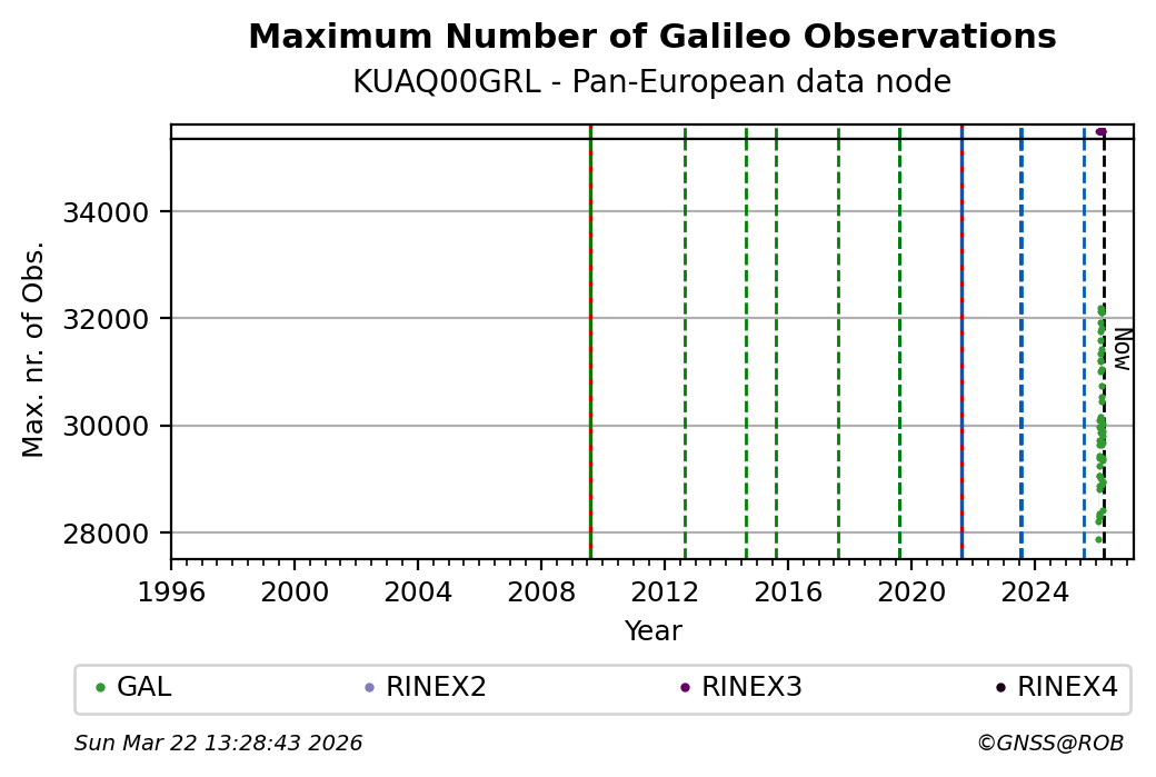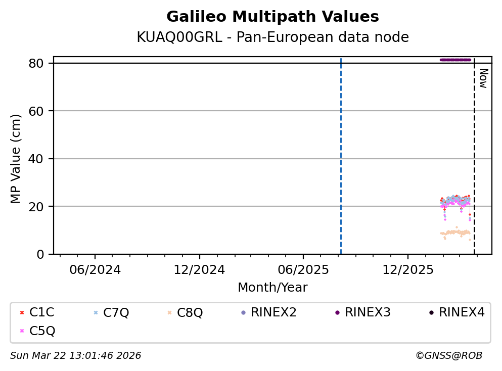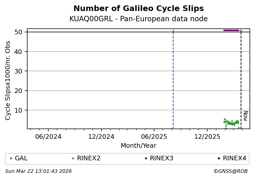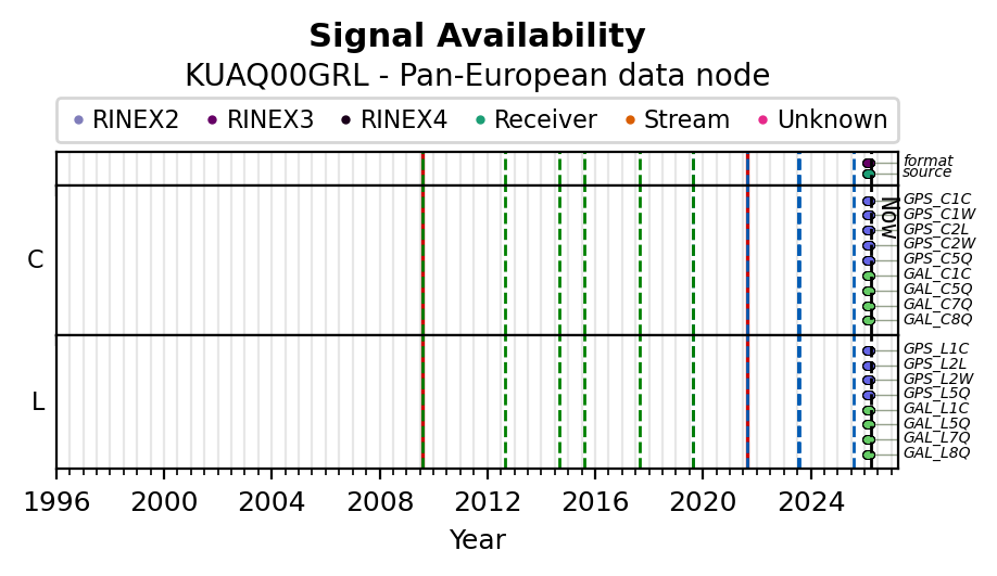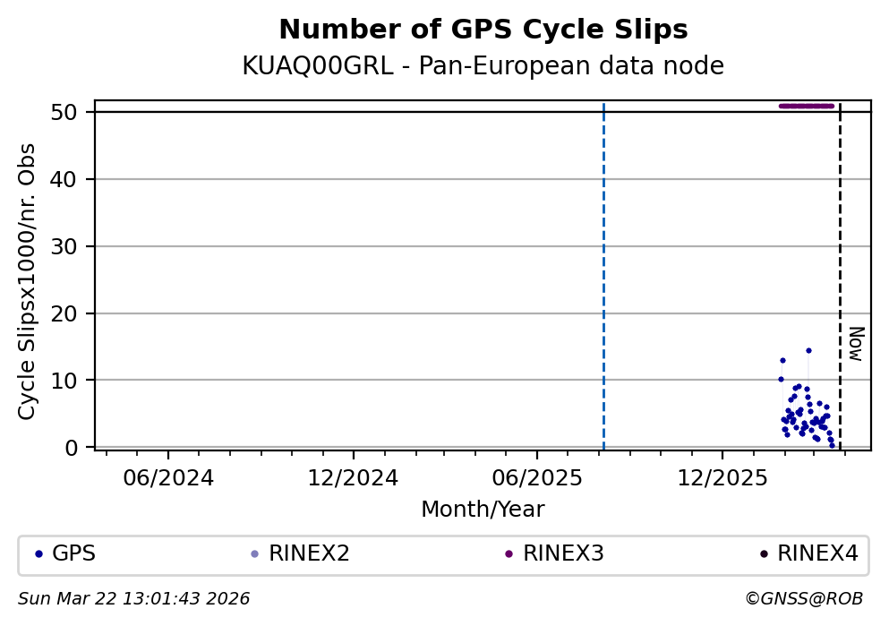The plots below present the long-term tracking performance of the EPOS-GNSS station KUAQ00GRL based on the daily RINEX data available from the Pan-European EPOS-GNSS data node. The data quality metrics have been computed at the data node using the G-Nut/Anubis software.