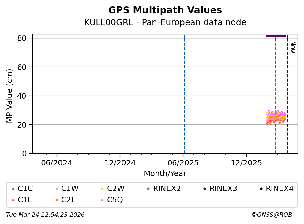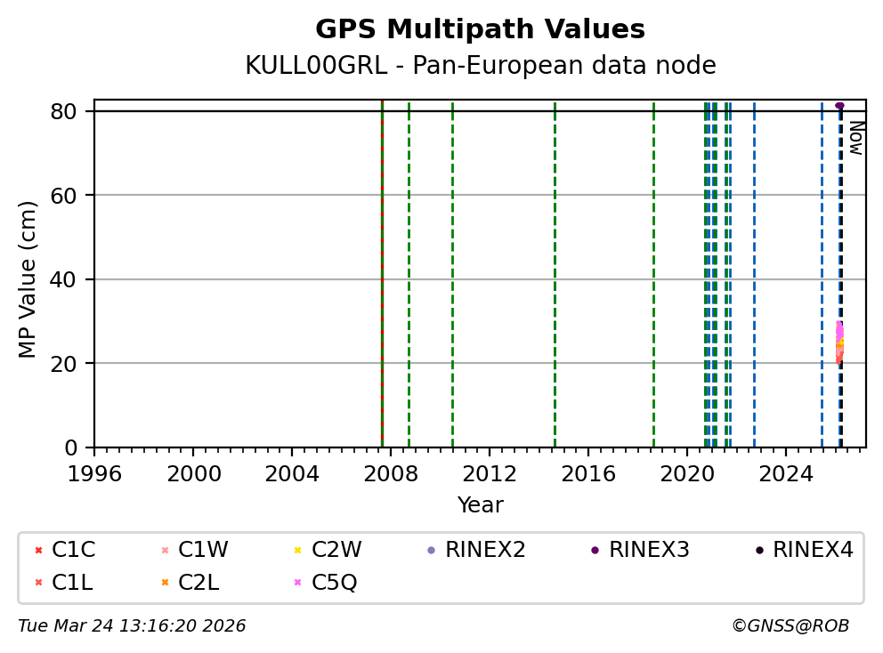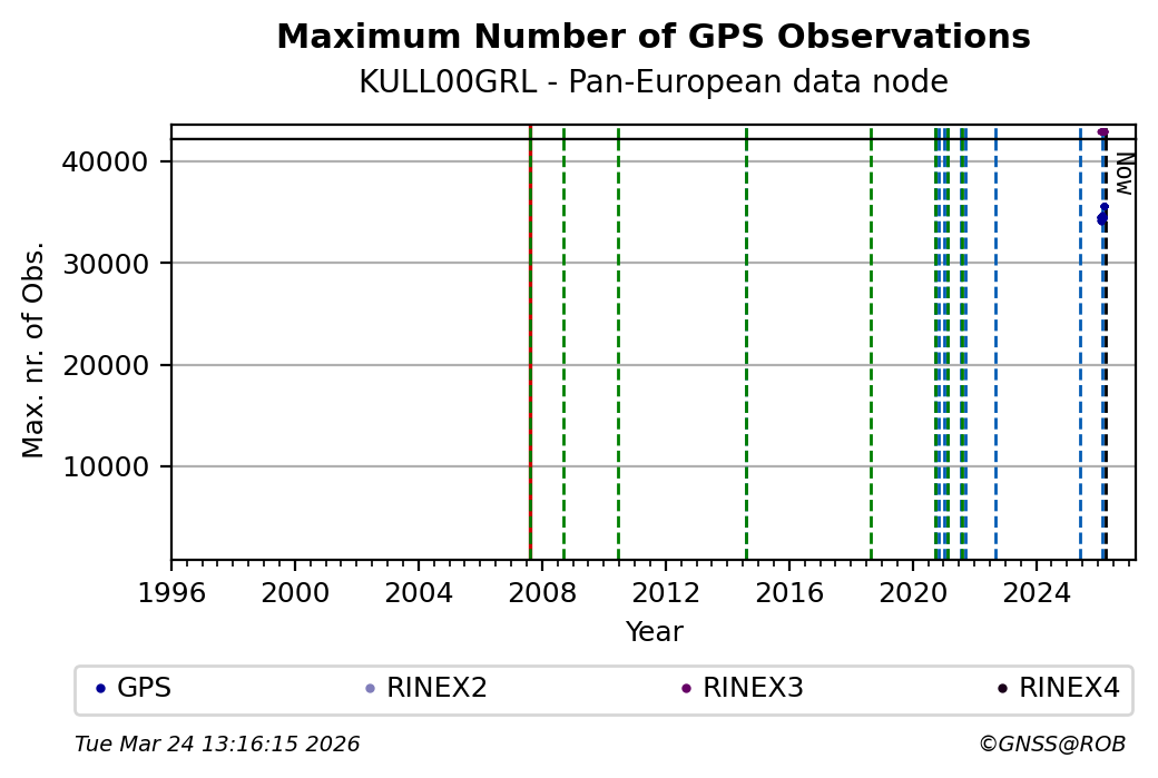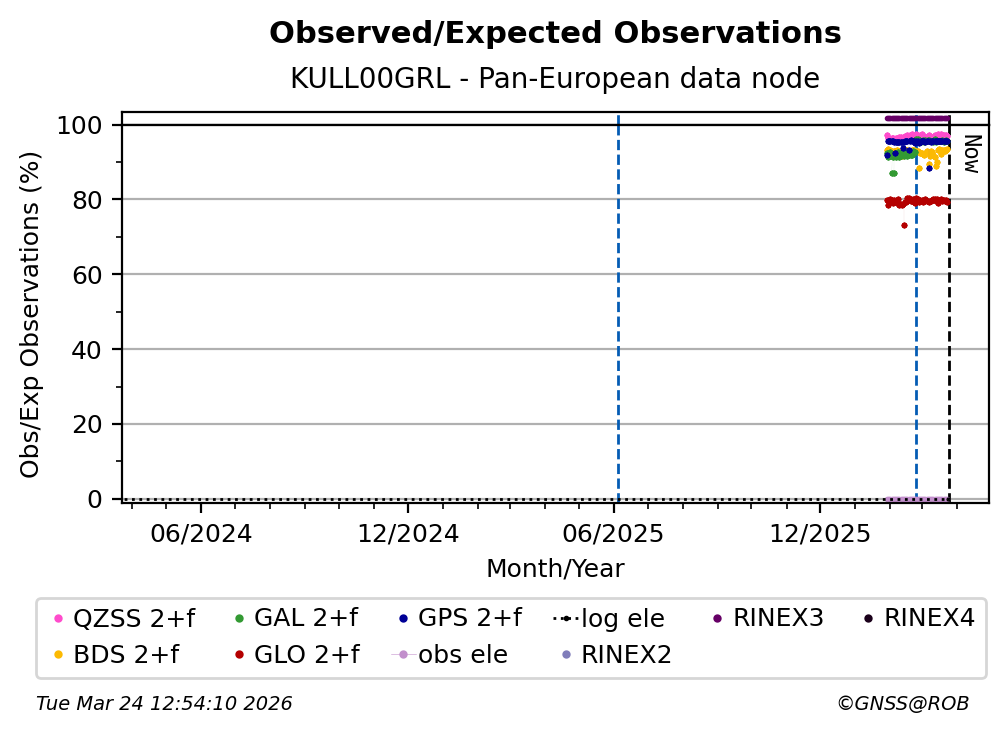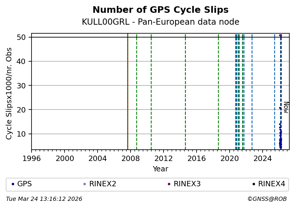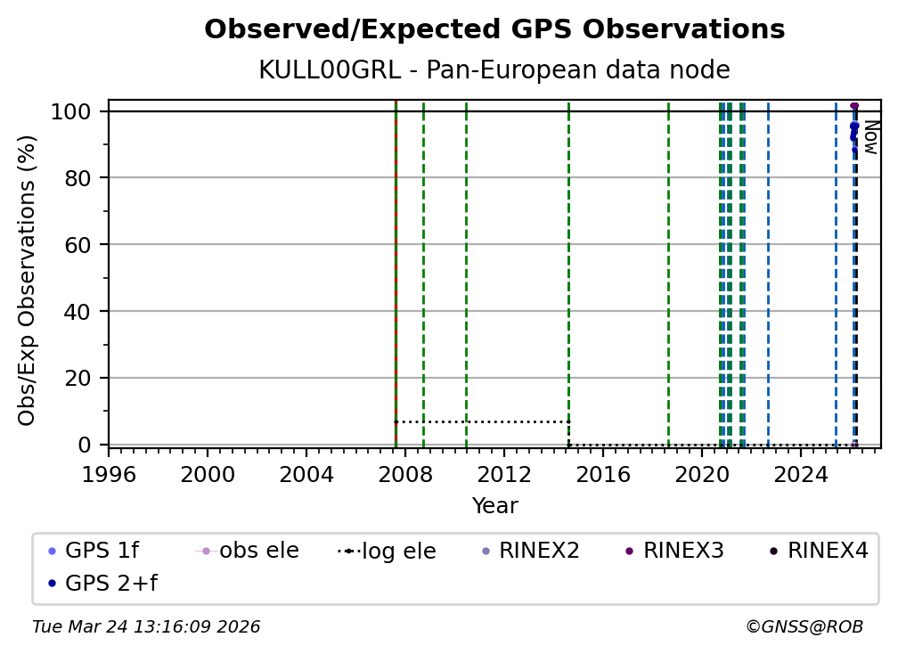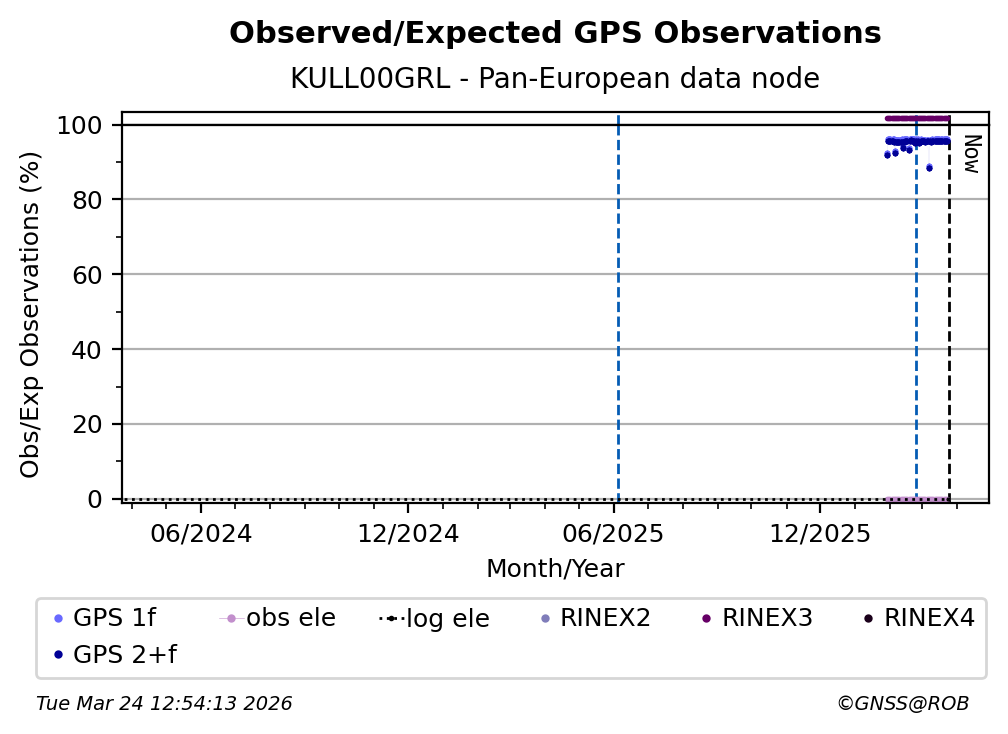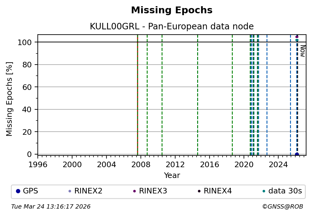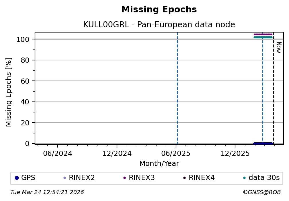 The plots below present the long-term tracking performance of the EPOS-GNSS station KULL00GRL based on the daily RINEX data available from the Pan-European EPOS-GNSS data node. The data quality metrics have been computed at the data node using the G-Nut/Anubis software.