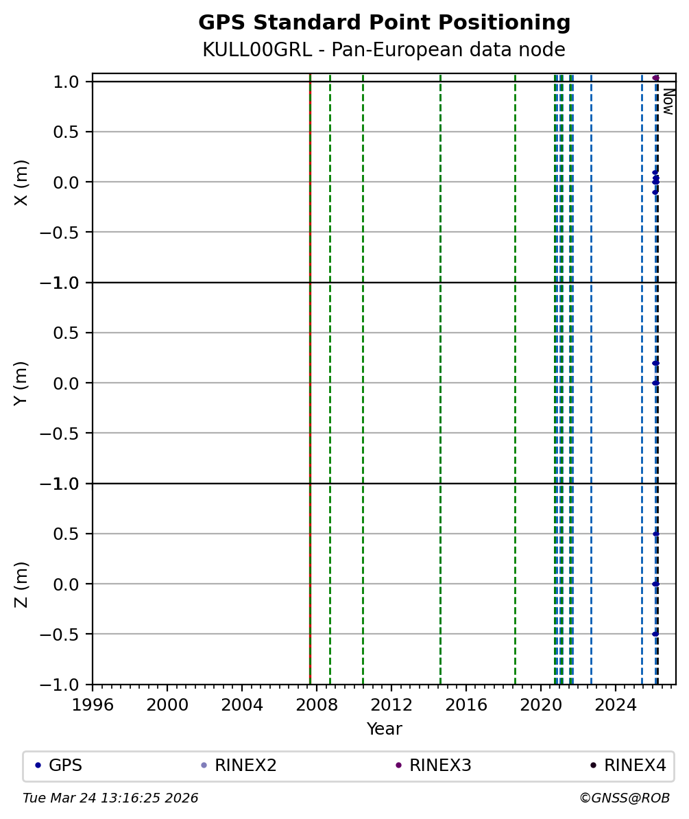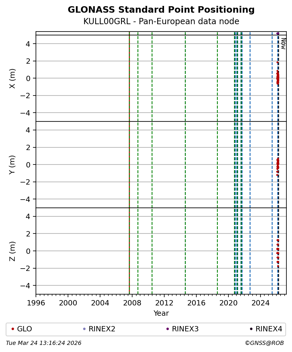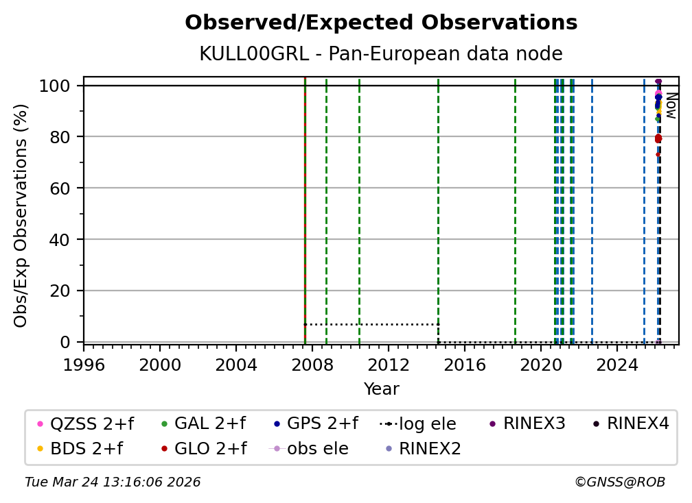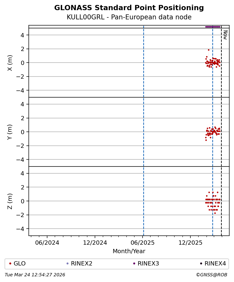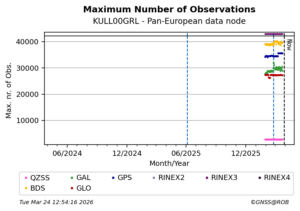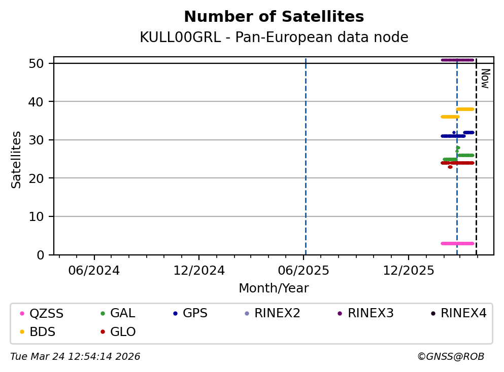 The plots below present the long-term tracking performance of the EPOS-GNSS station KULL00GRL based on the daily RINEX data available from the Pan-European EPOS-GNSS data node. The data quality metrics have been computed at the data node using the G-Nut/Anubis software.