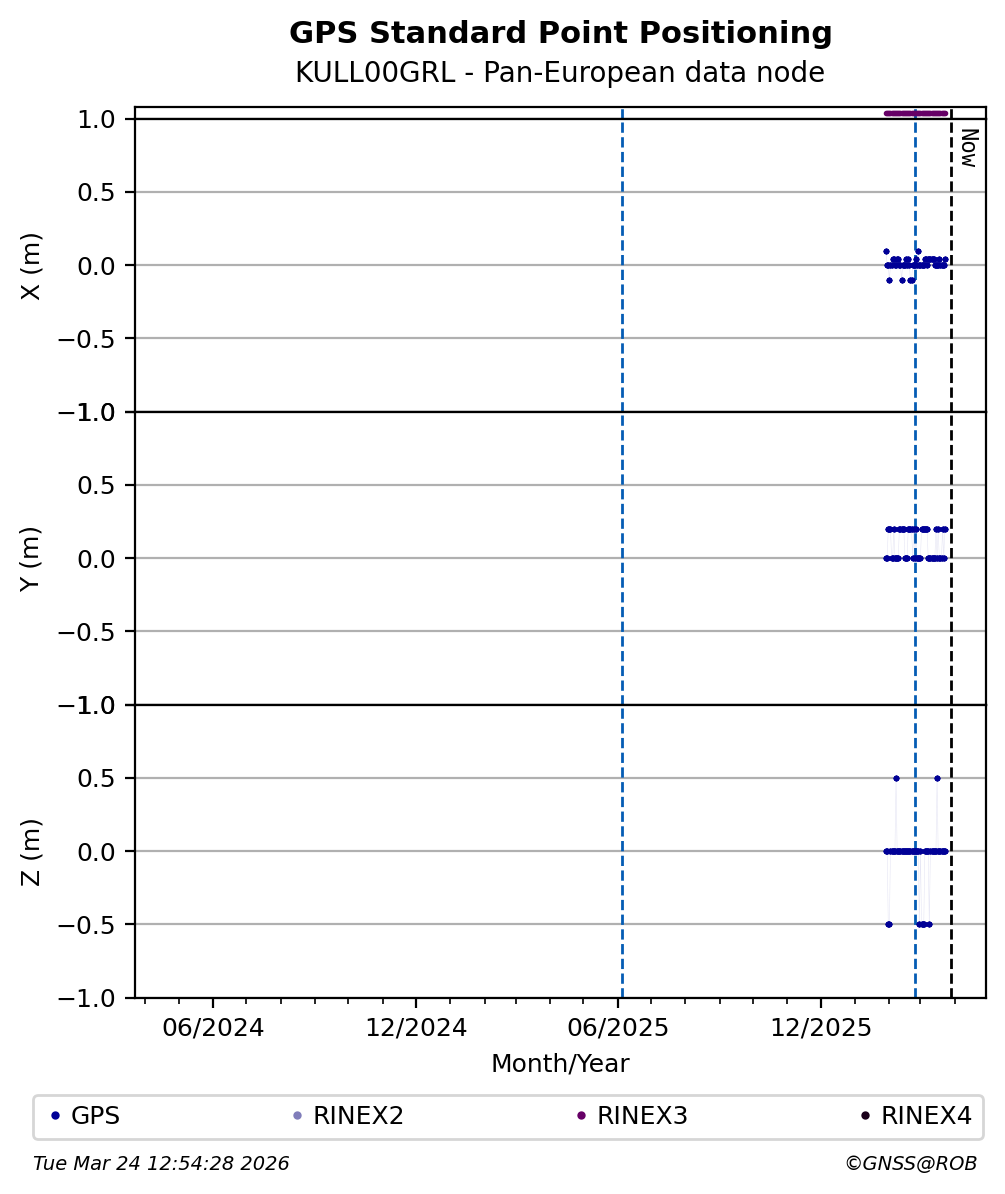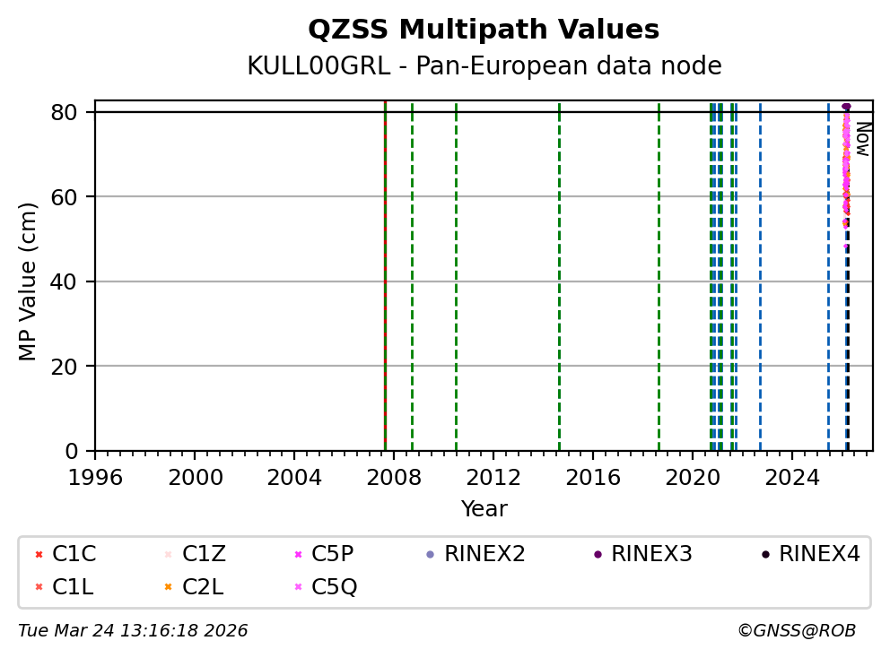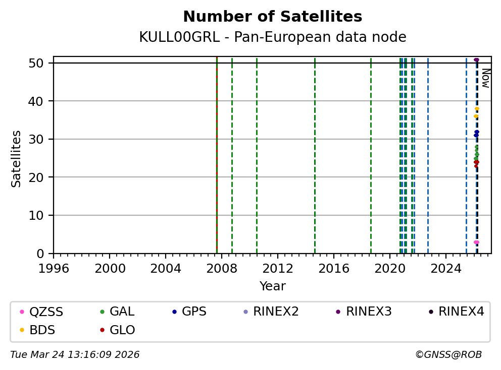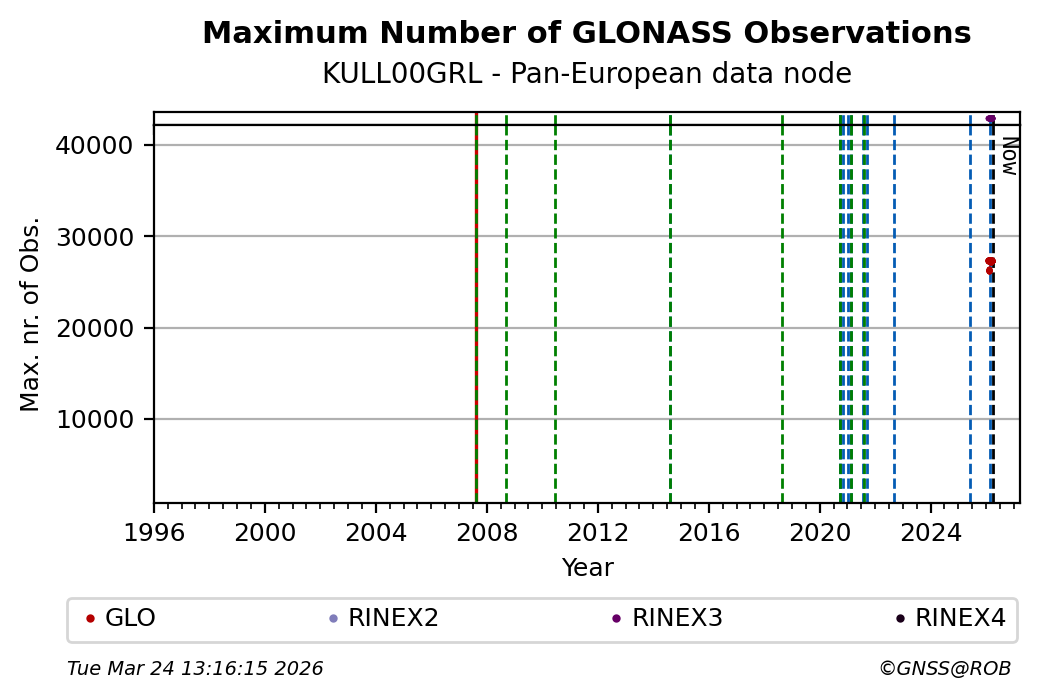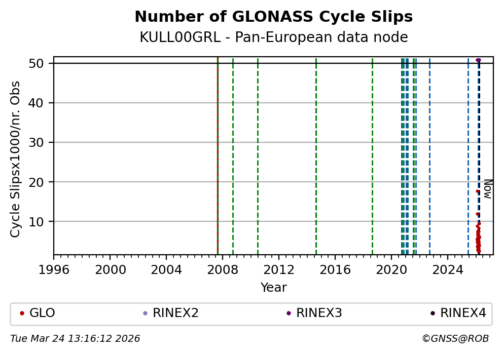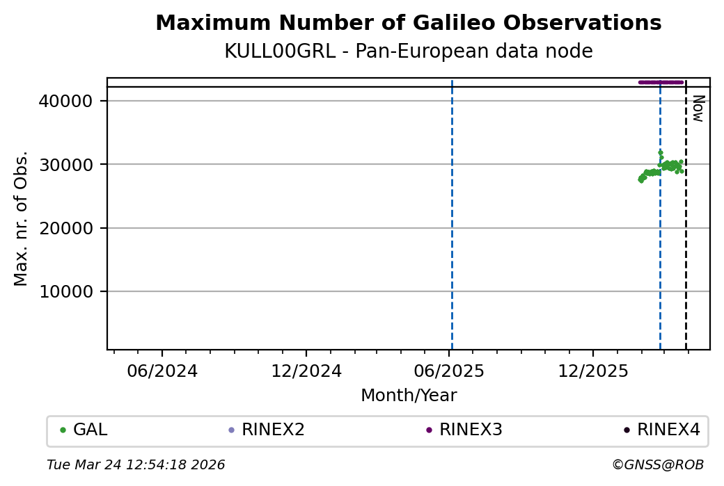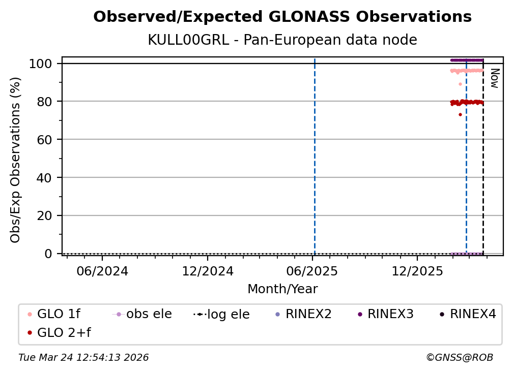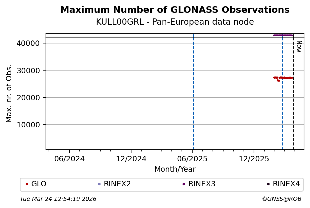 The plots below present the long-term tracking performance of the EPOS-GNSS station KULL00GRL based on the daily RINEX data available from the Pan-European EPOS-GNSS data node. The data quality metrics have been computed at the data node using the G-Nut/Anubis software.