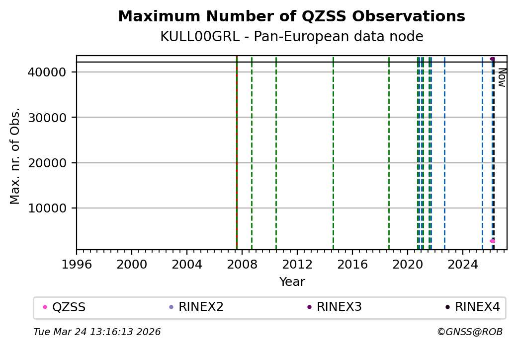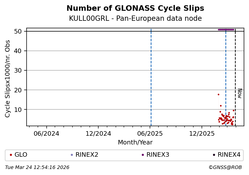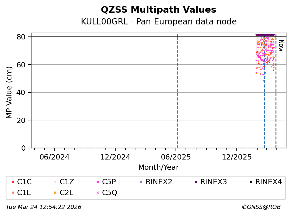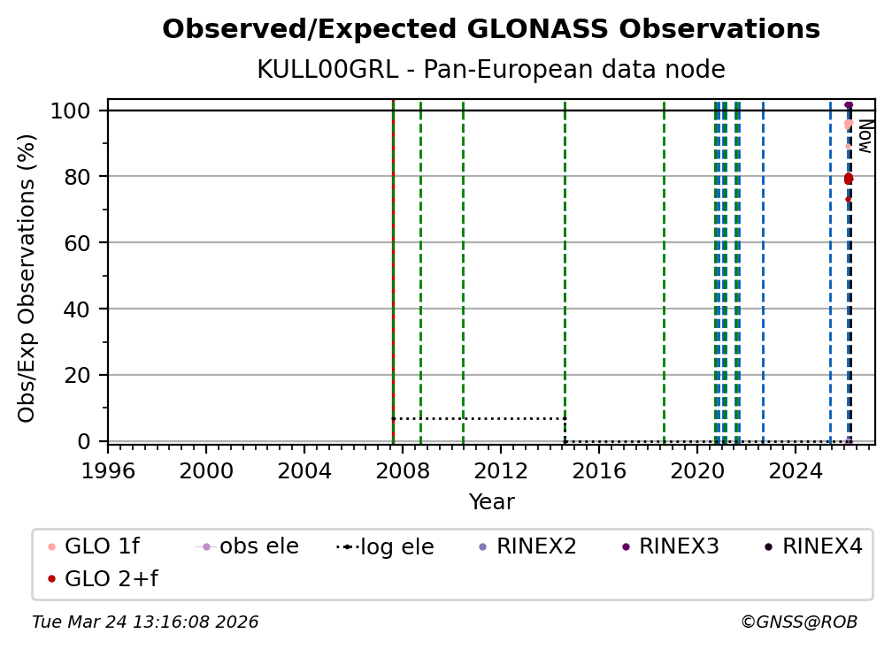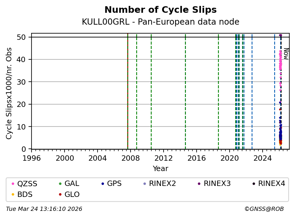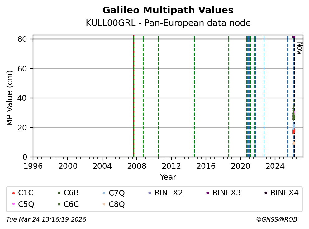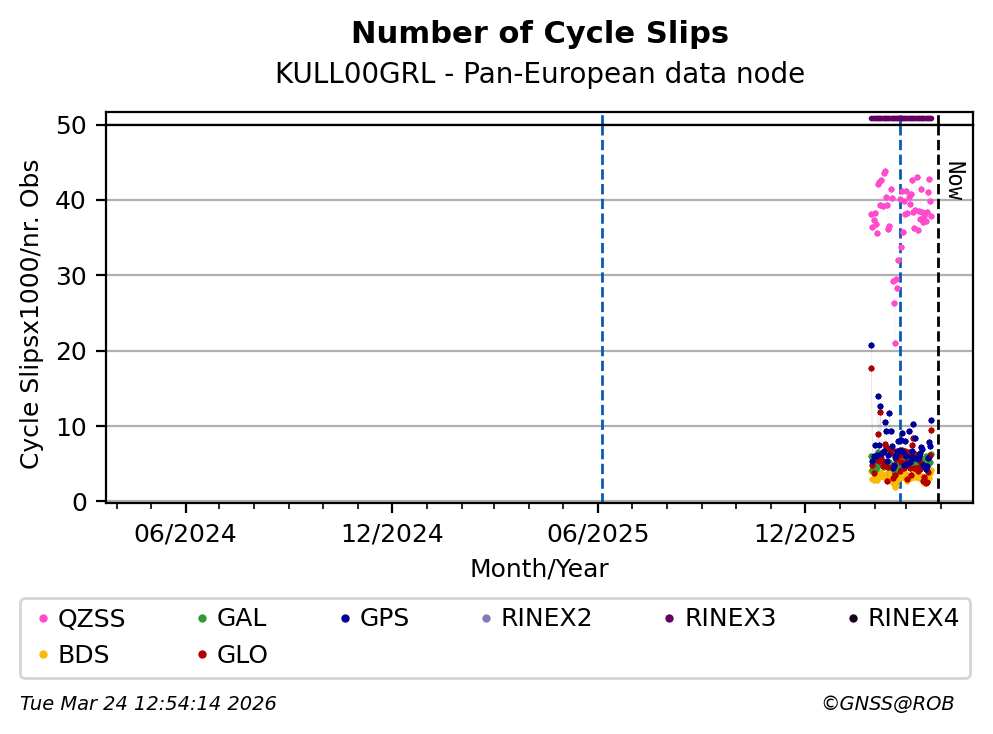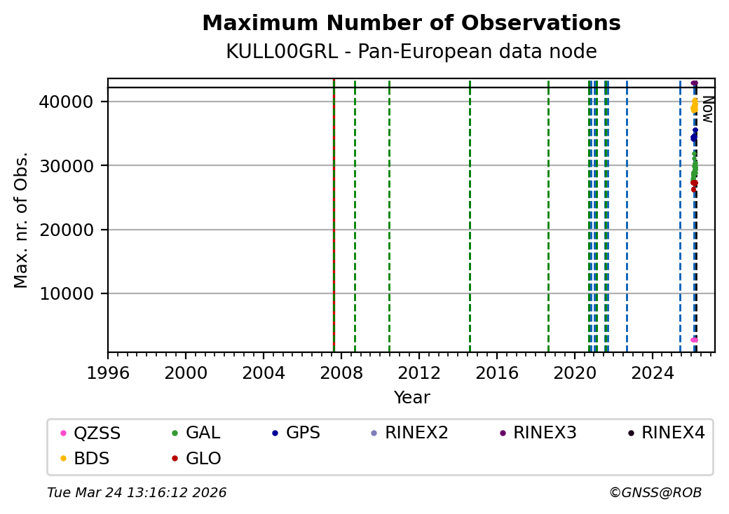 The plots below present the long-term tracking performance of the EPOS-GNSS station KULL00GRL based on the daily RINEX data available from the Pan-European EPOS-GNSS data node. The data quality metrics have been computed at the data node using the G-Nut/Anubis software.