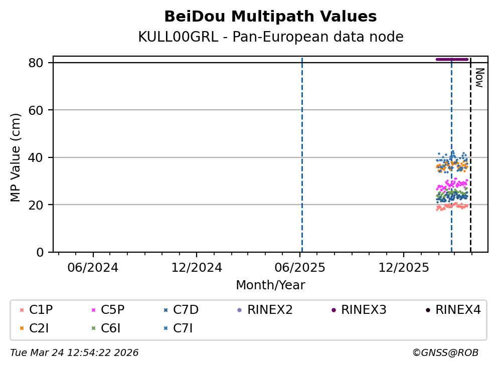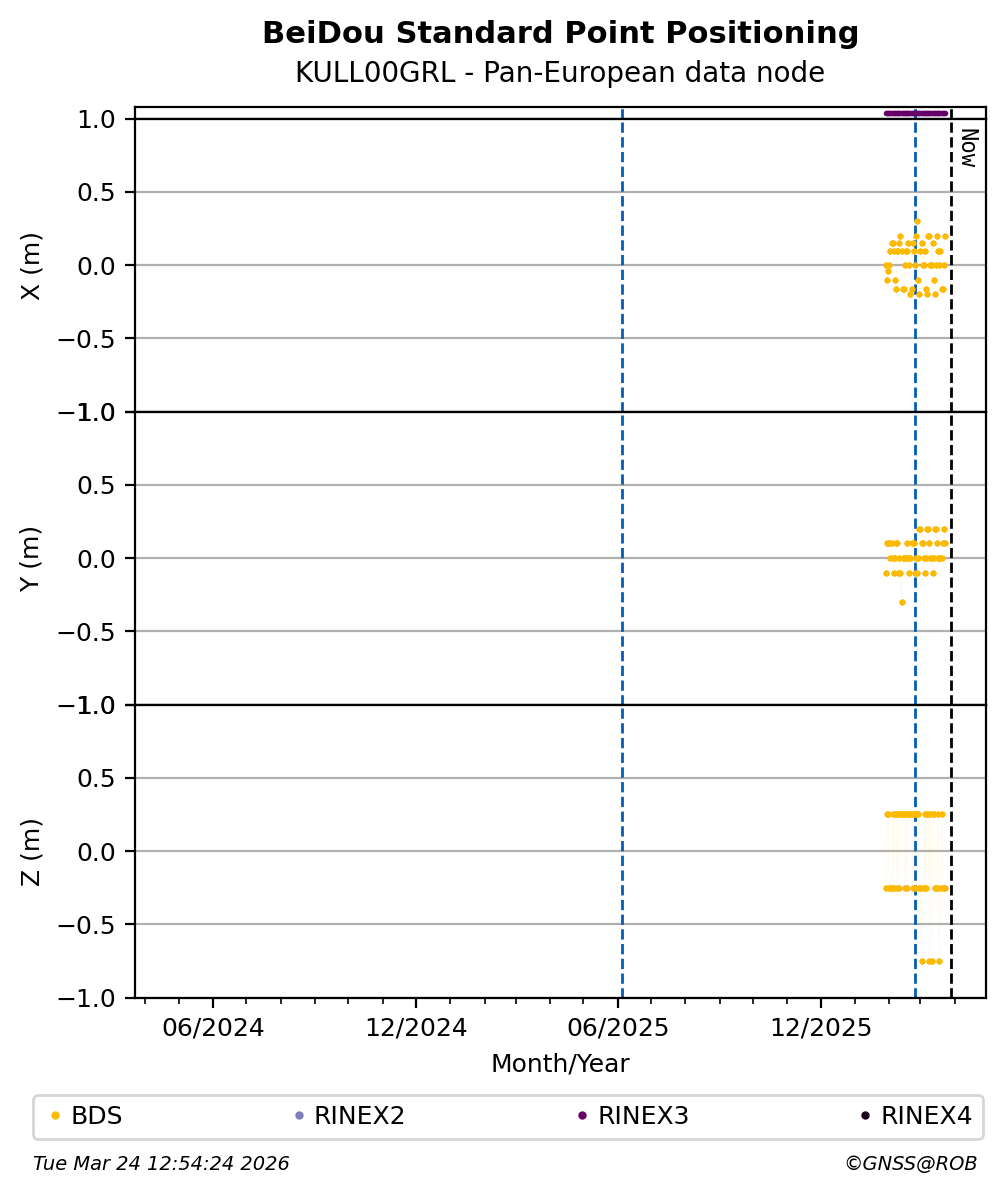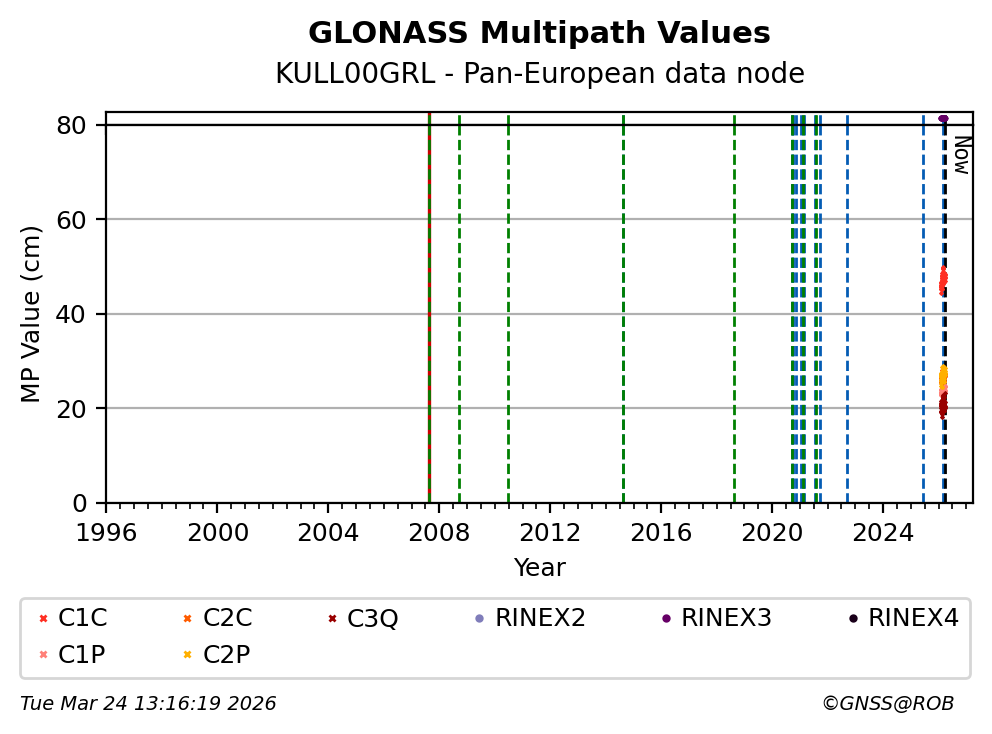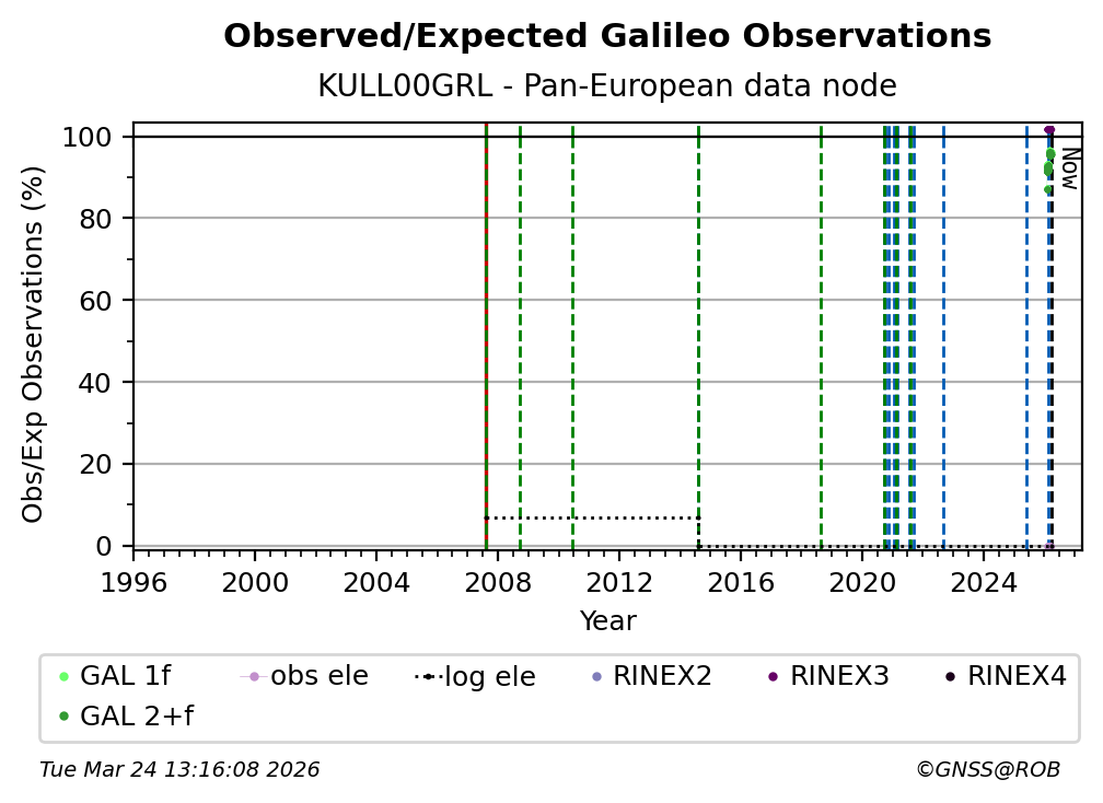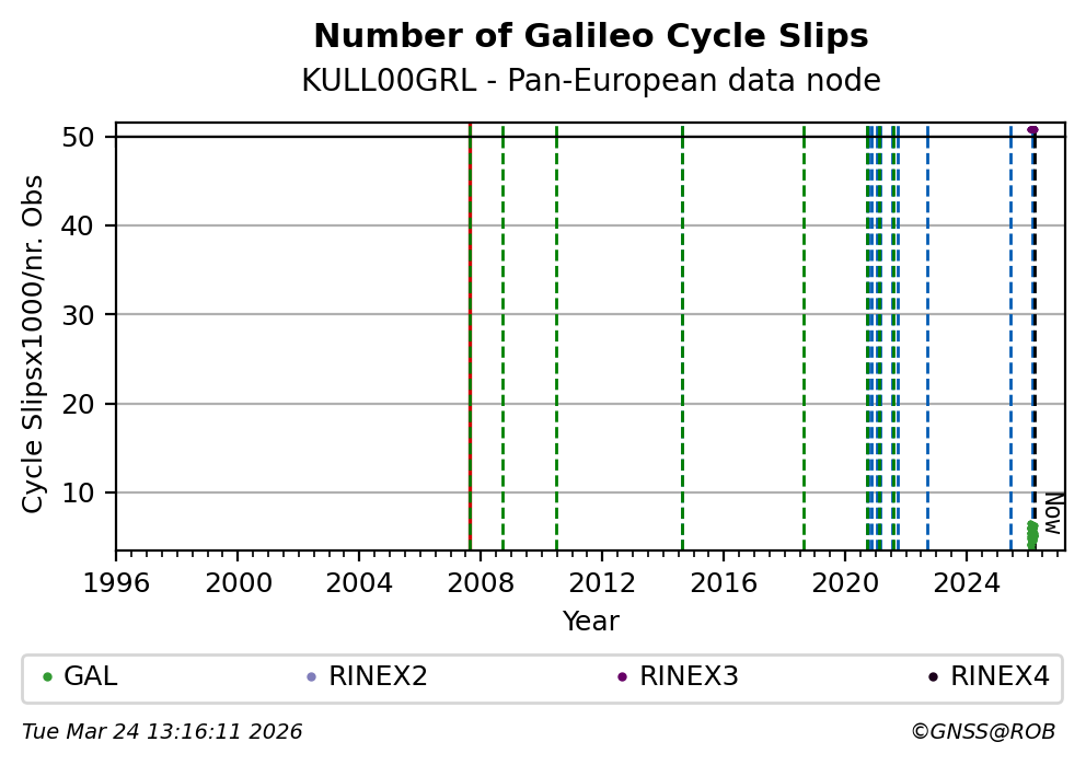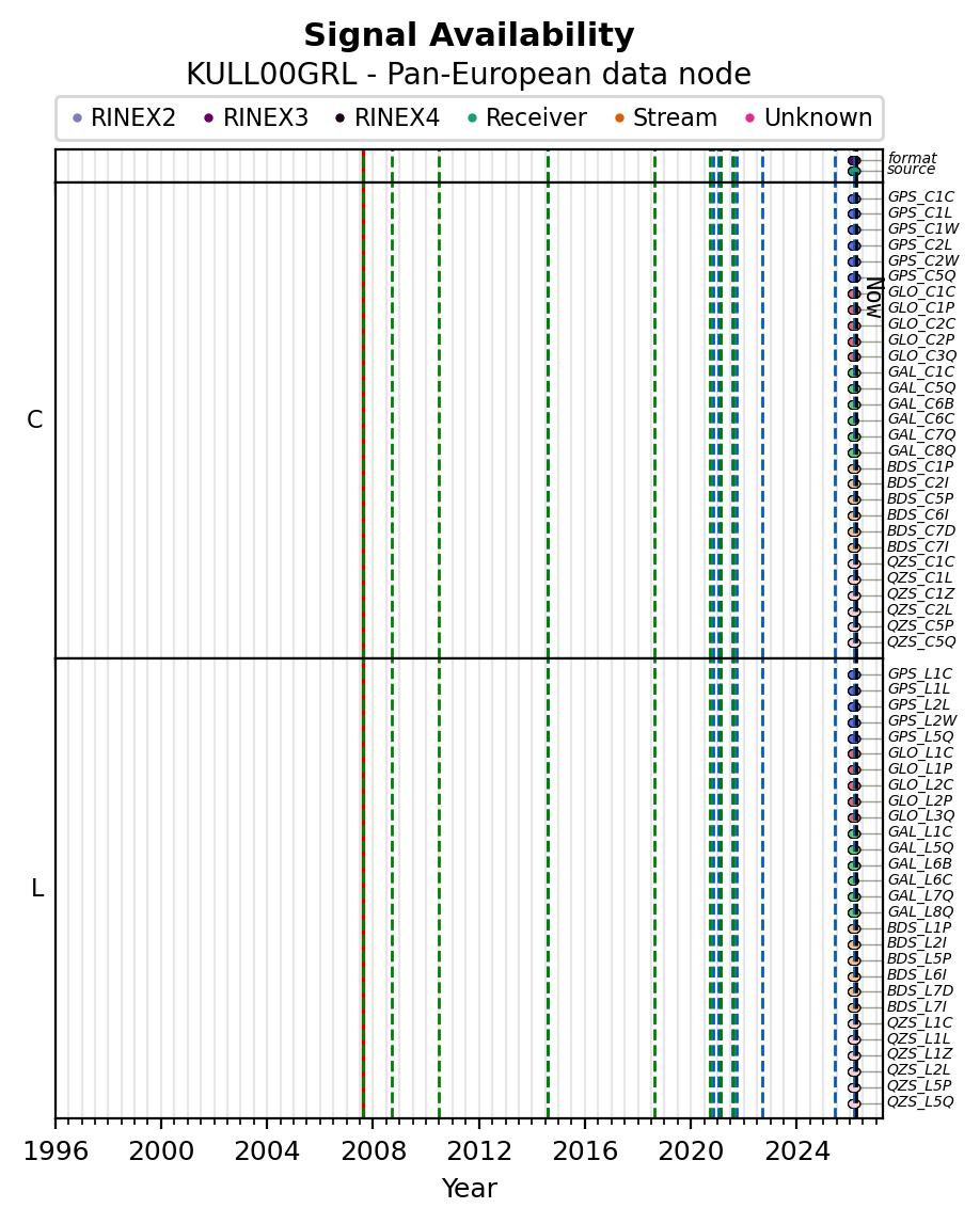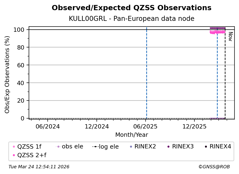 The plots below present the long-term tracking performance of the EPOS-GNSS station KULL00GRL based on the daily RINEX data available from the Pan-European EPOS-GNSS data node. The data quality metrics have been computed at the data node using the G-Nut/Anubis software.