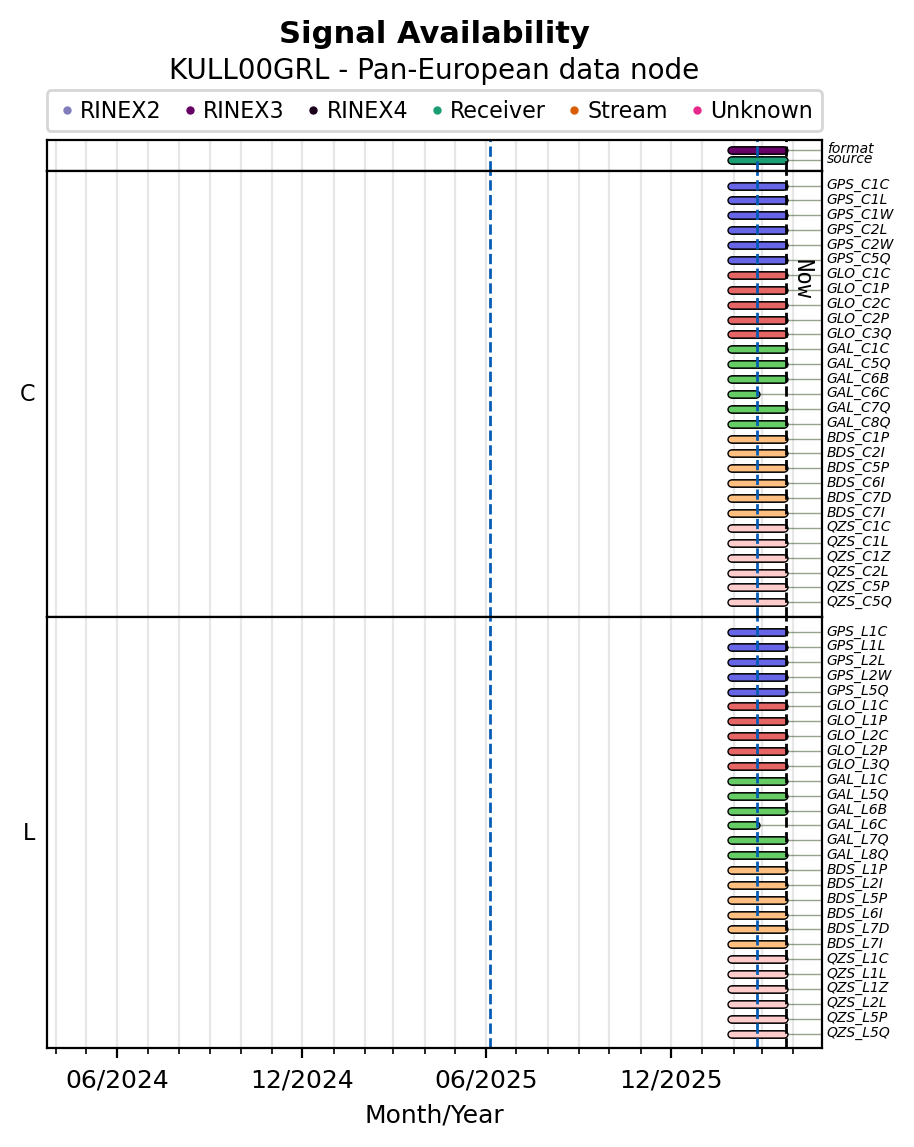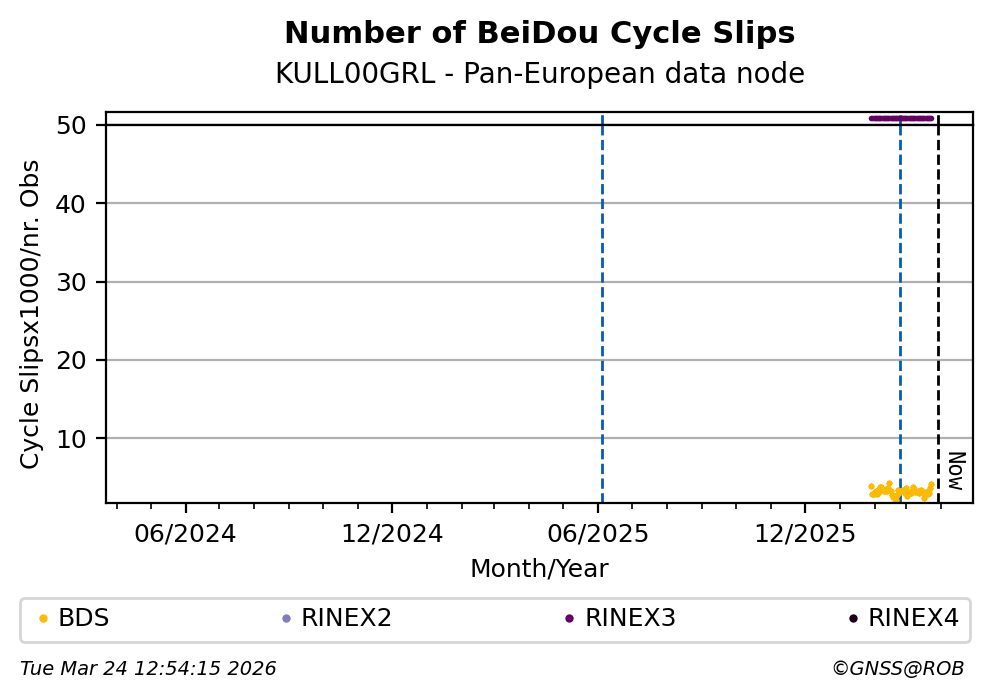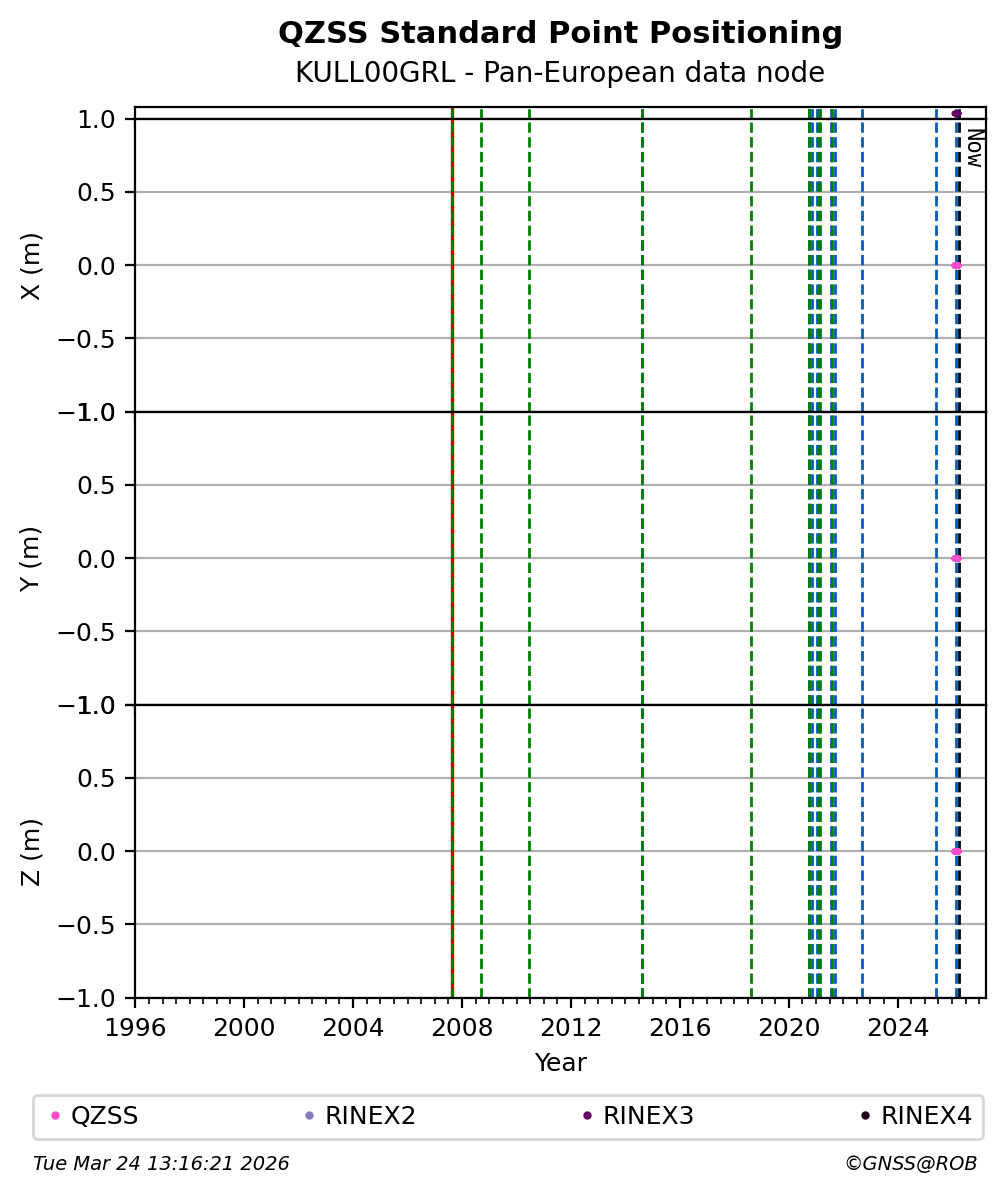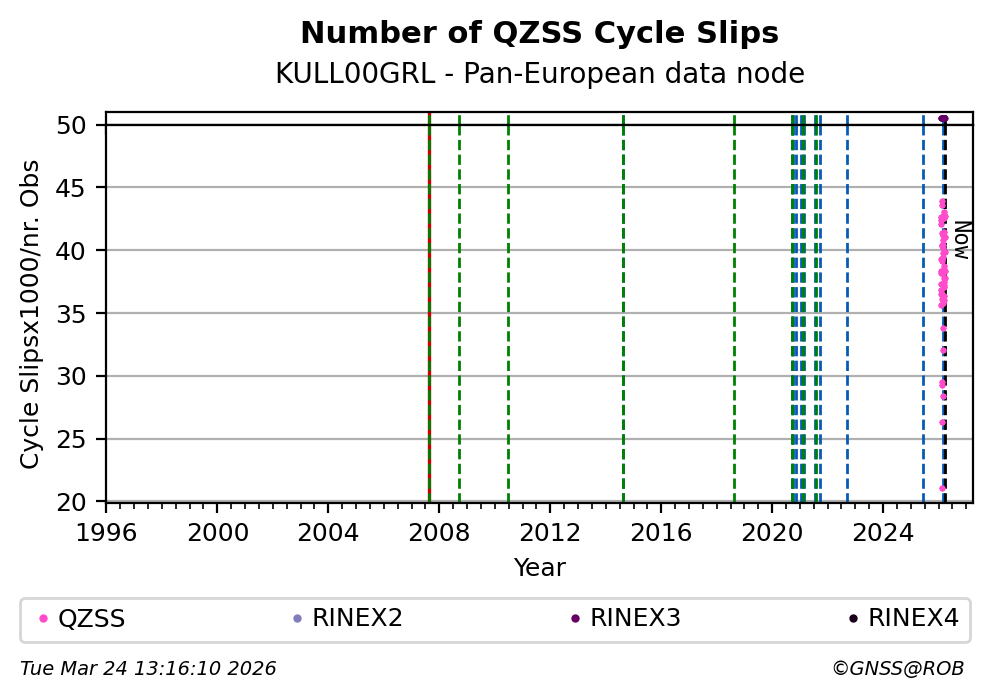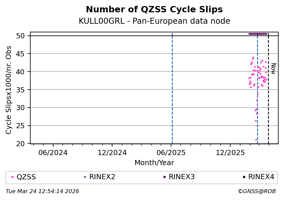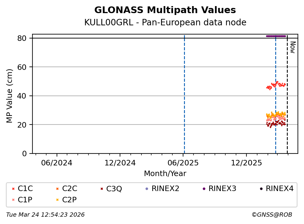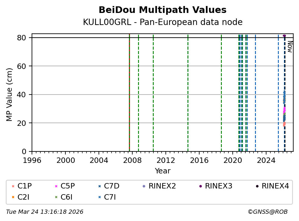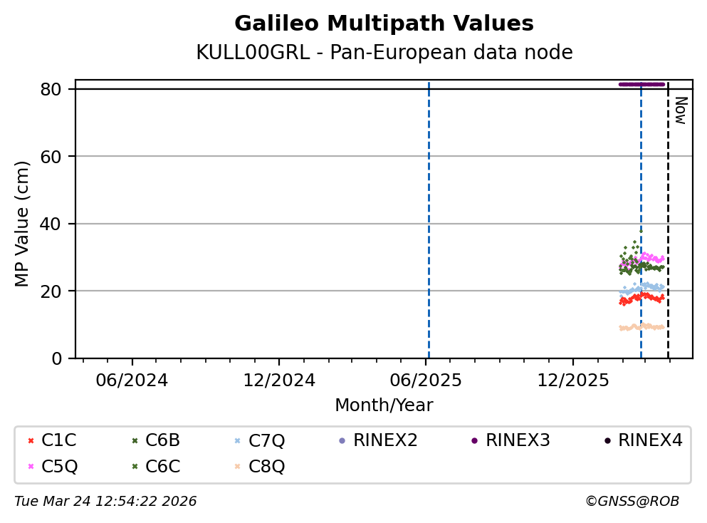 The plots below present the long-term tracking performance of the EPOS-GNSS station KULL00GRL based on the daily RINEX data available from the Pan-European EPOS-GNSS data node. The data quality metrics have been computed at the data node using the G-Nut/Anubis software.