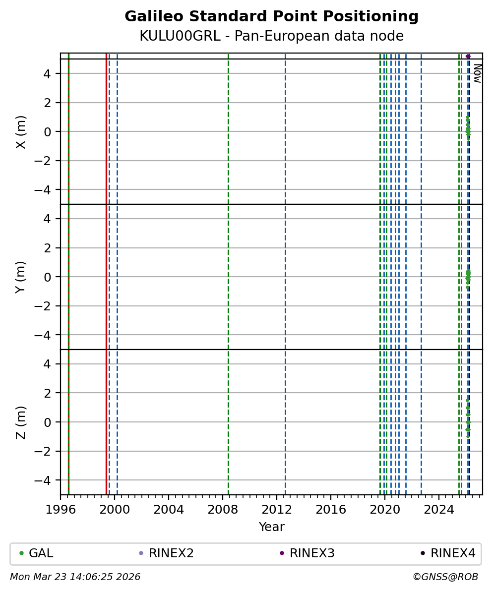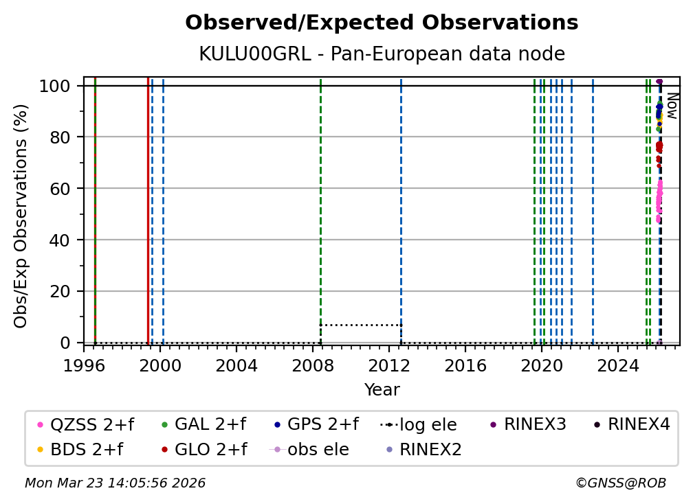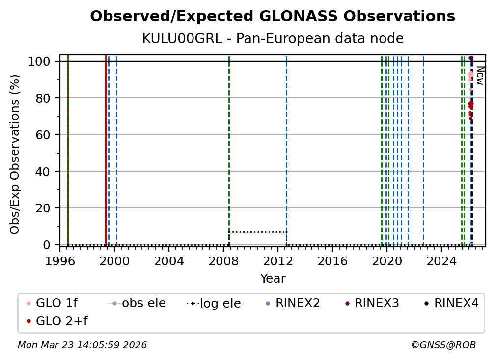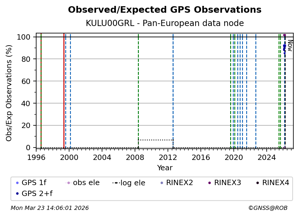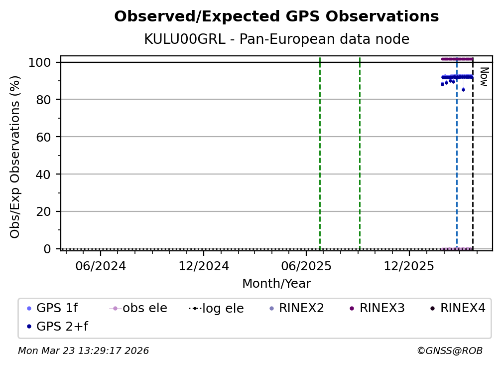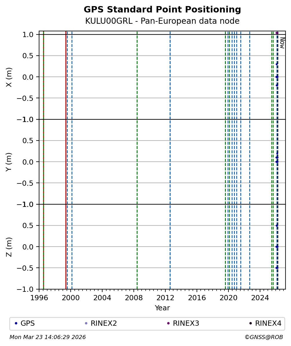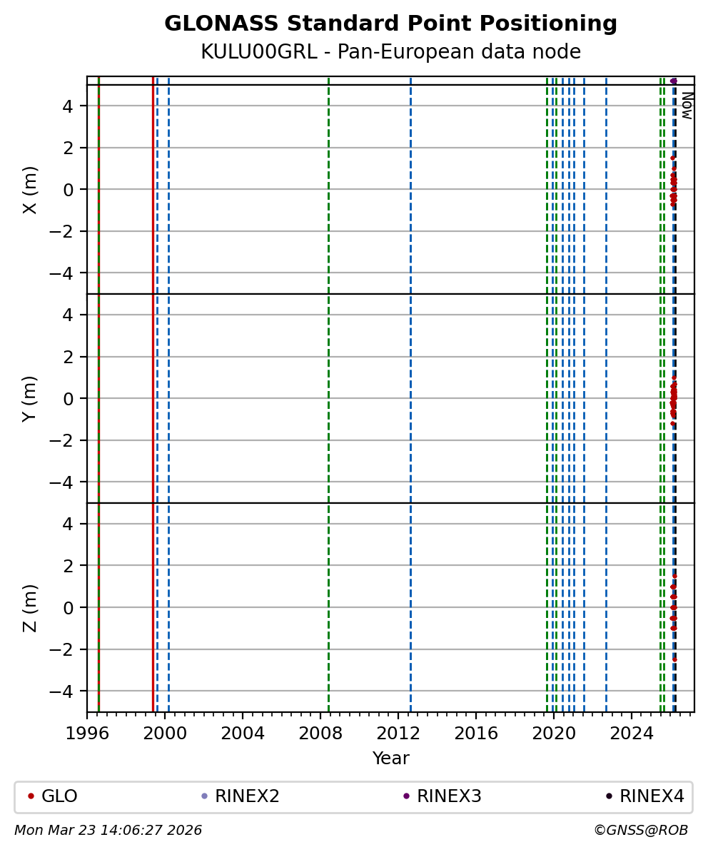 The plots below present the long-term tracking performance of the EPOS-GNSS station KULU00GRL based on the daily RINEX data available from the Pan-European EPOS-GNSS data node. The data quality metrics have been computed at the data node using the G-Nut/Anubis software.