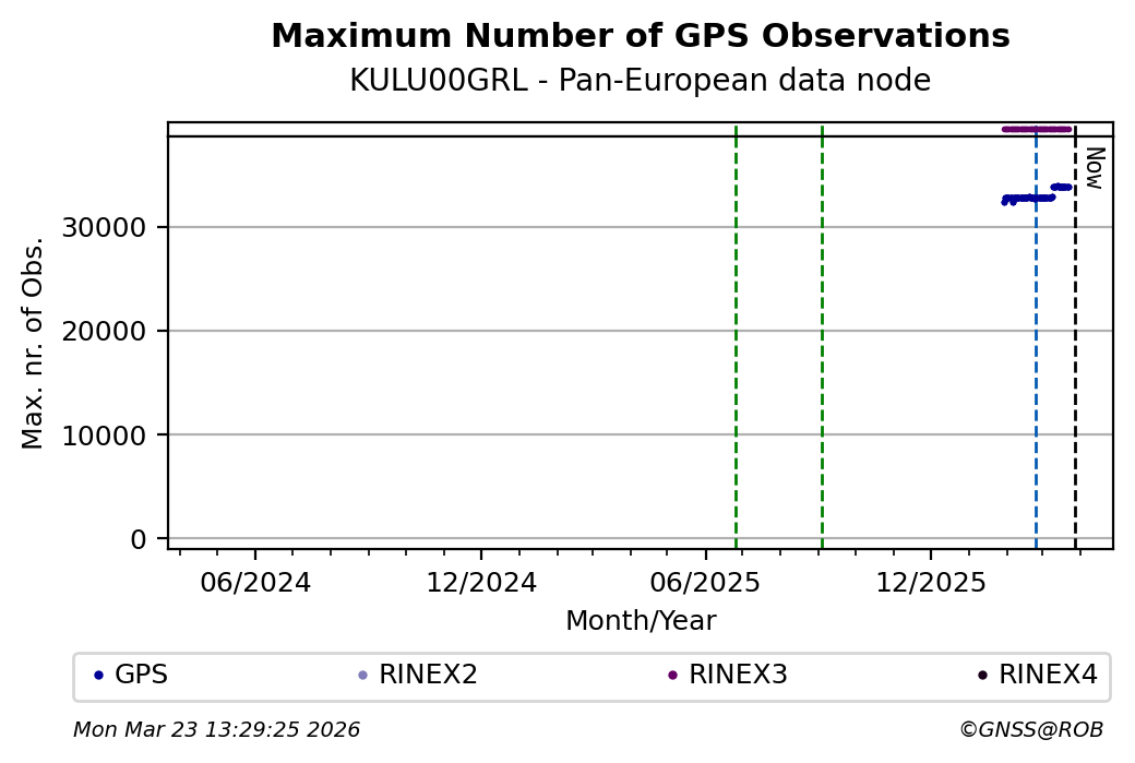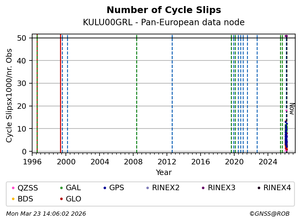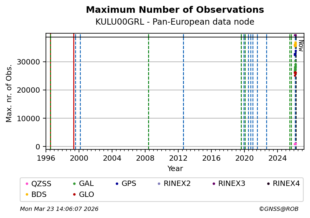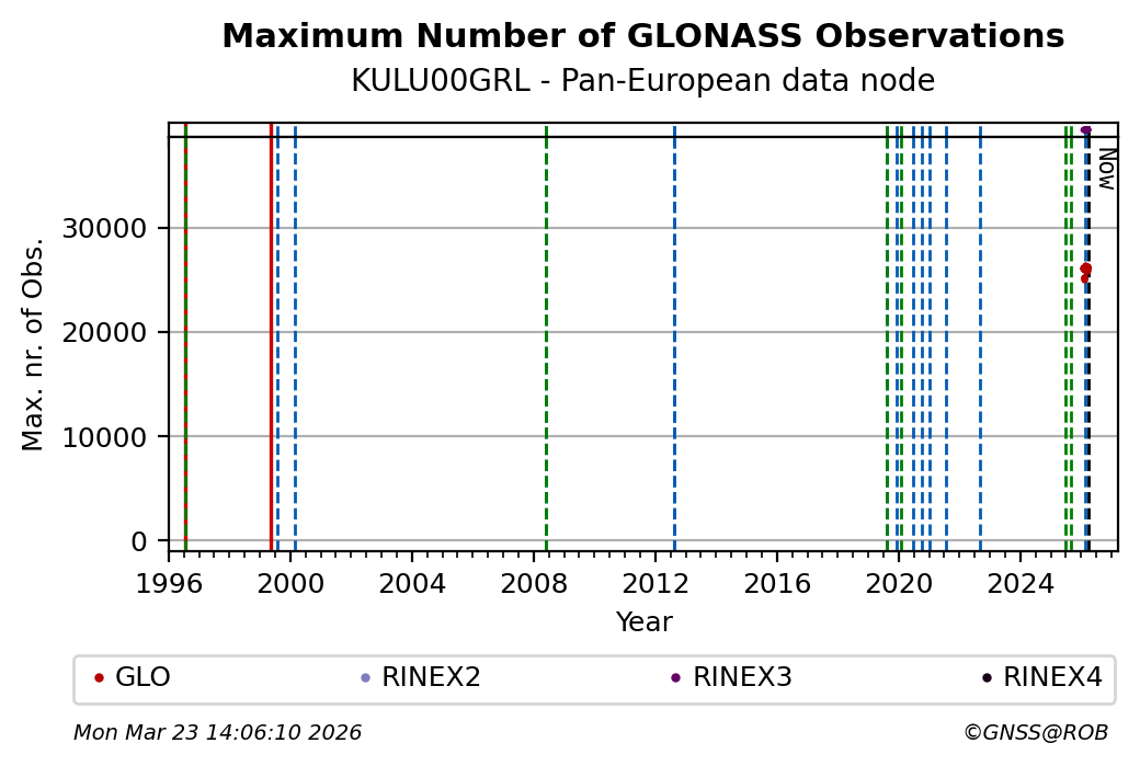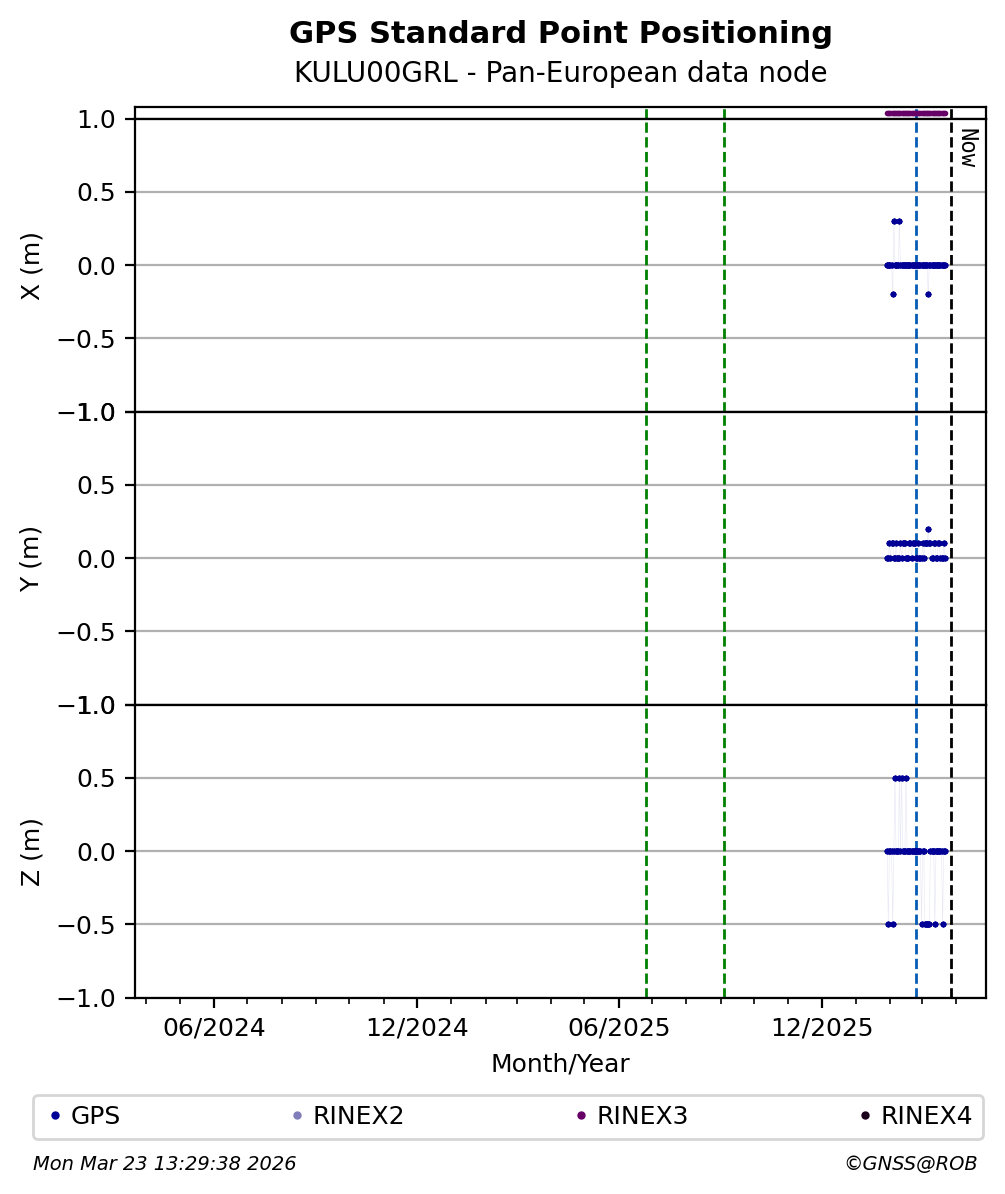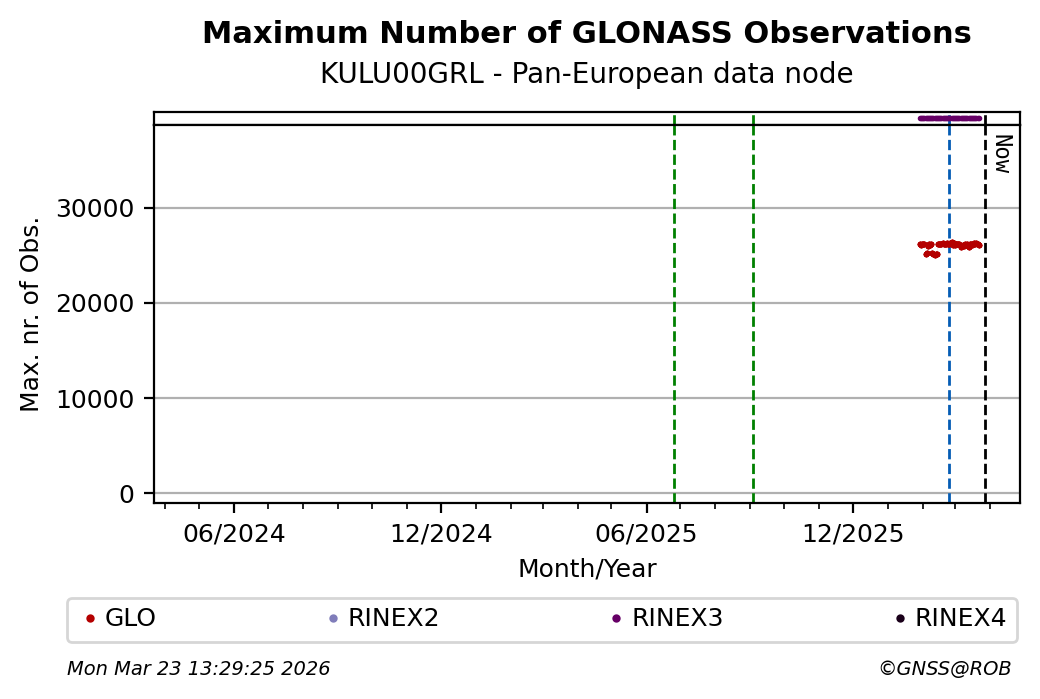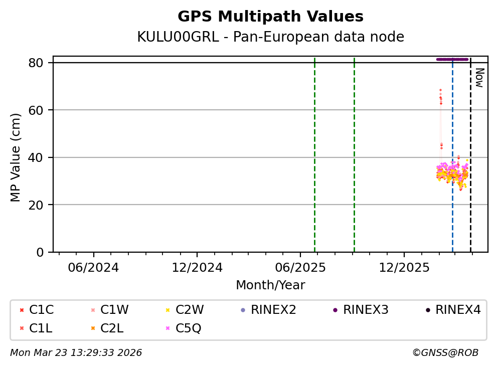 The plots below present the long-term tracking performance of the EPOS-GNSS station KULU00GRL based on the daily RINEX data available from the Pan-European EPOS-GNSS data node. The data quality metrics have been computed at the data node using the G-Nut/Anubis software.