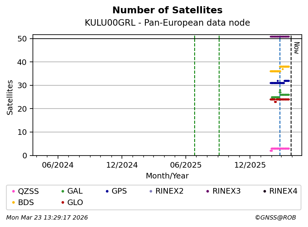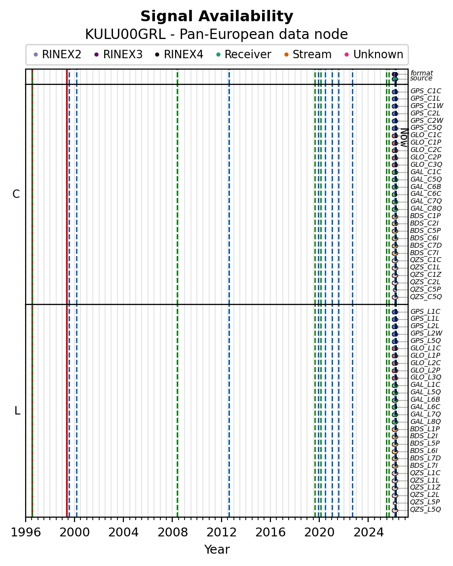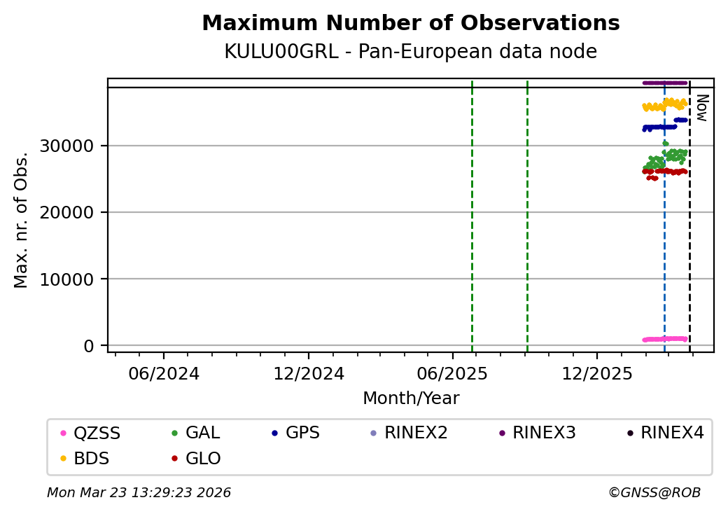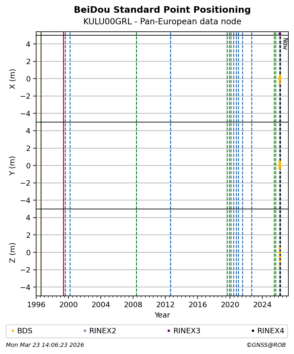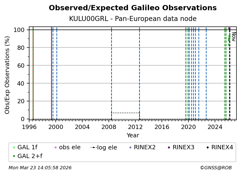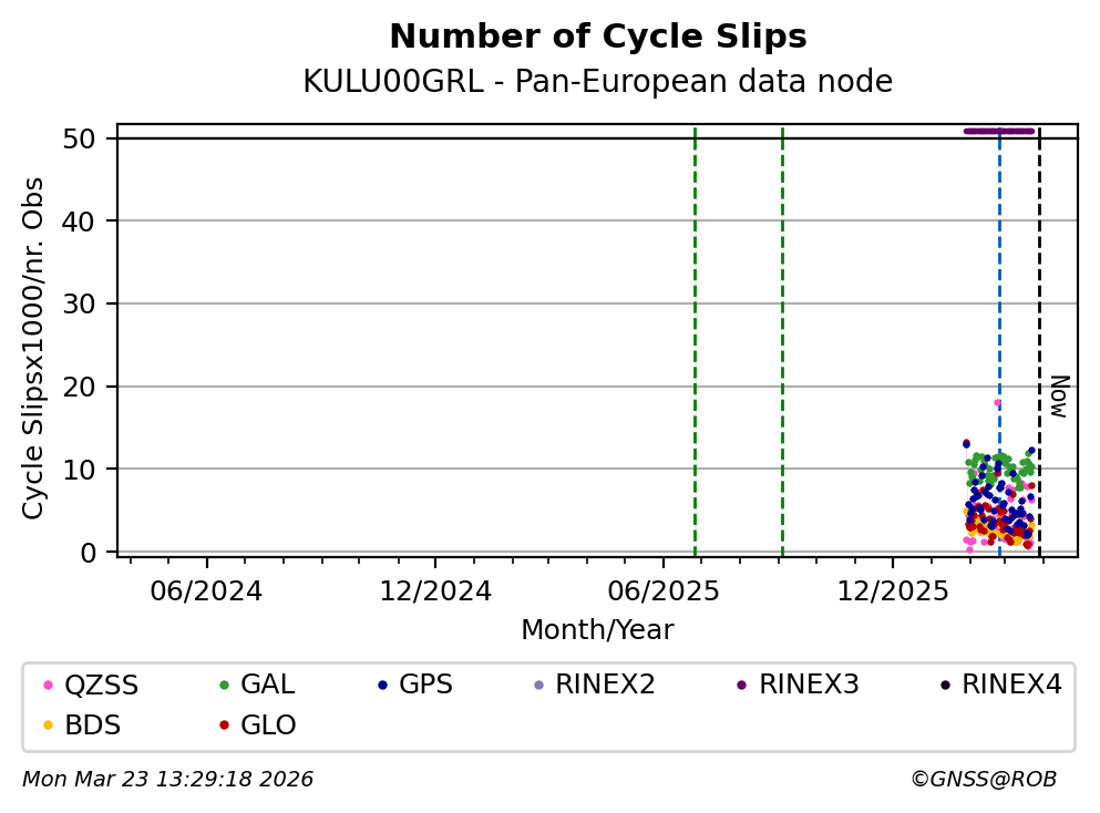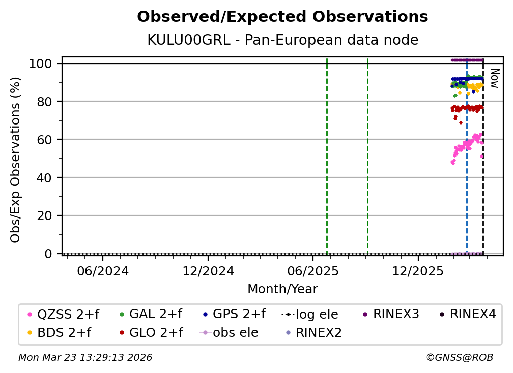 The plots below present the long-term tracking performance of the EPOS-GNSS station KULU00GRL based on the daily RINEX data available from the Pan-European EPOS-GNSS data node. The data quality metrics have been computed at the data node using the G-Nut/Anubis software.