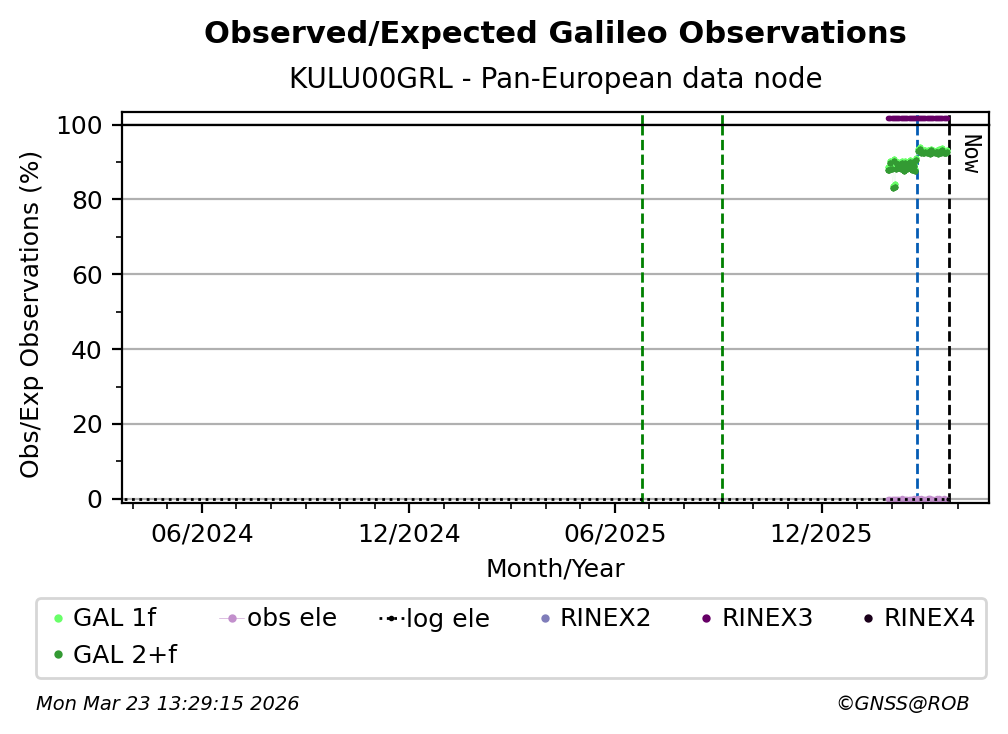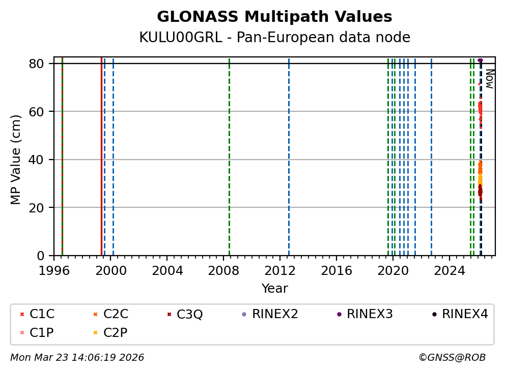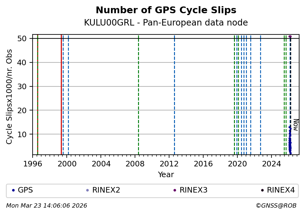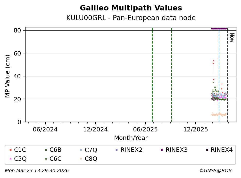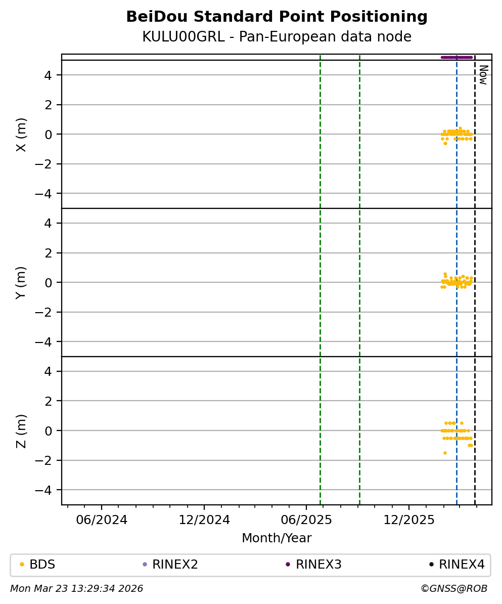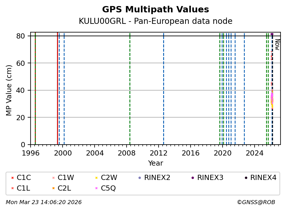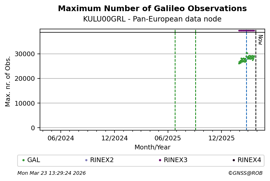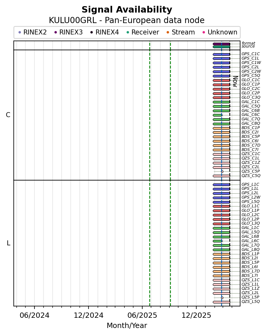 The plots below present the long-term tracking performance of the EPOS-GNSS station KULU00GRL based on the daily RINEX data available from the Pan-European EPOS-GNSS data node. The data quality metrics have been computed at the data node using the G-Nut/Anubis software.