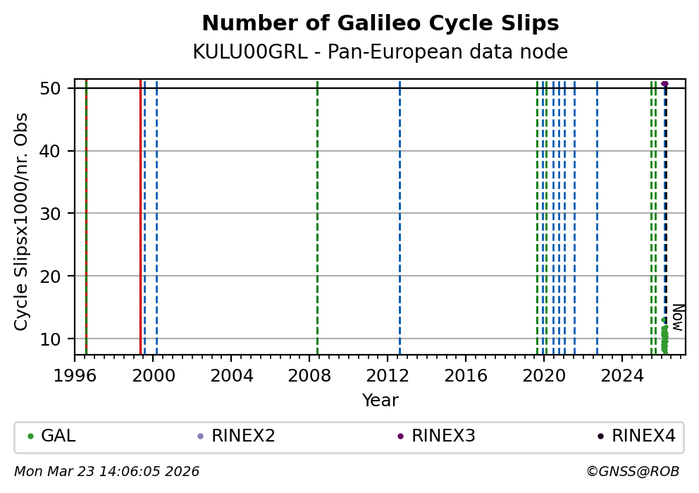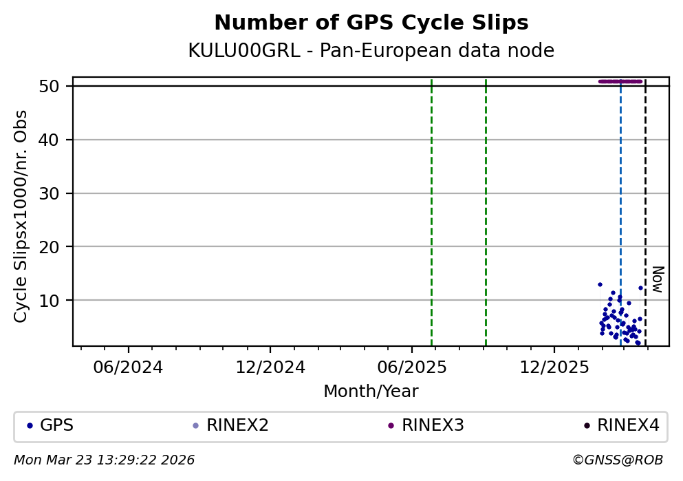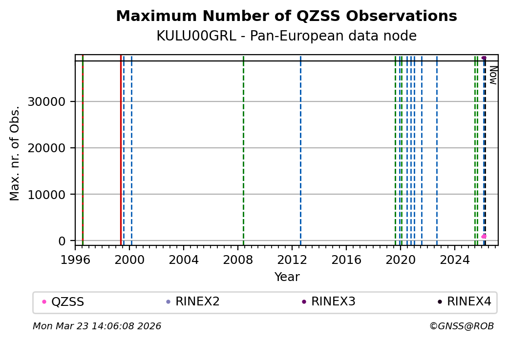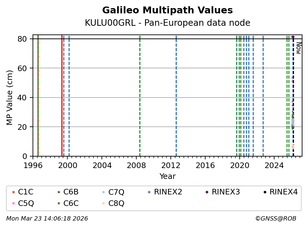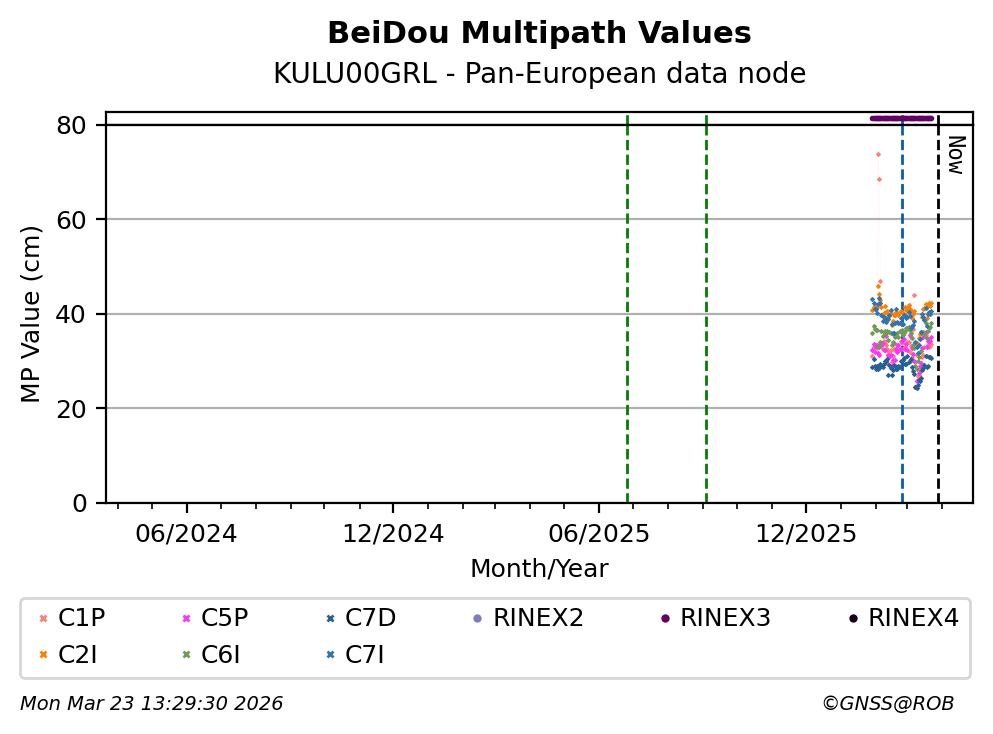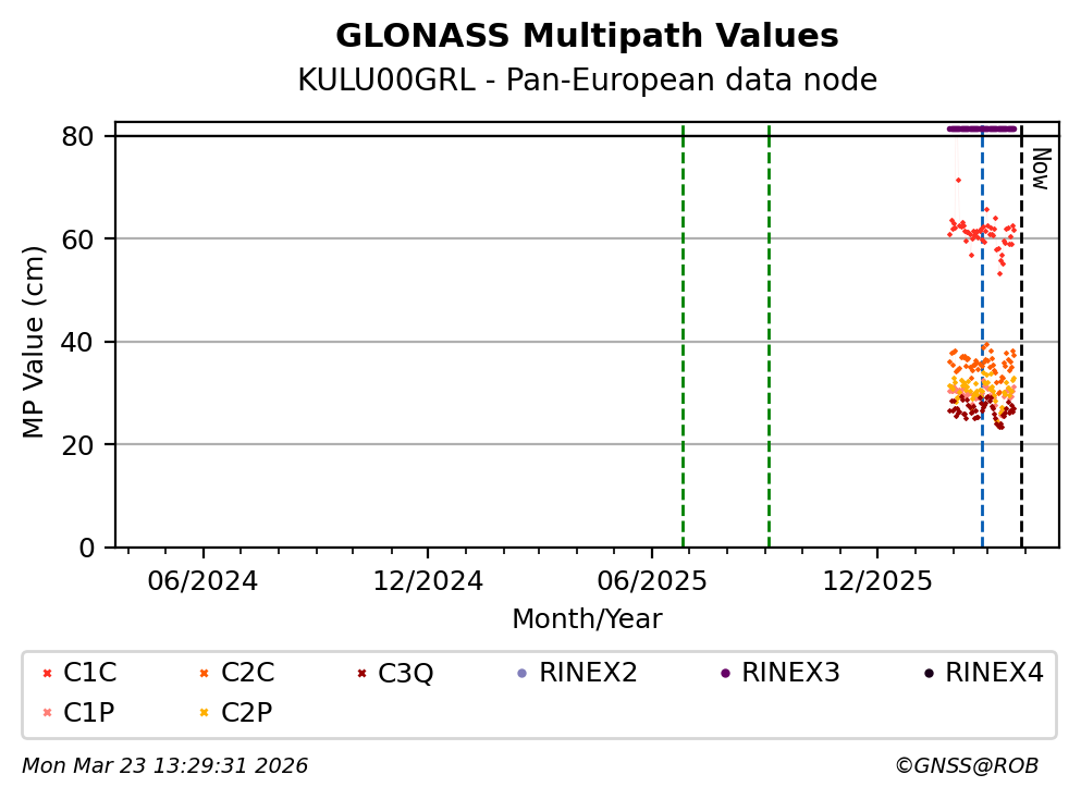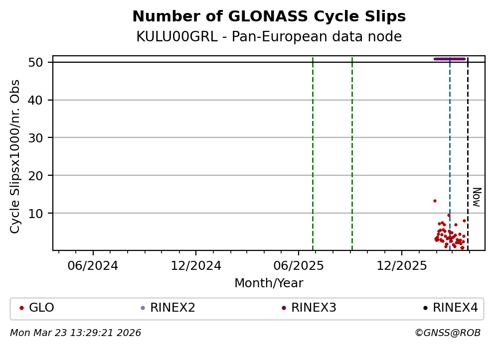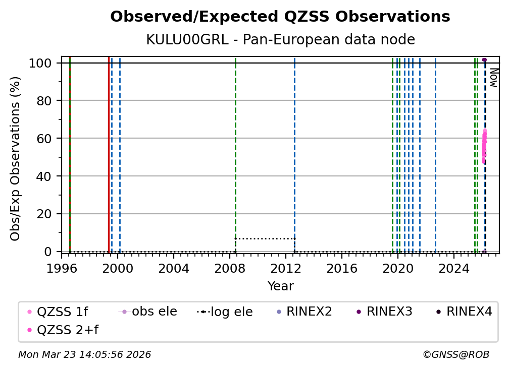 The plots below present the long-term tracking performance of the EPOS-GNSS station KULU00GRL based on the daily RINEX data available from the Pan-European EPOS-GNSS data node. The data quality metrics have been computed at the data node using the G-Nut/Anubis software.