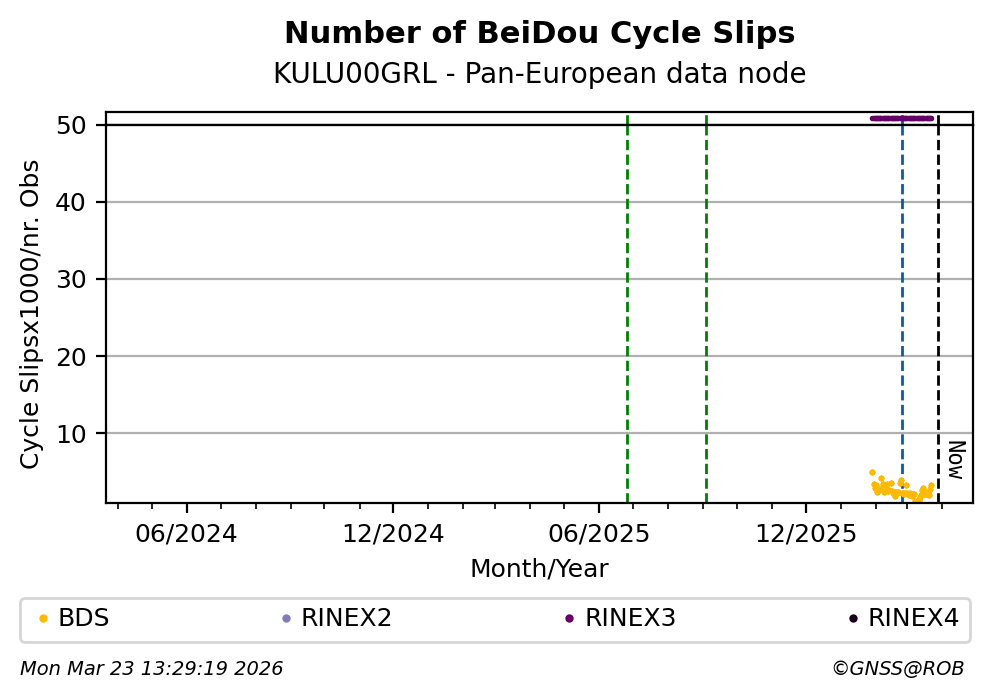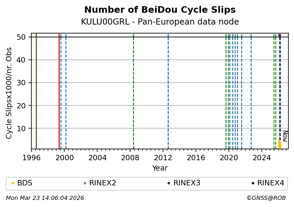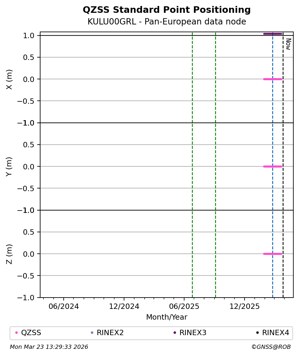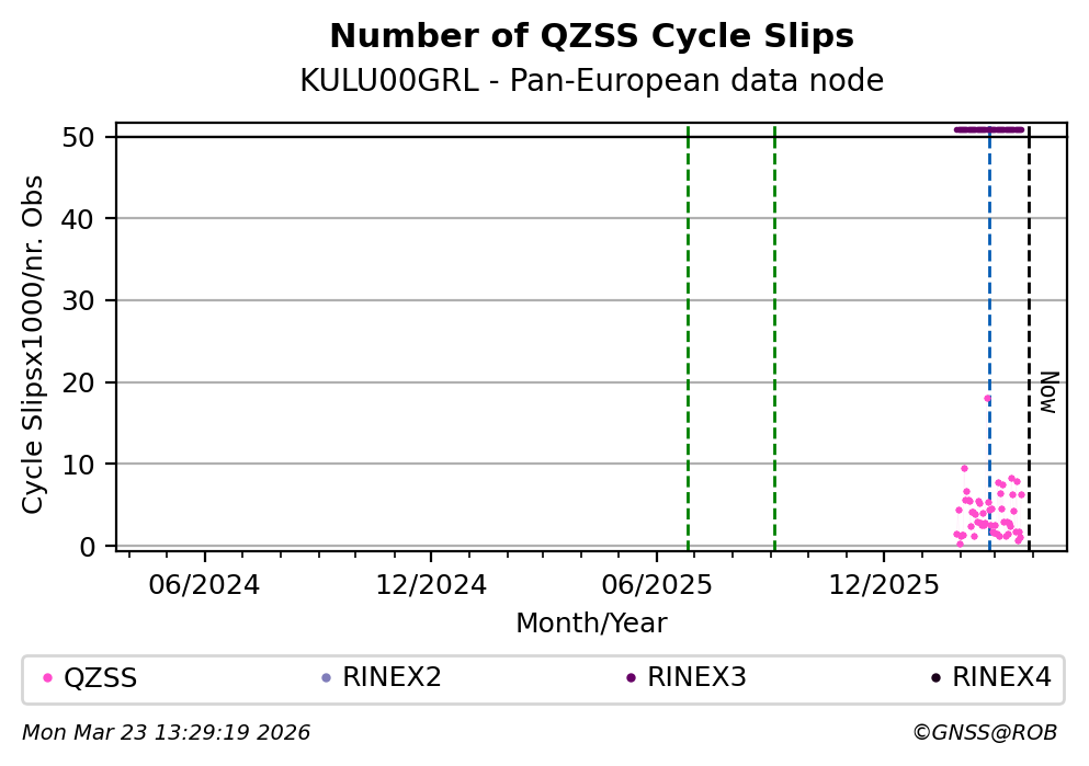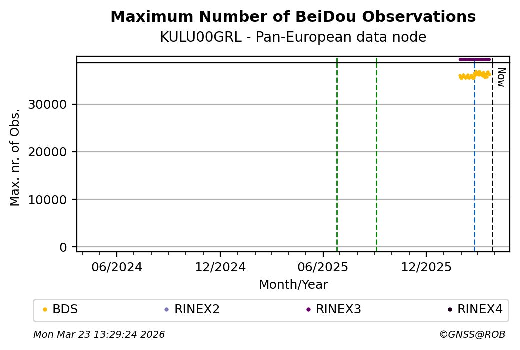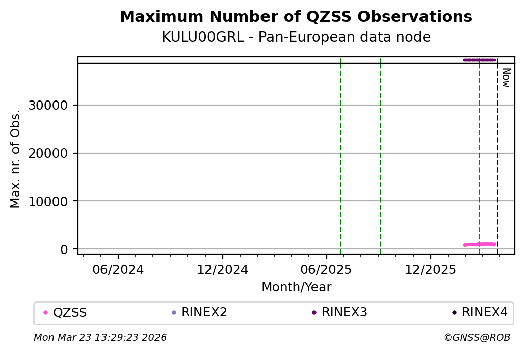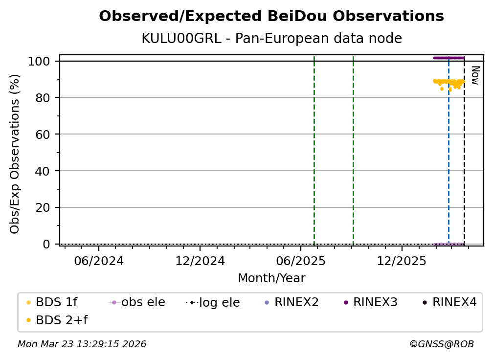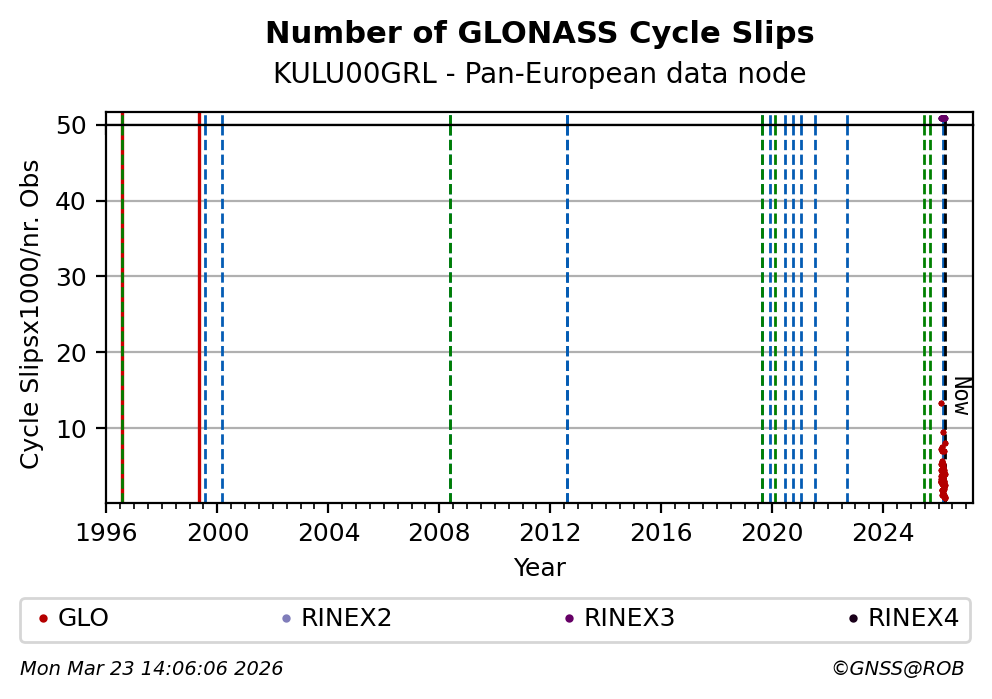 The plots below present the long-term tracking performance of the EPOS-GNSS station KULU00GRL based on the daily RINEX data available from the Pan-European EPOS-GNSS data node. The data quality metrics have been computed at the data node using the G-Nut/Anubis software.