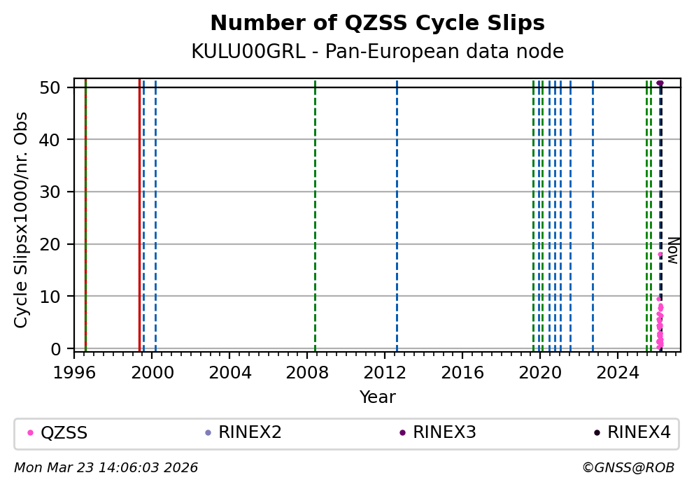 Red vertical lines, green and blue vertical dotted lines indicate respectively a change of antenna, receiver or receiver configuration (including firmware) as indicated by the station manager in the station site log available from the M3G GNSS Metadata Catalog. The purple points in the top of the plot indicate the daily RINEX data availability at the data node.